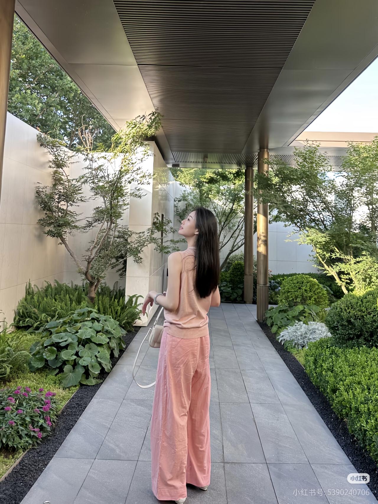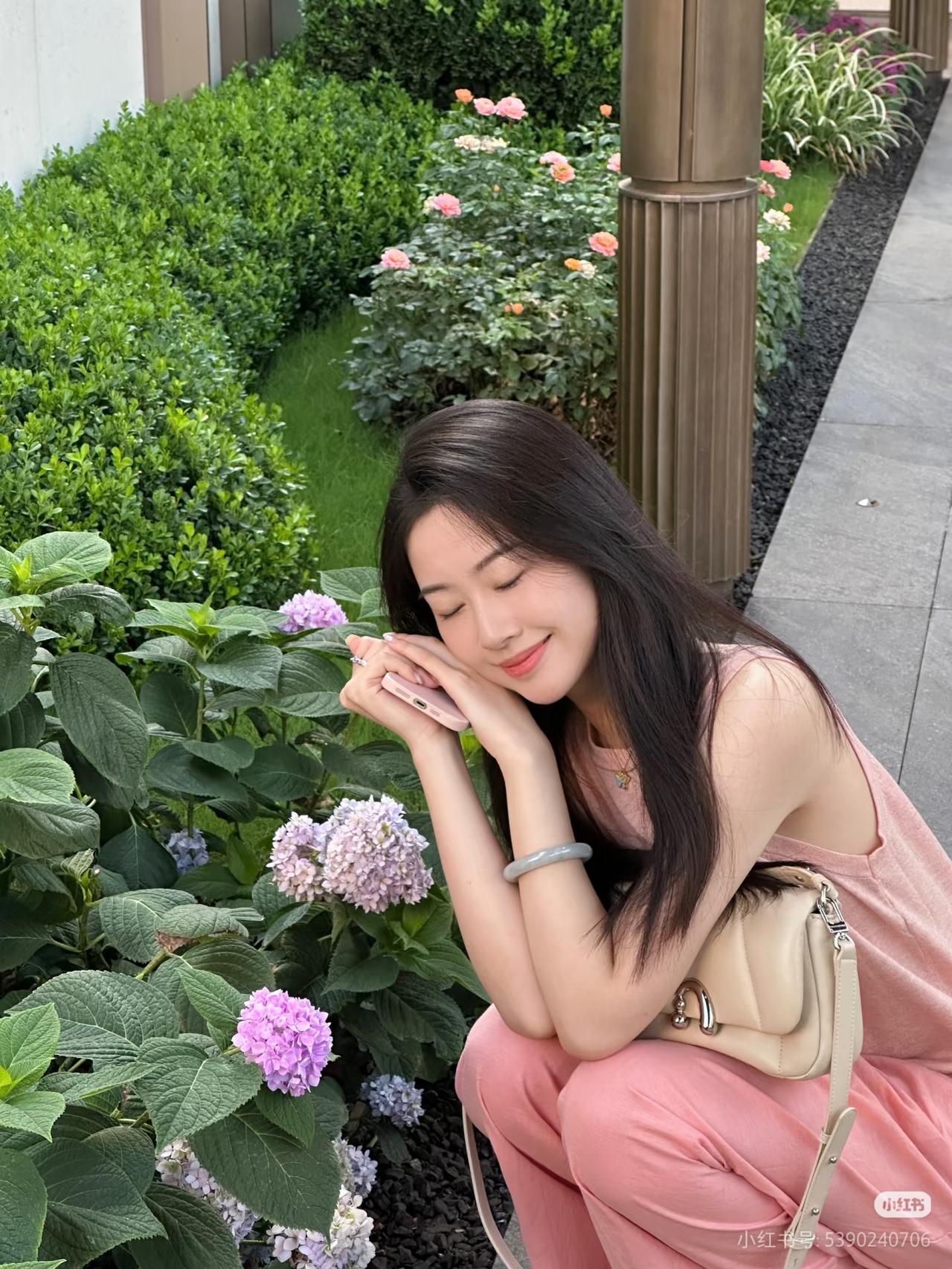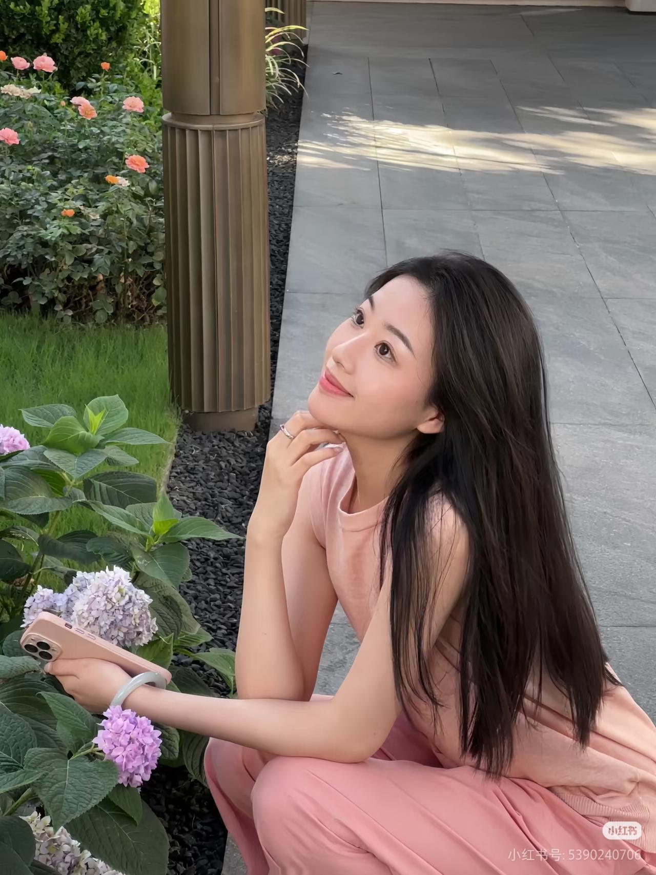 粉衣美人倚长凳,绿树芳菲映笑颜。