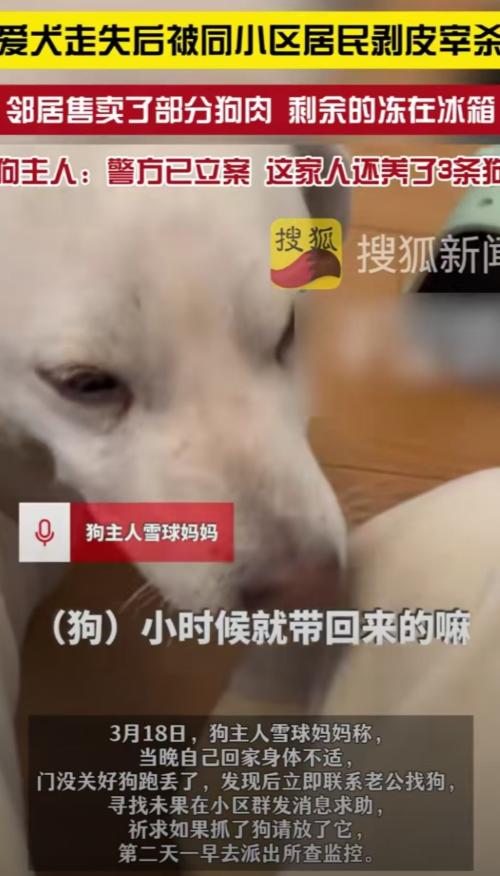 江苏昆山,女子没关好门,家里的狗跑了出去,结果被邻居老人剥了皮把肉卖了。女子和丈夫找到他家,邻居还不承认,邻居女儿的男朋友甚至摔了三个啤酒瓶威胁。更可气的是邻居全程没有道歉,反而一副你能把我怎么样的态度。 这件事说出来真的让人又气又难受,事情发生在江苏昆山,一个女业主那天身体不太舒服,回家的时候有点恍惚,门没关严。 就这么一个小疏忽,家里养了好几年的狗自己跑出去了,等她反应过来,狗已经不见了,她和丈夫一下就急坏了,在小区里来回找,见人就问,还在业主群里发消息,也去物业那边调监控,就想着赶紧把狗找回来。 找了很久一直没消息,后来有邻居提供了线索,再加上狗脖子上有蓝牙定位项圈,位置一直显示在同一个小区里一户人家,夫妻俩心里一下有了方向,马上跑过去敲门问。 可对方一开始死不承认,说自己根本没见过狗,语气还挺冷淡,夫妻俩心里其实已经很确定了,定位不会乱跑,狗肯定就在这里,于是就一直追问,希望对方说实话。 问来问去,对方终于扛不住了,直接说了实情:狗已经被他弄死了,皮也处理了,肉还卖掉了一部分,剩下的放在冰箱里。 这话一说出来,女主人当场就受不了了,整个人崩溃,那只狗陪了她很多年,平时吃住都在一起,早就不是普通宠物,而是家里的一员,结果就因为跑出去一会,就变成这样。 更让人心寒的是,这位老人说这些话的时候,一点愧疚都没有,也没打算道歉,好像这件事在他看来没什么大不了的,完全没考虑过别人会有多难过。 夫妻俩听完肯定又气又伤心,忍不住和对方理论,想要个说法,可事情不但没解决,反而更糟,对方家里一个年轻人突然冲出来,情绪特别激动,直接把啤酒瓶往地上砸,连砸了好几个,用这种方式吓人,摆明了是不想让他们继续追究。 本来是受害的一方,上门讨个说法,结果还被这样威胁,谁遇到都会觉得憋屈又害怕。 其实这件事最让人难以接受的地方就在于,这只狗是有项圈的,一看就知道是别人家养的,不是什么没人管的流浪狗。 正常人看到这种情况,最起码会想办法问问是谁家的,或者在小区里打听一下,可这位老人连问都没问,直接就把狗杀了,还拿去卖钱,这种做法确实太过分了。 而且事情被发现之后,不但没有一点歉意,也没有要赔偿的意思,还让家里人出来恐吓别人,这种态度才是让大家最愤怒的地方。 事情传到网上之后,很多人都看不下去,尤其是养宠物的人,更是觉得特别难受,大家普遍觉得,这已经不是简单的邻里矛盾,而是对生命的漠视,也是对别人感情的完全不尊重。 现在当地警方已经介入调查,这件事也在处理中。之前双方也尝试过调解,但没谈拢,狗主人现在的想法也很简单,就是希望能有个公正的结果,让对方为自己的行为承担责任。 这件事也算是给很多养宠物的人提了个醒,平时进出门一定要多留心,门窗关好,别让宠物有机会自己跑出去,外面的风险确实不好预料。 同时也希望大家在生活中多一点善意,如果遇到走失的宠物,尽量帮忙找主人,而不是去伤害它。 说到底,不管是人还是动物,都是一条命。做人做事起码要有点底线,别因为一时的自私或者贪念,做出让人无法接受的事情。 对此你怎么看? 信源:红星新闻