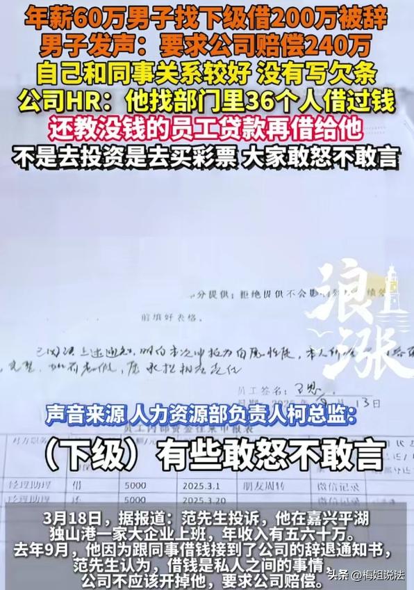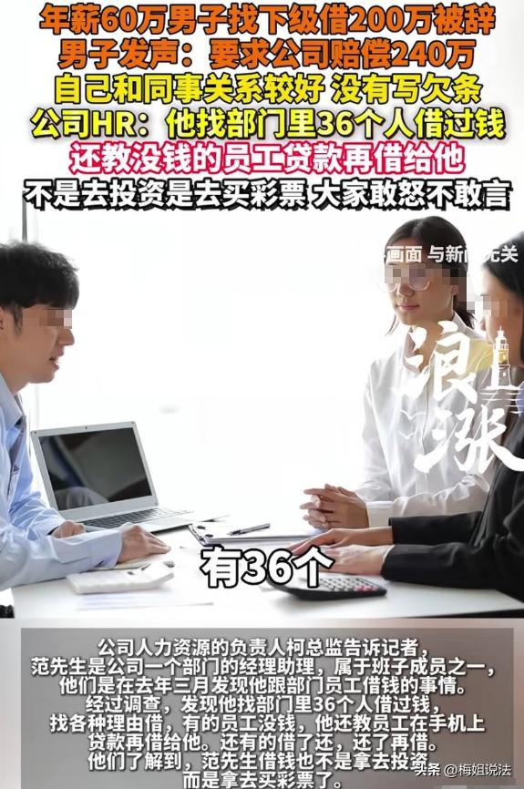 浙江嘉兴,范先生当部门经理助理,年薪五六十万却沉迷彩票。钱不够就向同事借,还撺掇没钱同事贷款借他,36个同事被借,累计200多万。公司发现后以违反制度将其辞退,他不服投诉索赔240万。 范先生,在嘉兴一家公司当部门经理助理,这职位听着就挺风光,年薪五六十万,在当地那也是高收入人群。 他刚入职那会,工作积极,同事关系也处得不错,大家都觉得他前途无量。 可范先生不知何时迷上了买彩票,一开始,他也就是偶尔买几张,就当是碰碰运气。 可这彩票就像个无底洞,一旦陷进去就很难自拔。 慢慢地,他买彩票的频率越来越高,投入的钱也越来越多。 每个月工资刚发下来,还没捂热乎,就全填进了彩票这个窟窿里。 工资不够花,他就打起了亲戚朋友的主意。 今天找这个借点,明天找那个要点,亲戚朋友都被他借了个遍。 可这彩票就像个填不满的坑,亲戚朋友那点钱根本不够他折腾的。 从去年3月开始,范先生把目光投向了同事,他仗着自己是部门经理助理的身份,找各种理由向同事借钱。 有的同事碍于情面,怕不借给他会影响工作关系,就硬着头皮借了。 还有的同事,心里虽然不情愿,但怕被他穿小鞋,也只能乖乖掏钱。 这还不算完,范先生见有的同事实在没钱,竟然撺掇他们去贷款,然后再把钱借给自己。 范先生跟那些同事说,自己只是暂时周转一下,很快就会还钱,还承诺给高额利息。 那些同事被他说得晕头转向,有的竟然真的去贷款借给了他。 整个部门有60多人,被他借过钱的竟然多达36人,累计借款金额高达200多万。 这些钱,有的同事是拿出了自己的积蓄,有的同事是背上了沉重的债务。 大家一开始都没声张,想着范先生能尽快还钱。 可范先生根本没有还钱的意思,同事们开始着急了,纷纷找他催债。 可范先生总是找各种借口拖延,今天说资金周转不开,明天说彩票中奖了就还。 同事们越催越急,范先生却越来越不耐烦,甚至还对一些催债比较急的同事恶语相向。 去年9月,公司察觉到了部门里的异常氛围。 经过一番调查,终于发现了范先生借钱的事情。 公司领导觉得范先生的行为严重破坏了公司的风气,违反了公司的规章制度,经过研究决定,将他辞退。 范先生得知自己被辞退后,他觉得借钱是自己的私事,跟公司没关系,公司没有权利辞退他。 于是,范先生向相关部门投诉,要求公司赔偿他240万。 这事,同事们也都觉得范先生太过分了,自己欠了一屁股债,还想着索赔。 公司则坚持自己的立场,认为范先生的行为已经严重影响了公司的正常运营,辞退他是合理的。 这事闹到这个地步,大家心里肯定都有疑问,公司辞退范先生到底合不合法呢?范先生索赔240万又有没有依据呢? 从法律角度来看,根据《劳动合同法》第三十九条,劳动者严重违反用人单位的规章制度的,用人单位可以解除劳动合同。 范先生在公司里,利用自己的职位便利,向众多同事借钱,甚至撺掇同事贷款借钱,这种行为严重影响了公司的正常工作秩序和团队氛围,违反了公司的规章制度。 公司以此为由辞退他,是符合法律规定的。 而范先生索赔240万,这完全是没有法律依据的。 范先生因为自己的过错被公司辞退,不存在公司违法解除劳动合同的情况,所以公司不需要向他支付赔偿金。 范先生这种无理的索赔要求,是不会得到法律支持的。 像范先生这样因为个人不良嗜好而陷入困境,甚至影响工作和他人的情况并不少见。 有些人沉迷赌博、炒股等,不仅把自己的积蓄赔光,还四处借钱,最后弄得家庭破裂,工作也丢了。 一定要理性对待自己的兴趣爱好,不能让它们影响到正常的生活和工作。 对于公司来说,建立健全的规章制度非常重要。当员工出现违反规章制度的行为时,要及时进行处理,维护公司的正常运营秩序。 对于个人来说,在借钱给他人时,一定要谨慎考虑,了解对方的还款能力和信用情况,避免给自己带来不必要的损失。 对此,大家都怎么看呢,范先生这种行为是不是太不负责任了,如果是你遇到同事找你贷款借钱,你会怎么做呢,一起来讨论一下吧!