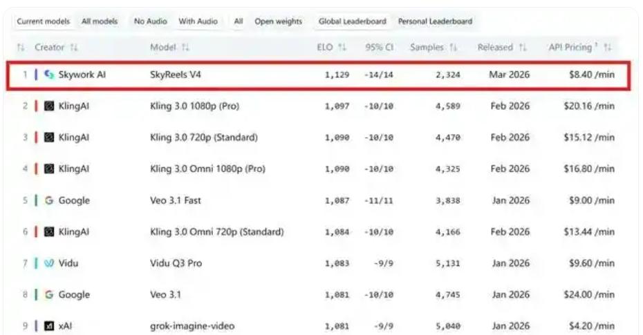 🎬 全球视频模型新王诞生!昆仑万维SkyReels-V4登顶全球第一 国产AI又搞了个大新闻!3月19日,昆仑万维旗下的天工AI大模型SkyReels V4,在权威榜单Artificial Analysis的“文生视频(含音频)”赛道中,一举超越谷歌Veo 3.1、OpenAI Sora 2、可灵3.0等全球顶尖高手,拿下全球第一!这标志着中国AI视频生成技术正式实现世界级引领。 这次夺冠可不是靠运气,SkyReels V4有两大“杀手锏”: 音画同步超精准:采用双流架构,专门解决视频和声音对不上的老难题,生成的视频口型、动作与声音完美匹配。 智商情商双在线:引入全模态强化学习,让模型学会了逻辑推理。不仅能生成1080p高清、15秒长的商用级视频,还能理解复杂指令。 更厉害的是,它新增了关键帧参考和网格图参考功能。简单说,你想拍短剧,只需上传几张剧情草图或关键画面,它就能自动补全中间过程,保证角色长相不变、场景不跳跃,彻底治好“角色走形”的行业痛点。 目前,SkyReels V4已正式开放API接口,无论是做电影特效、短视频创作,还是广告制作,开发者都能直接调用这套全球最强的视频生成能力。昆仑万维表示,要让这项技术嵌入每一个有需求的场景,赋能全行业。 从追赶到领跑,中国AI正在用实力说话。未来,每个人都可能成为自己的“导演”,你期待吗?