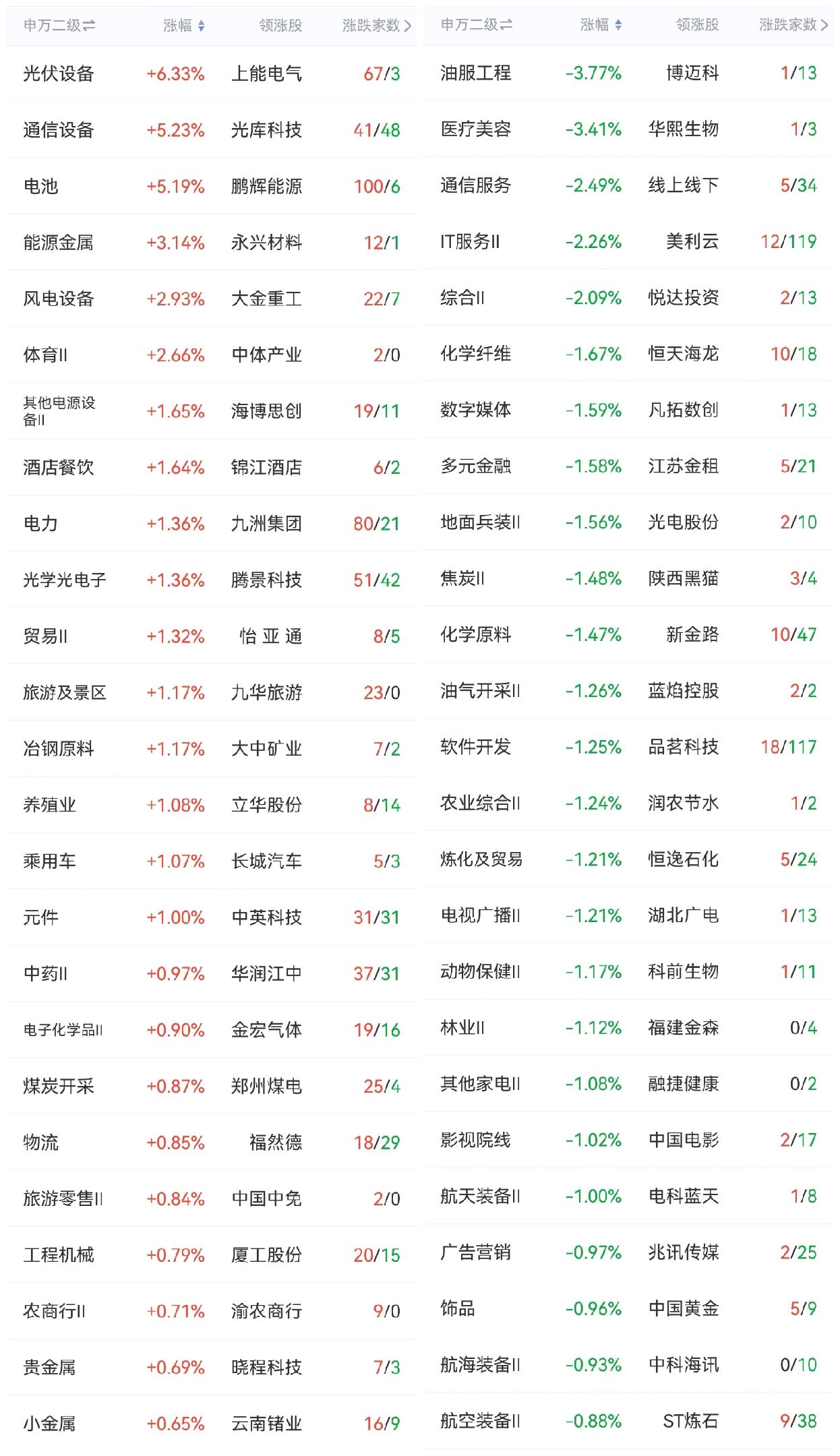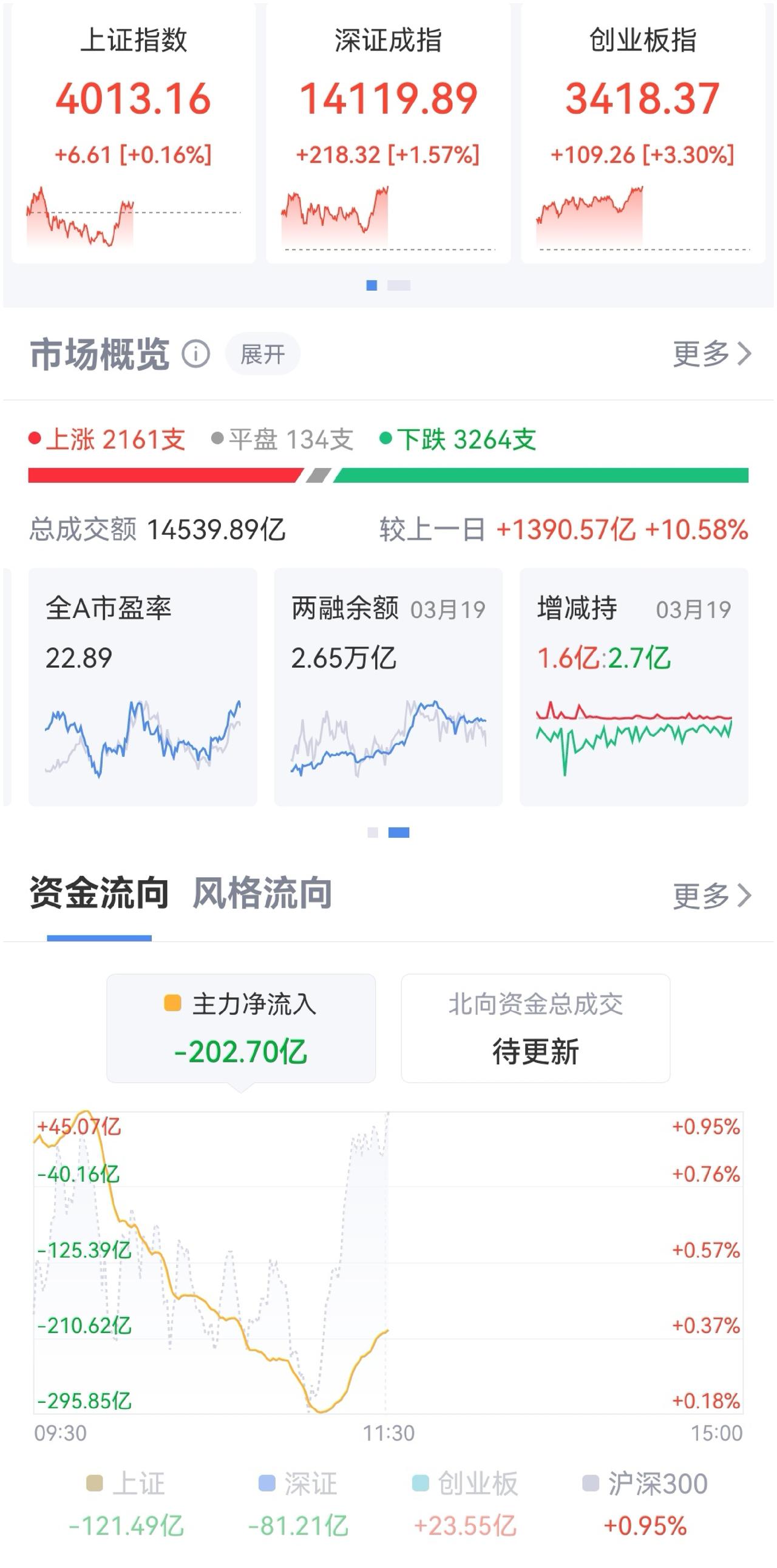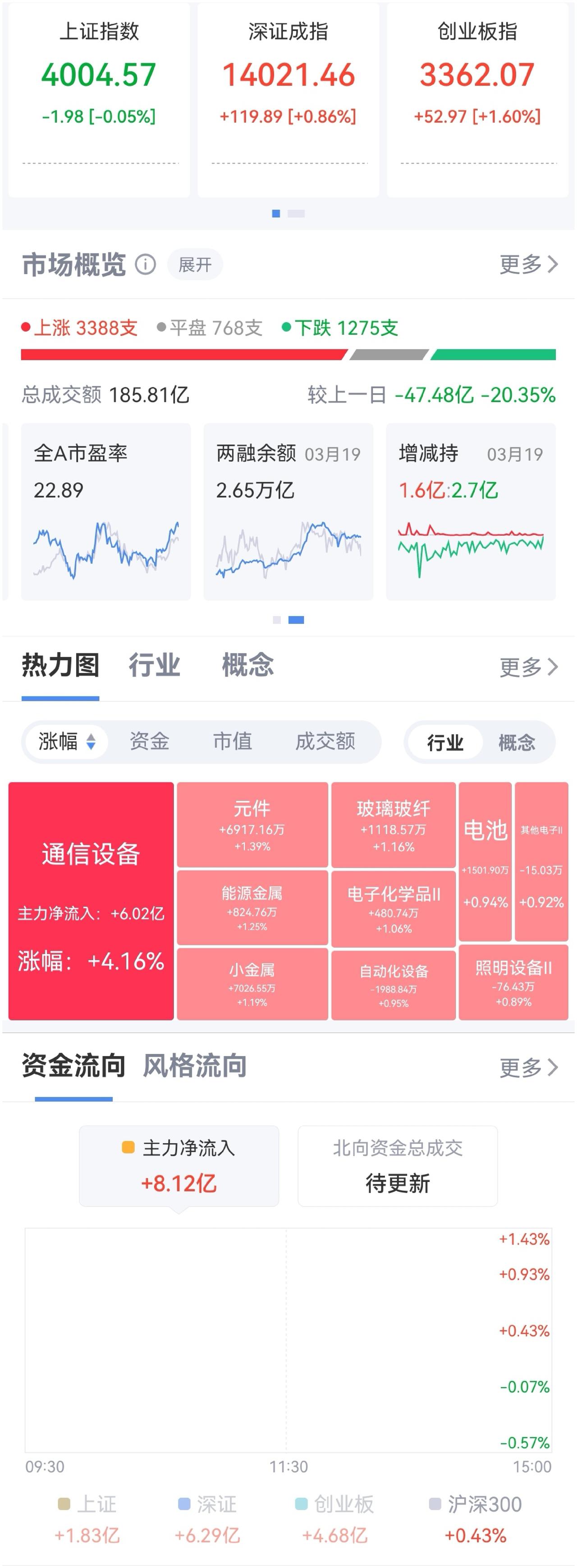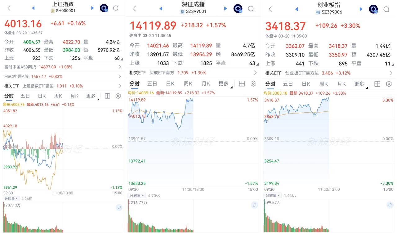 午盘印象(3月20日) CPO电池暴走 探底回升 外围:战事变幻 美股震荡 科技调整居多 内股:情绪交易 CPO电池光伏撑起指数 一、三大股指开红绿: 指数被CPO、电池、光伏撑起 个股开盘涨平跌比率62%:14%:23%。 个股开盘稍强势(+39 Vs -82个百分点), 个股高开超六成,连续调整后回暖 二、早盘指数分化,深强沪弱 半日1.44万亿 沪市探底回升 深市高开震荡 三、涨跌幅榜: 科技分化 红利震荡 非银震荡 跌幅前列:化石能源、AI应用、算力、化工 涨幅前列:光伏、电池、CPO 四、开盘和午盘: 开盘:沪-0.05%、深+0.86%、创+1.60%。 午盘:沪+0.16%、深+1.57%、创+3.30%。 指数分化,深小创大幅走高 五、午盘个股下跌59%,与昨日涨跌差距( -20 Vs -72个百分点),个股大幅回暖 相比开盘,涨跌差逆转,下跌股大增 资金-203 ( -500)亿,资金流出大幅减缓 六、沪深两市成交量午盘14,441亿,上个交易日13,048亿,同比量能扩张近1,400亿,个股弱于指数,反弹修复亟待开启 七、指数个股仍分化,信心未回归 两融增减快速变换,市场震荡调整。昨日净减少-43亿,指数大跌 早盘指数分化,上证探底回暖,CPO、电池、光伏等撑起创业板,深成指也受益,,创业板高开高走。量能继续放出,午后震荡反弹更可能 午后两种情形: 1、横盘震荡:跌幅已深,战事未现转机,时间换空间。 2、震荡回升:跌幅过大亟待反弹,大开大阖,慢牛格局未变。 (图片源自网络侵权告知删除)