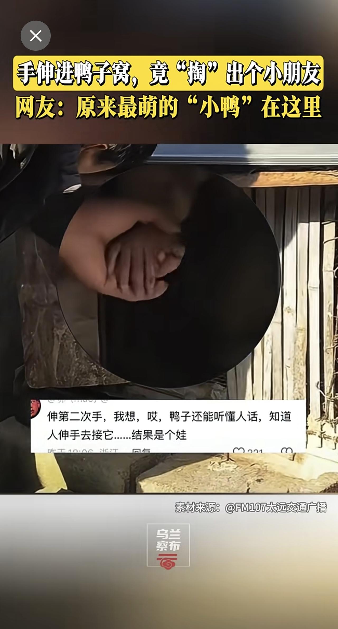 手伸进鸭子窝,竟“掏”出个小朋友!网友:原来最萌的“小鸭”在这里。萌娃 (编辑:陈琦 初审:马飞飞 二审:孙继伟 终审:王占海 素材来源:FM107太远交通广播)