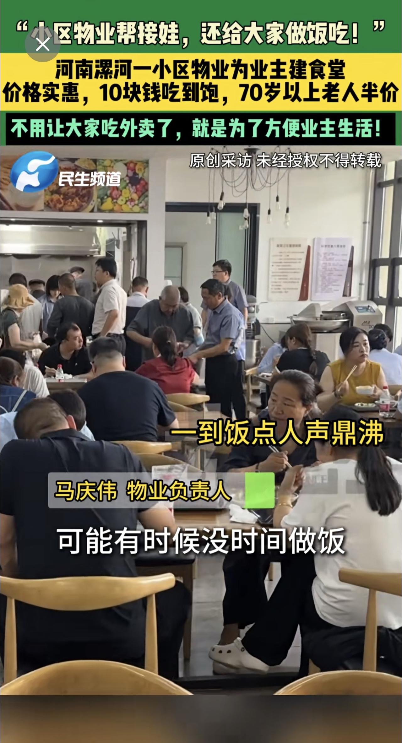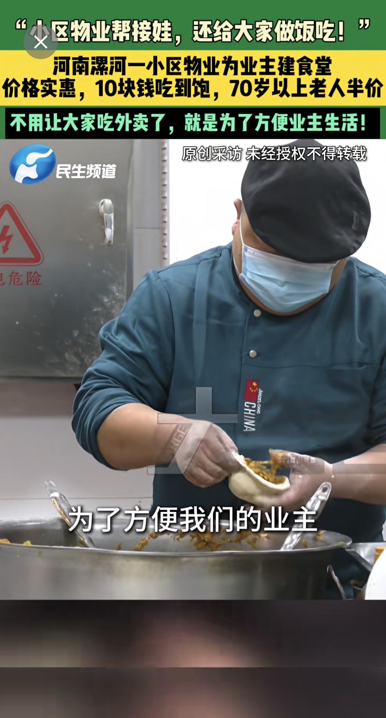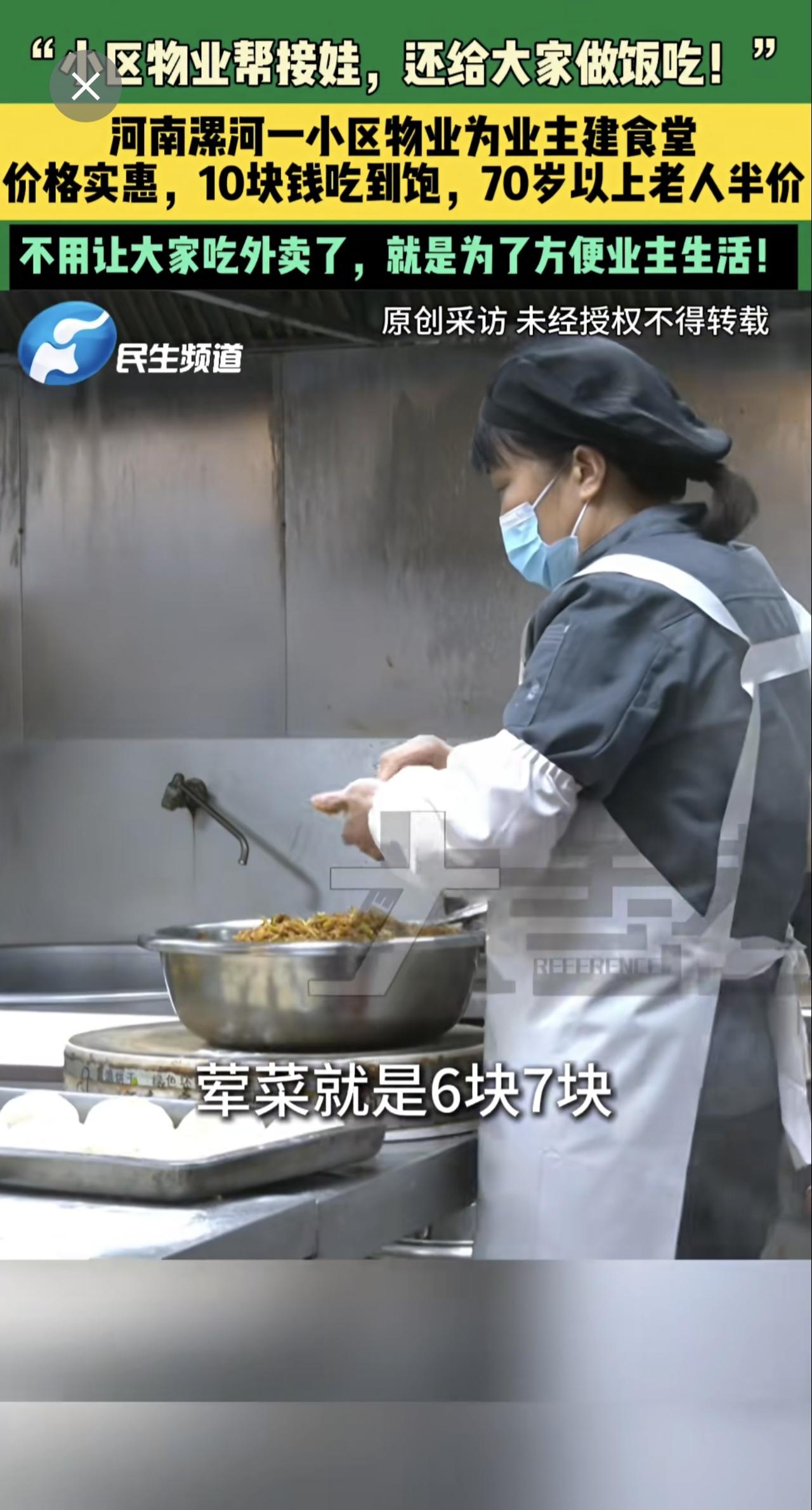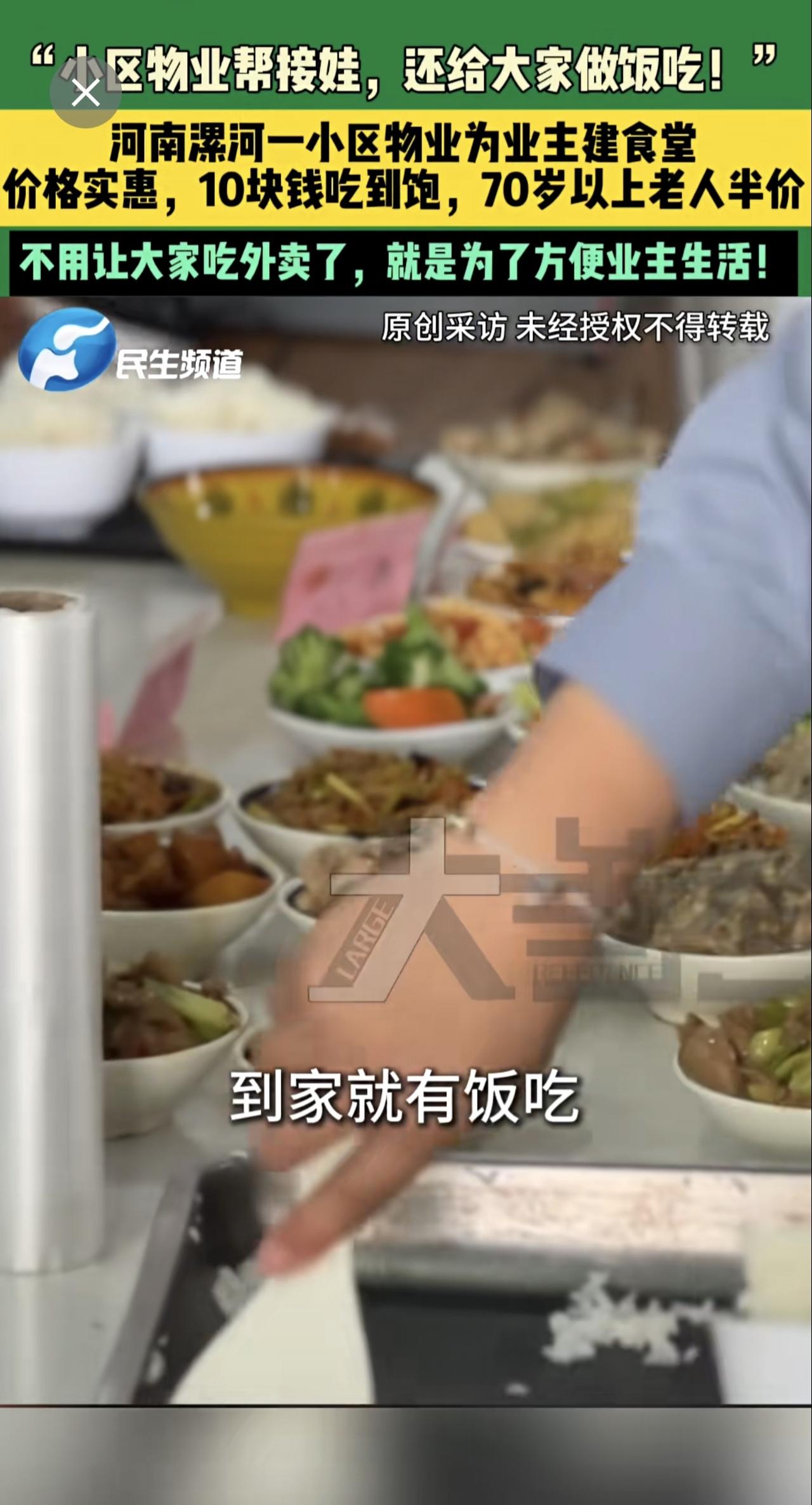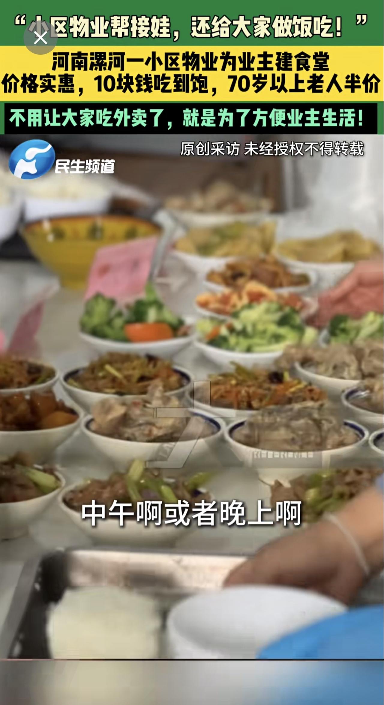 3月17日,河南漯河,“小区物业帮接娃,还给大家做饭吃!”,河南漯河一小区物业为业主建食堂,价格实惠,10块钱吃到饱,70岁以上老人半价,不用让大家吃外卖了,就是为了方便业主生活!