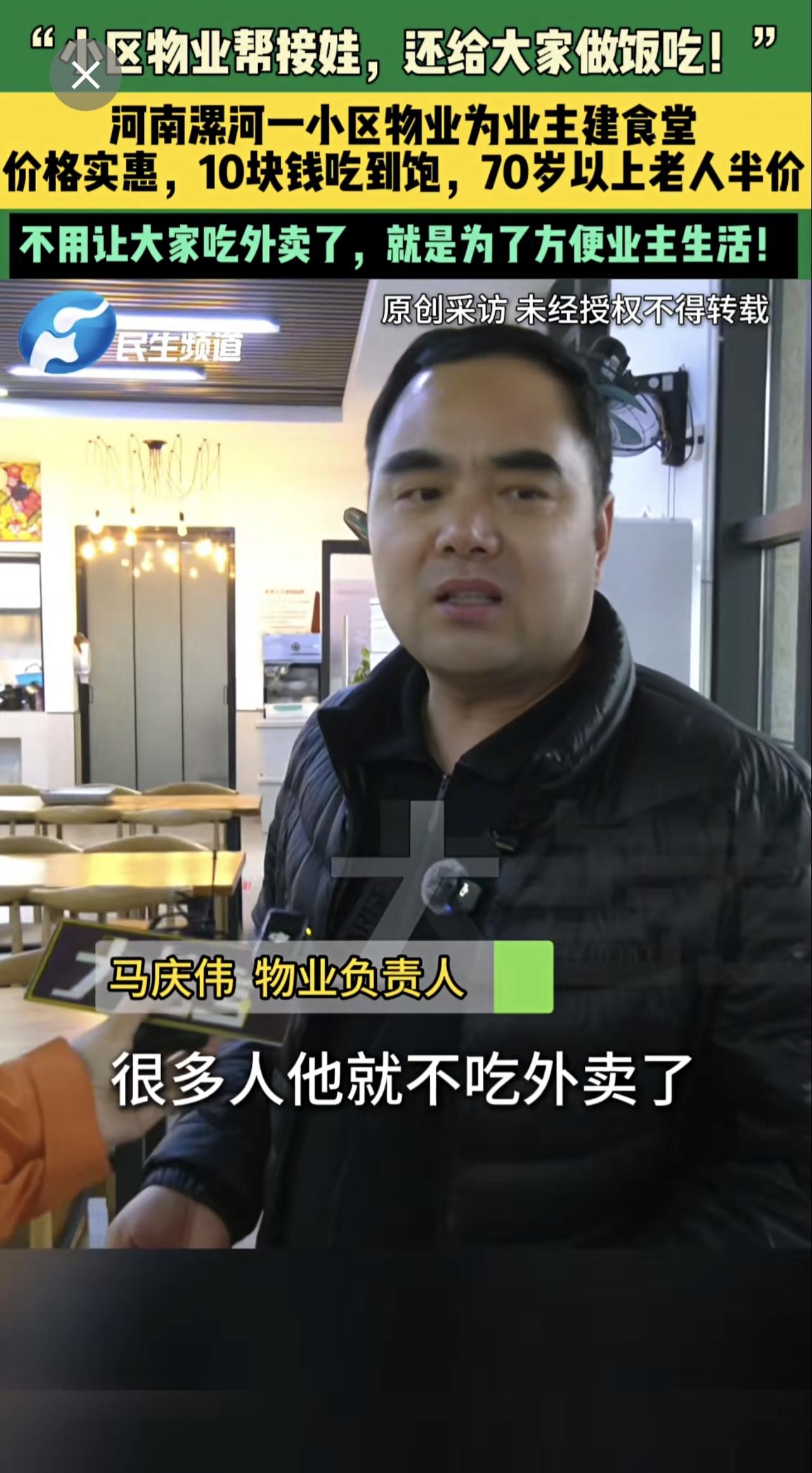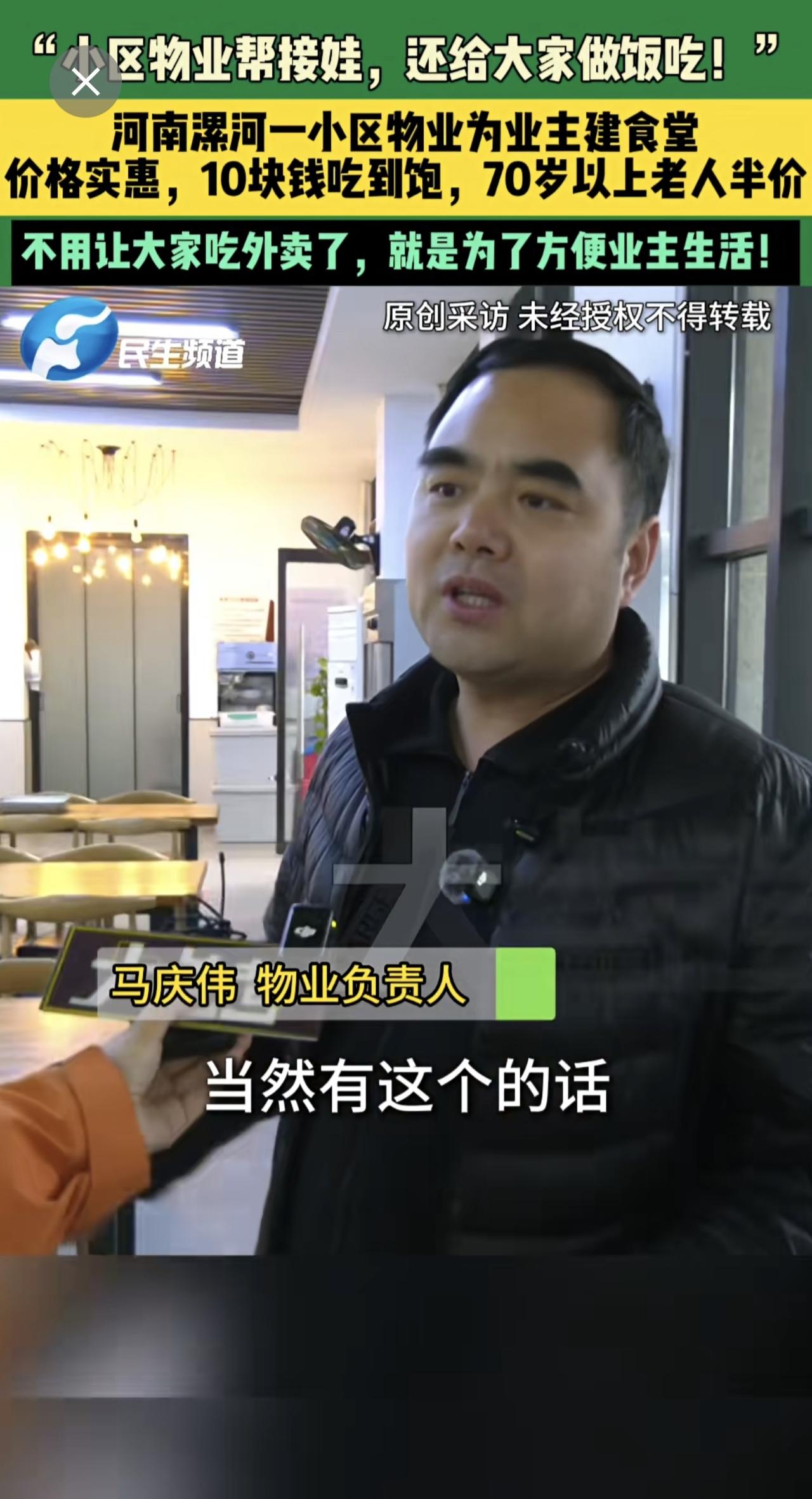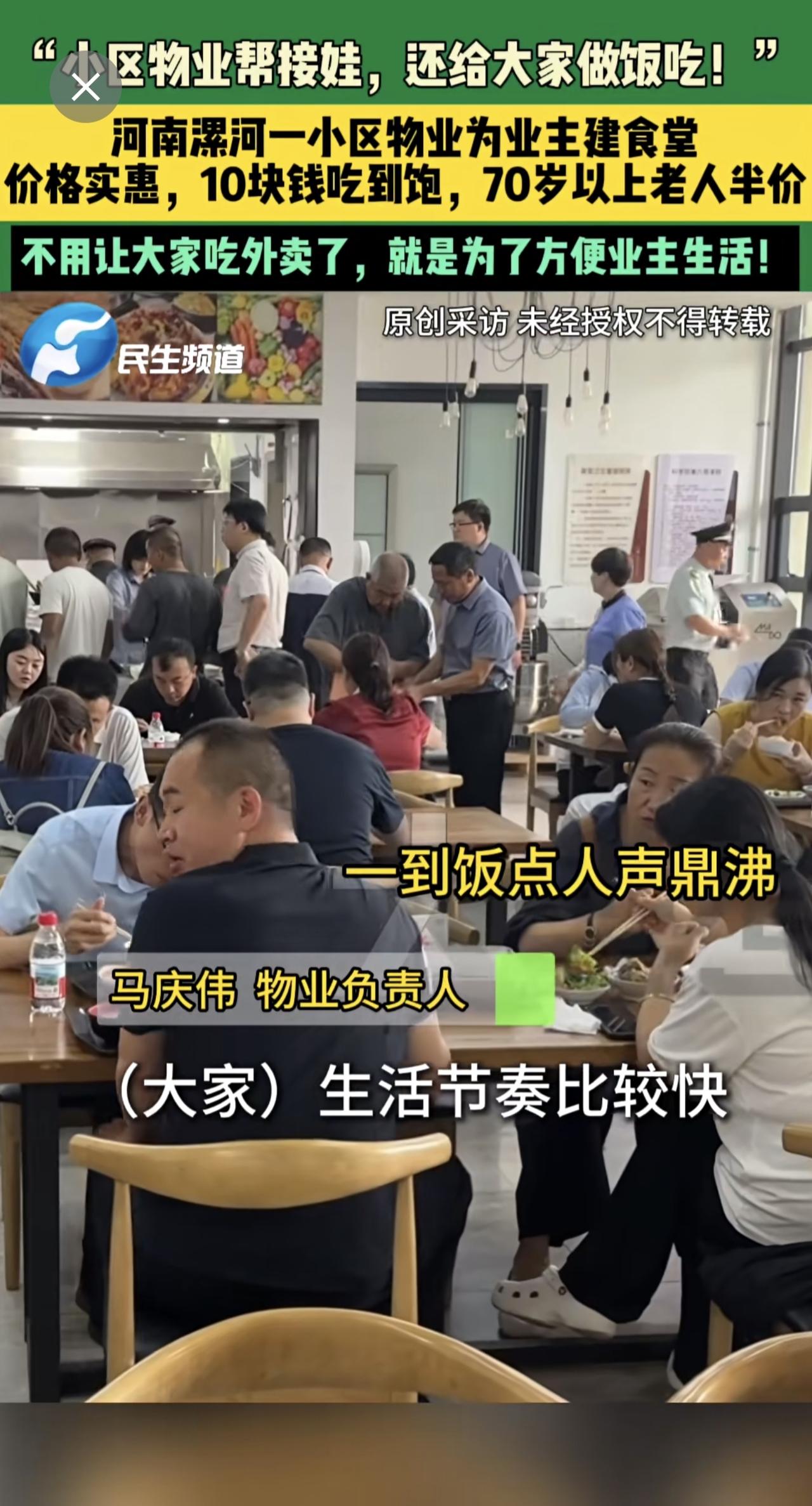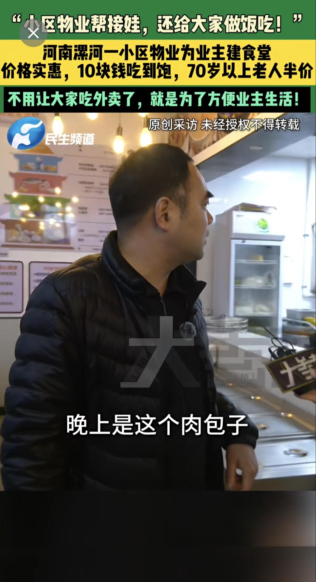 3月17日,河南漯河,“小区物业帮接娃,还给大家做饭吃!”,河南漯河一小区物业为业主建食堂,价格实惠,10块钱吃到饱,70岁以上老人半价,不用让大家吃外卖了,就是为了方便业主生活!