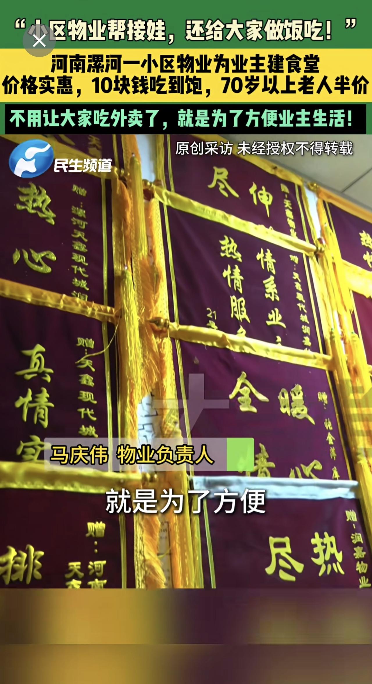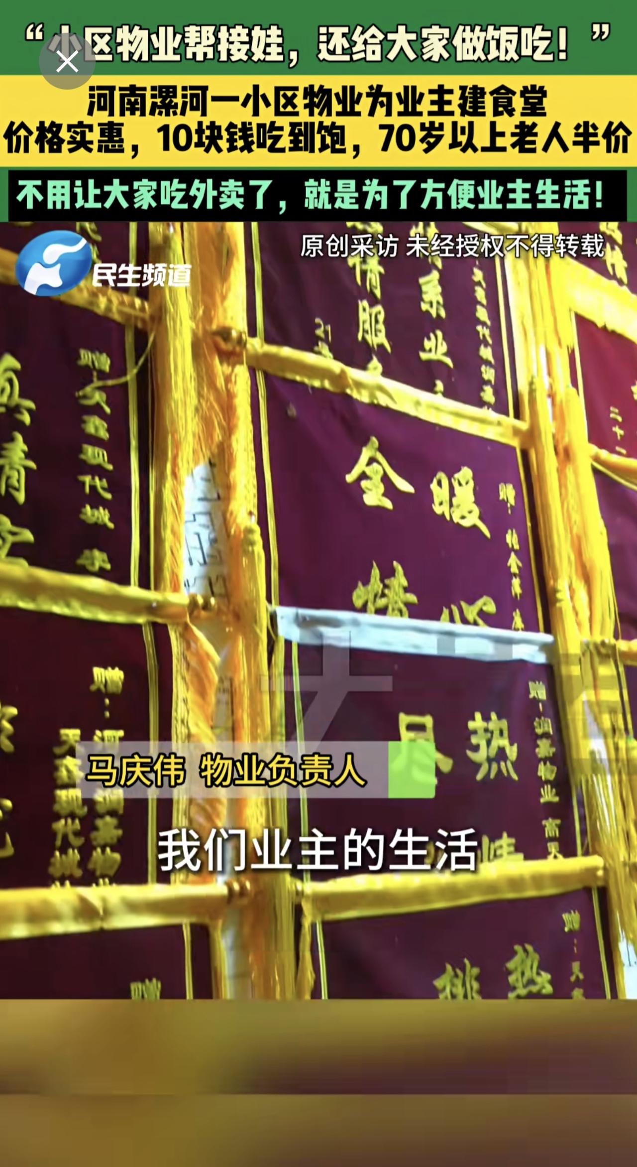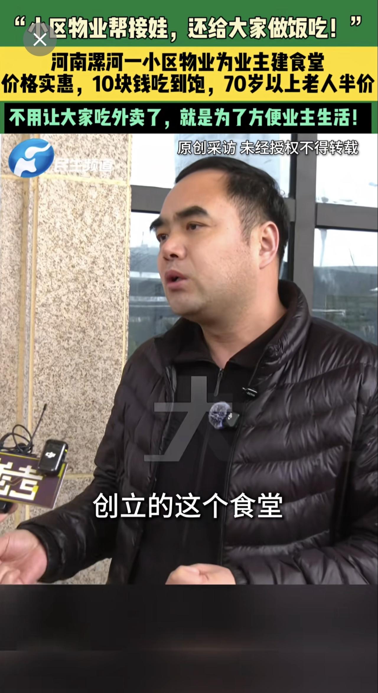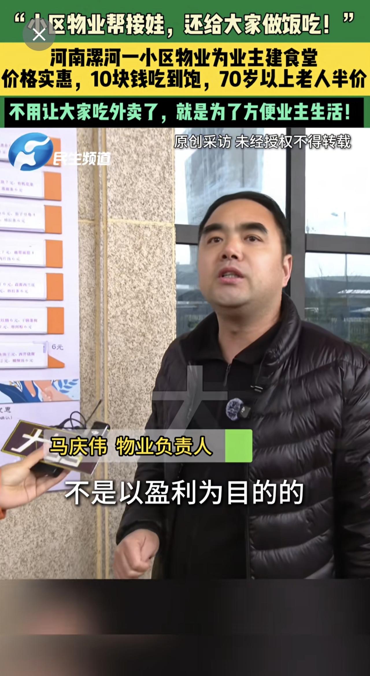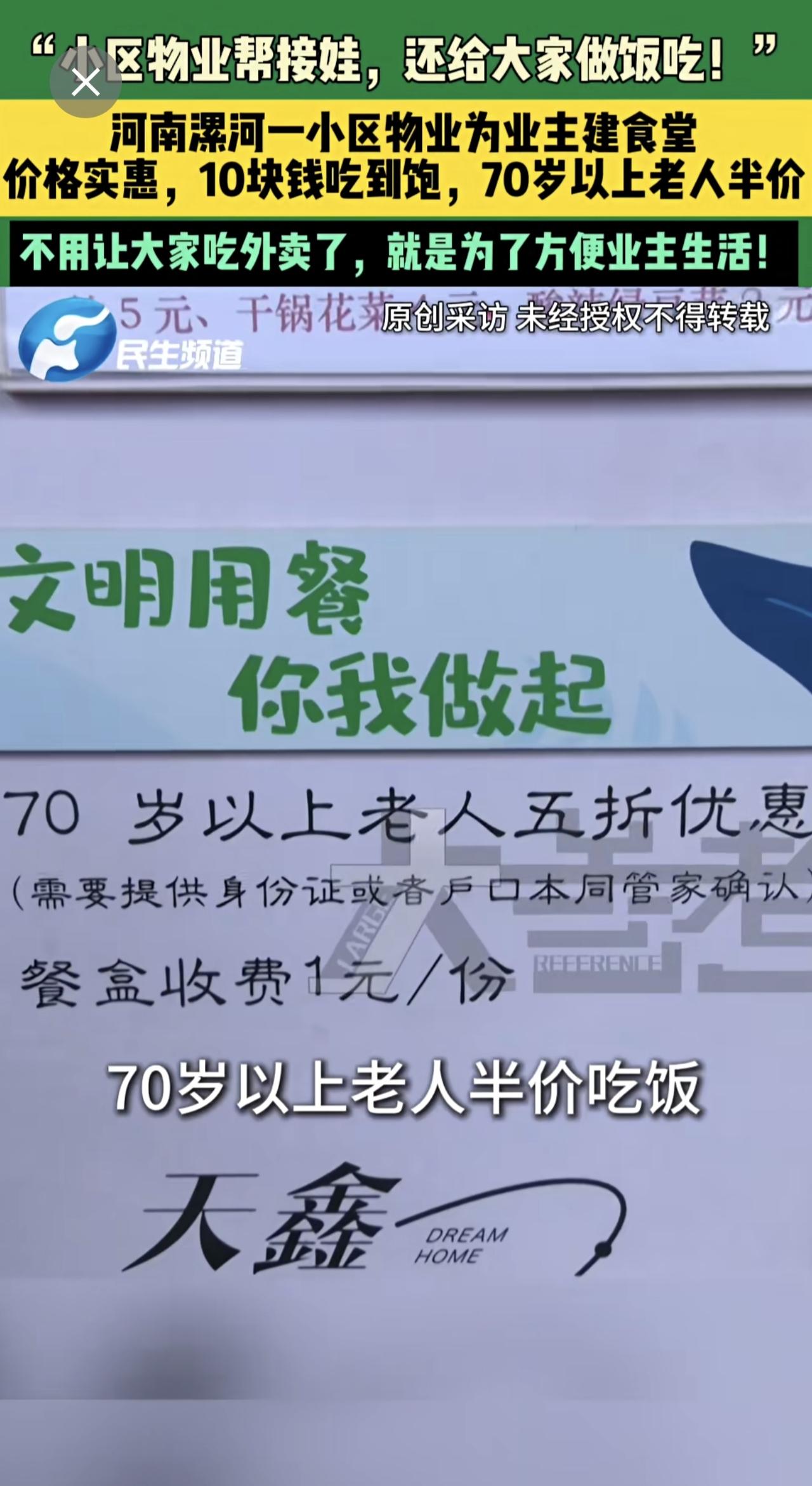3月17日,河南漯河,“小区物业帮接娃,还给大家做饭吃!”,河南漯河一小区物业为业主建食堂,价格实惠,10块钱吃到饱,70岁以上老人半价,不用让大家吃外卖了,就是为了方便业主生活!