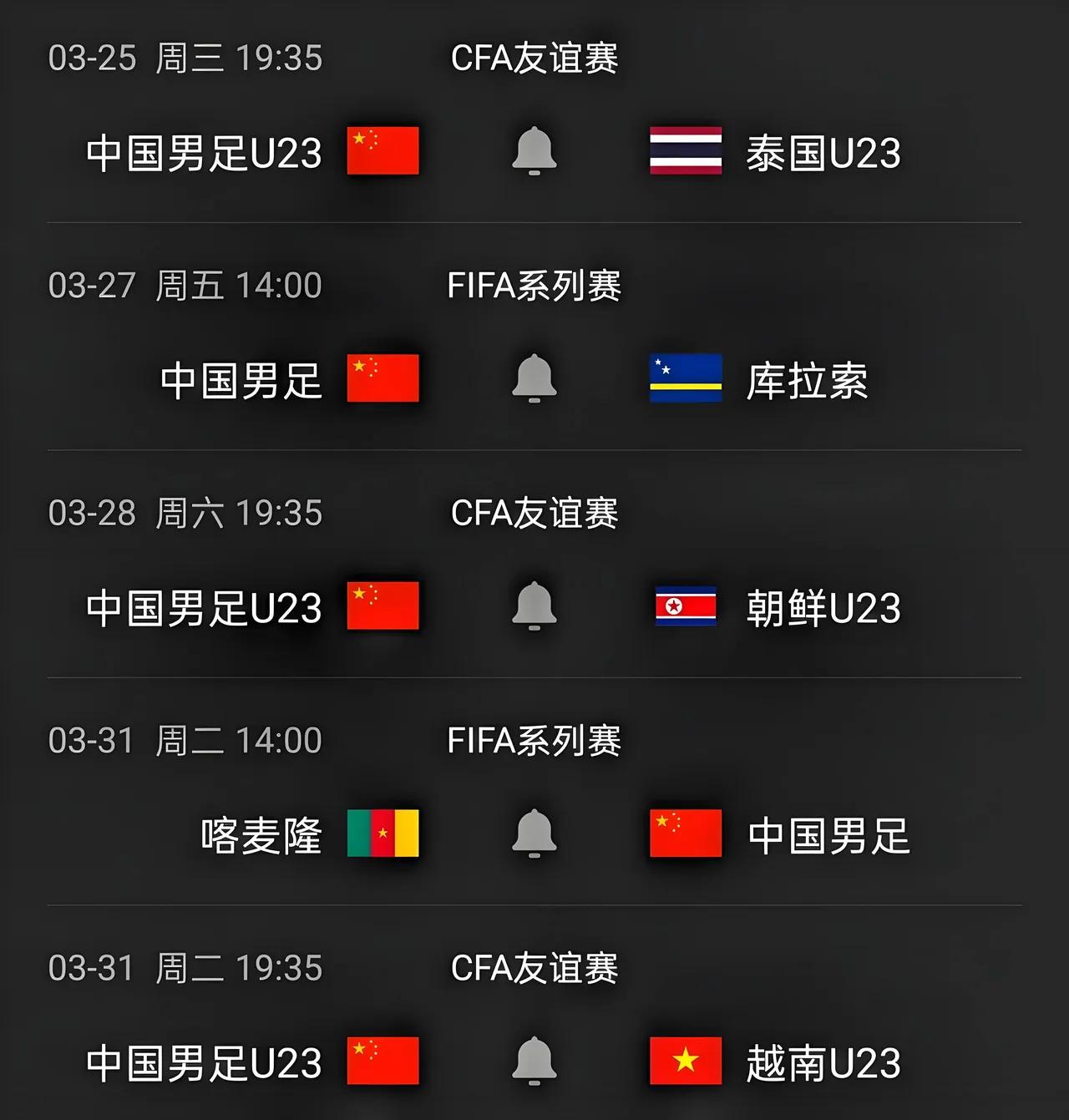 3月25日开始中国男足5支国字号全线出战,国足、U23国奥、U19、U17、U16全线出战,3.25–3.31天天有球看!赛程密集到看不过来,真的太爽了!球迷的盛宴马上开启了。 5支国字号全部有比(3.25–3.31) 中国国家队(成年)主帅:邵佳一 3.27 14:00 中国 vs 库拉索(澳大利亚) 3.31 14:00 中国 vs 喀麦隆(澳大利亚) 邵佳一上任后正式首秀,对手都是世界杯和非洲强队,“邵家军”新一期集训名单马上出炉,值得期待! 中国U23(国奥)主帅:安东尼奥 西安四国赛(3.25–3.31) 3.25 19:35 中国U23 vs 泰国U23 3.28 19:35 中国U23 vs 朝鲜U23 3.31 19:35 中国U23 vs 越南U23 安东尼奥率中国U23亚洲杯夺亚军后首次亮相,新阵容名单值得期待!西安福地精彩对决值得期待! 中国U19 主帅:久尔杰维奇 义乌热身(3.28、3.31) 中国U19两战VS澳大利亚U19 久尔杰维奇的新一届U19值得期待!这批U19是为了下一届U20亚洲杯而组建,希望久尔杰维奇这次能率这届U20进世青赛,中国U19加油! 中国U17 主帅:浮嶋敏 3月21日 16:00 中国U17 vs 塔吉克斯坦U17(肇庆) 3月24日 中国U17 vs 塔吉克斯坦U17 国内集训+热身赛,中国U17国少主要是为了备战5月U17亚洲杯,期待这一届中国U17国少能时隔21年再进世少赛。 中国U16 主帅:大卫 法国蒙泰古杯(3.30–4.6) 对阵法国、巴西、科特迪瓦 大卫新组建的中国U16再战蒙太古杯,中国新一代中国U16新星值得期待! 国字号五队齐亮相,赛程直接拉满。 球迷幸福到看不过来啦!终于有球天天追了,太期待啦!