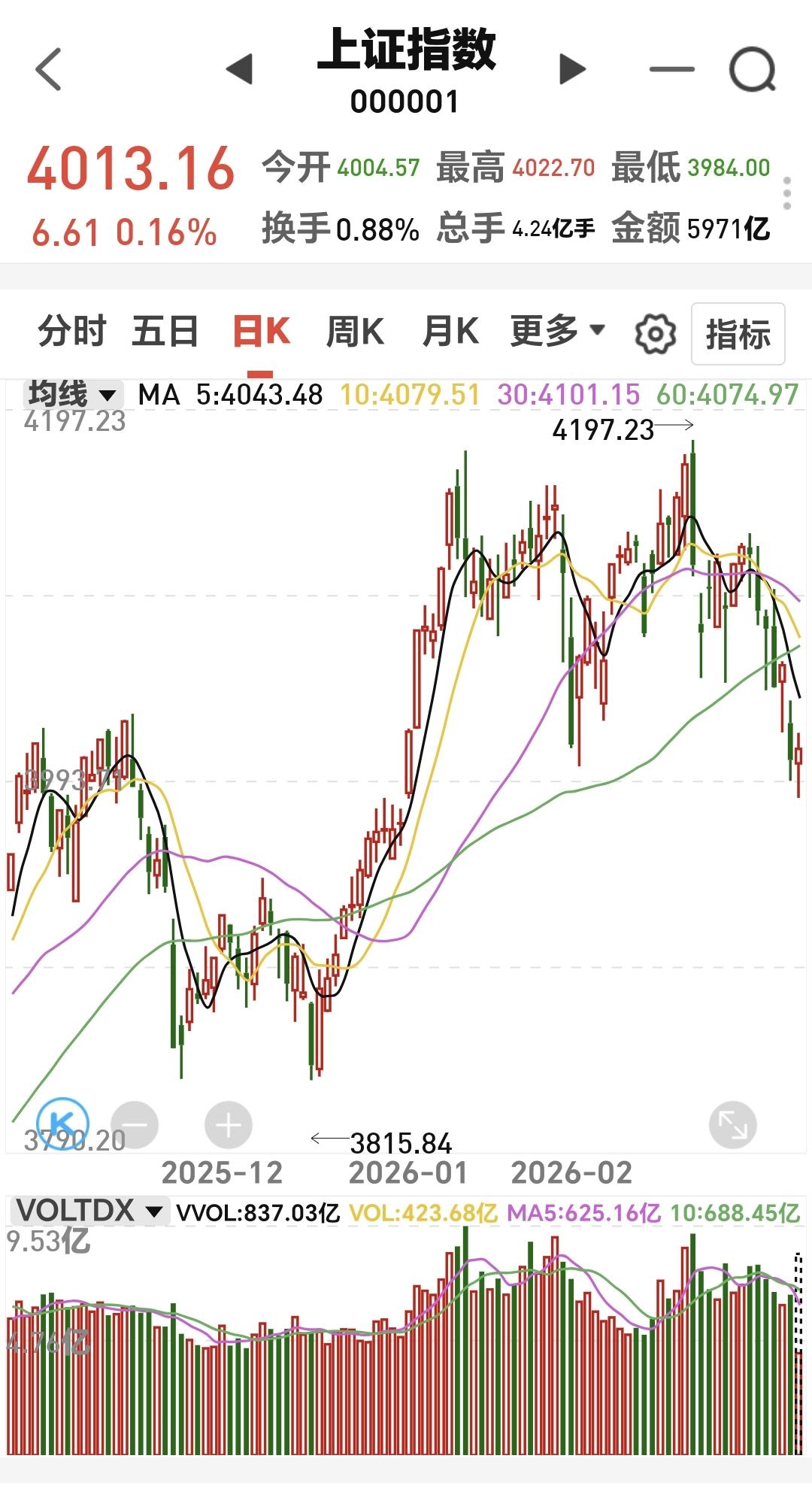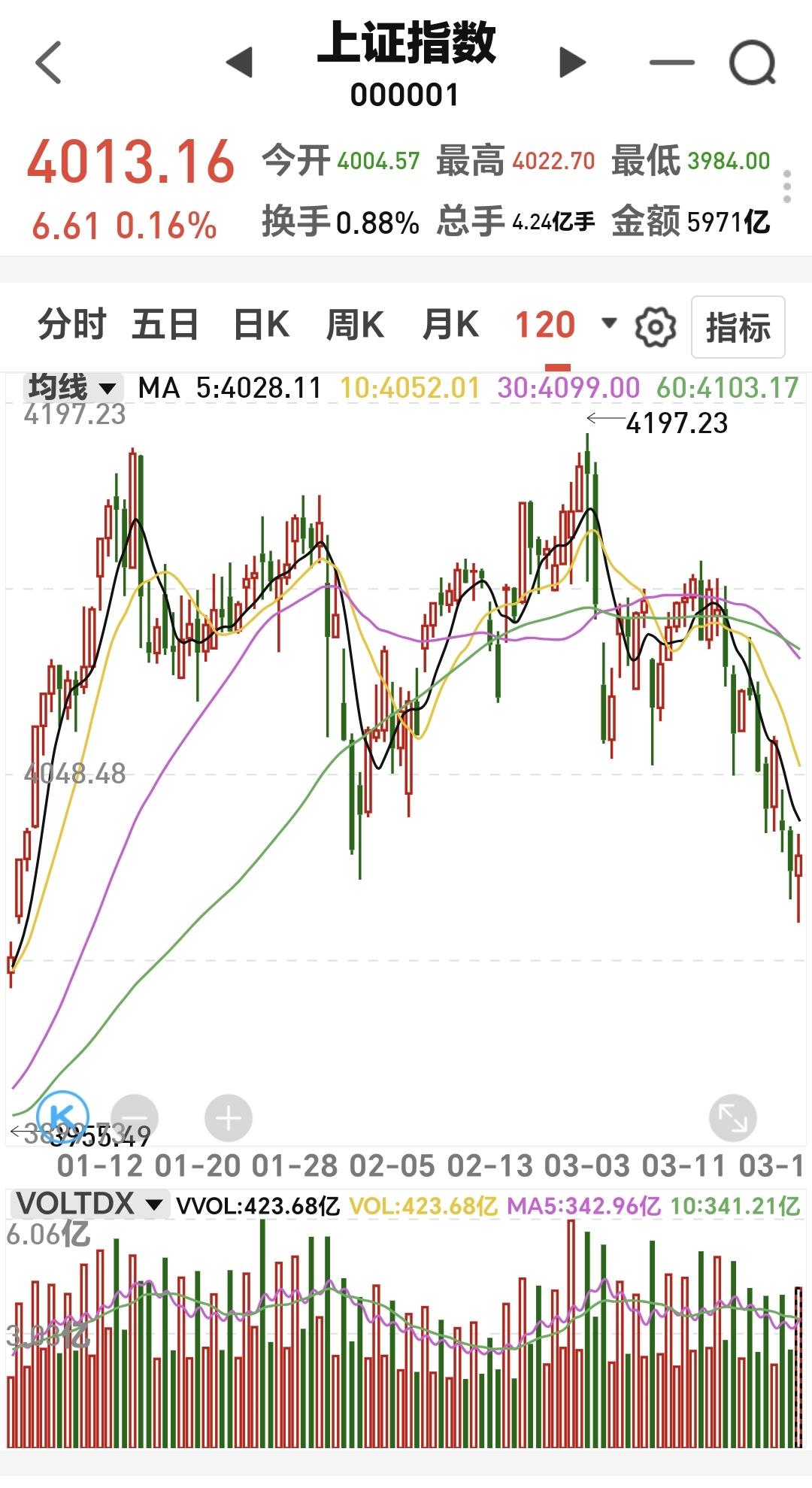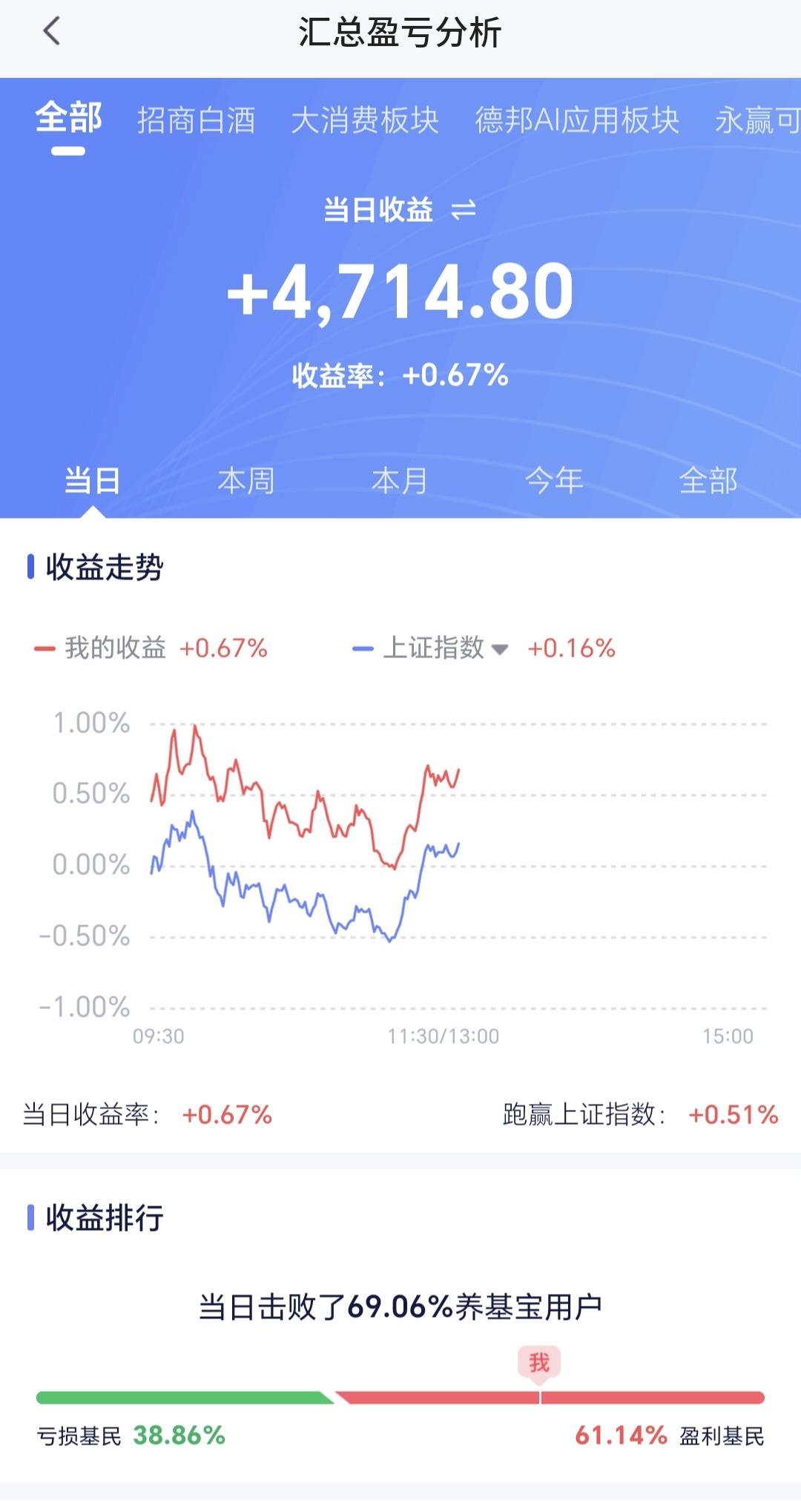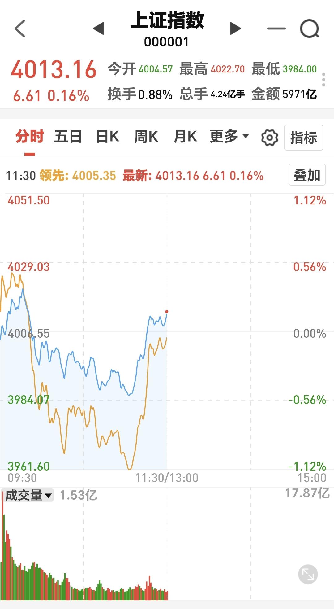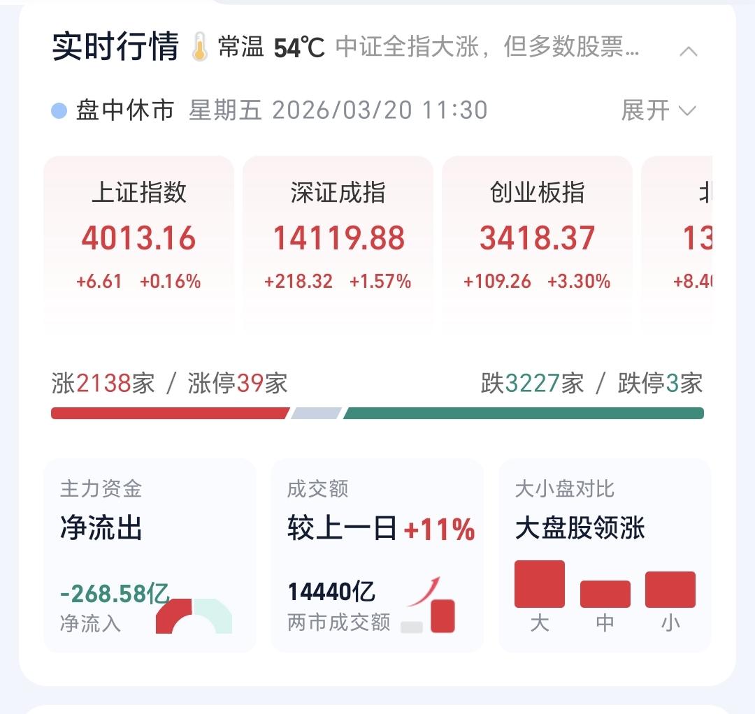 基金:市场探底回升,调整有没有全部结束 今天市场上午探底回升,中午收盘的时候三大指数都是上涨,创业板指上涨了3.30%,收于3418点,上证指数上涨了0.16%,收于4013点。 整个股票市场,上涨2138家,下跌3227家,涨停39家,跌停3家,上涨家数少于下跌家数。 持有的基金中,中午收盘的时候,估值盈利金额最大的三个板块是:创业板指,5G板块,创新药板块,估值亏损金额最大的三个板块是:证券板块芯片,半导体板块,先进制造板块,估值整体上涨了4714元。 整个基金市场,上涨12282家,下跌7138家,上涨幅度超过5%的160家,下跌幅度超过5%的2家。 图10是今天板块的上涨排行榜,上涨幅度最大的三个板块是:CPO板块,储能板块,光伏板块,图11是今天板块的下跌排行榜,下跌幅度最大的三个板块是:金融科技板块,恒生科技板块,油气资源板块,图12是今天基金的加仓和减仓人数,加仓1190319人,减仓954707人,加仓人数超过了减仓人数。 整个市场主力资金净流入最多的三个板块是:高端机造板块,大科技板块,新能源板块,主力资金净流出最多的三个板块是:国企板块,人工智能板块,计算机板块。 1:今天上午黄色线在蓝色线下方,中午收盘的时候两条线之间的敞口已经缩小,下午继续观察黄色线会不会上穿蓝色线。 2:今天上午两市累计成交14440亿,相比于昨天同期放量了11%,主力资金净流出268亿。 3:中午收盘的时候,五天线位置是4043点,收盘点位4013点,收在五天线之下,站上并站稳五天线之前,都不可以轻易判断调整已经结束。 4:光伏板块星期二跌破日线级别上涨通道下轨线以后,今天大涨回到了这个上涨通道内,光伏板块又重新回到了日线级别上涨趋势中,短线持有的人可以继续持有,继续观察今天收盘之前会不会重新来到上涨通道的下方。 光伏板块周线级别处于上涨通道中,距离上涨通道上下轨的空间差不多,小幅度的涨跌都改变不了这个板块周线级别的上涨趋势,长线持有的人可以继续持有。 5:稀土永磁板块日线级别处于短期下跌通道中,现在的位置距离下跌通道的下轨线比较近,今天的上涨并没有改变这个板块日线级别短期的下跌趋势,但由于距离下跌通道下轨线比较近,持有的人可以继续持有观察一下。 稀土永磁板块周线级别处于上涨通道中,距离上涨通道的下轨线比较近,近期观察会不会跌破这个上涨通道的下轨线,如果有效破位这条下轨线,长线持有的人需要注意风险,如果能够在这里止跌企稳,这里也是长线持有者的进场点。 今天早上文章的评论区,我说注意观察3977点至3983点的缺口支撑力度,今天上午最低点是3984点,很多人关心这个3984点是不是这一轮调整的最低点,这一轮的震荡调整有没有全部结束,我的判断是,3984点大概率不是这一轮调整的最低点,后面反弹以后还会再创新低,这一轮的震荡调整还没有结束,今天上午的反弹并不符合我的要求。 4032点之下的上涨都是弱反弹,今天上午盘中最高只有4022点,相差了十个点,而且是需要放量站稳4032点,成交量方面勉强及格,今天上午相比于昨天上午放量了11%,到现在为止的判断是,即使下午不会冲高回落,下周的走势也不容乐观,现在还必须要保持谨慎的态度。 花1秒钟点赞,花30秒钟评论,就是对我最大的支持,谢谢大家的支持。