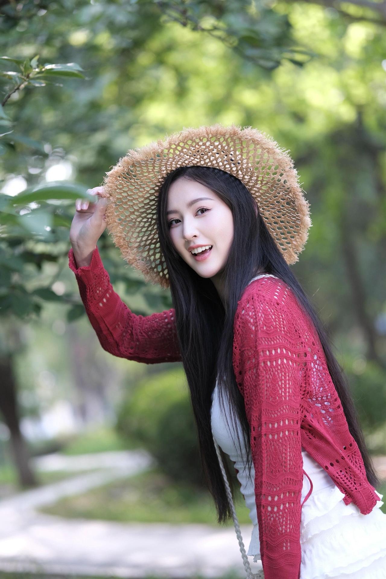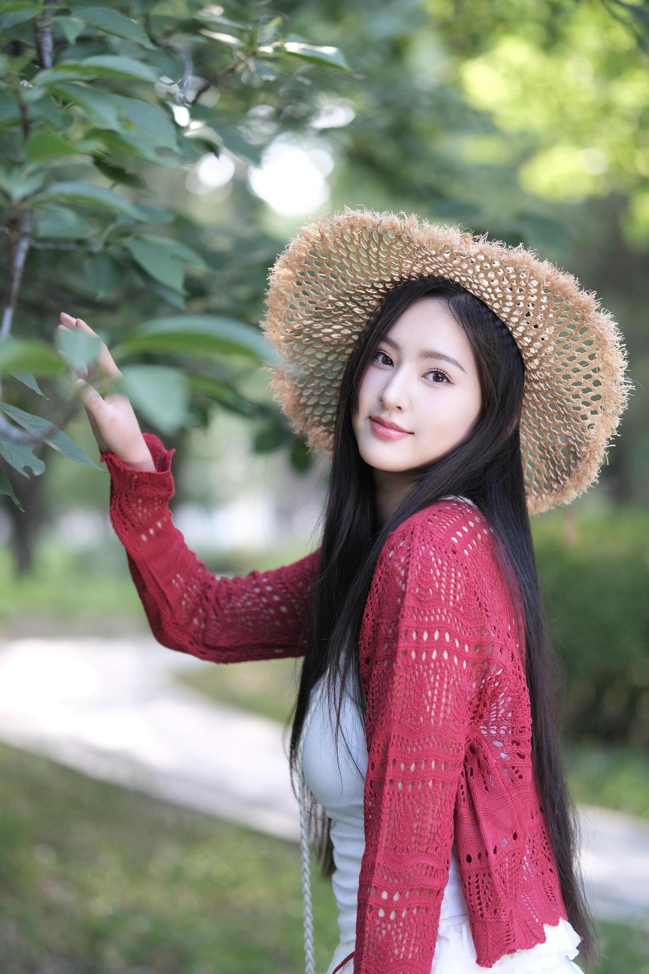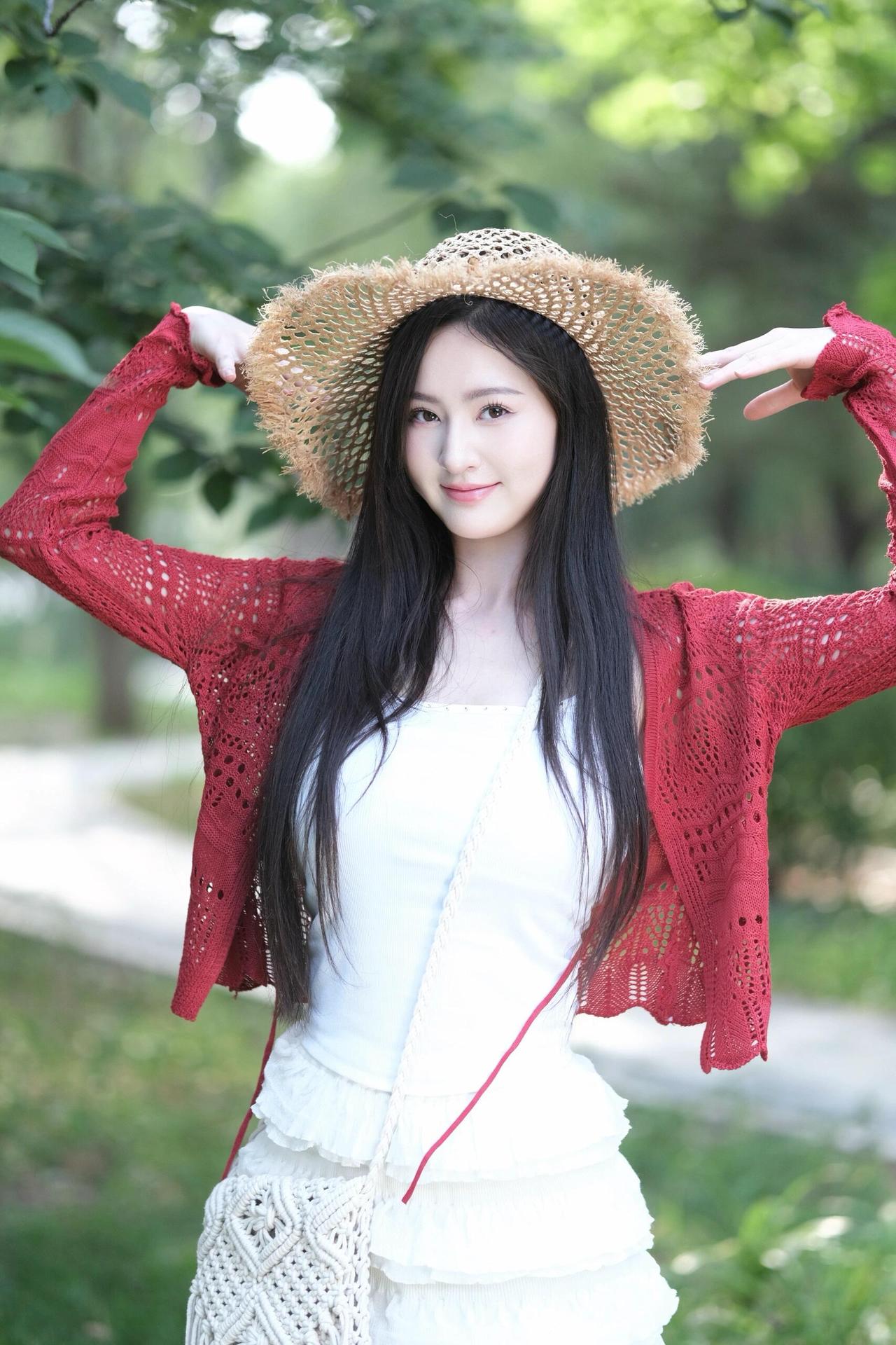 夏日清新穿搭,草帽+红色针织衫,甜美少女风🌞💗