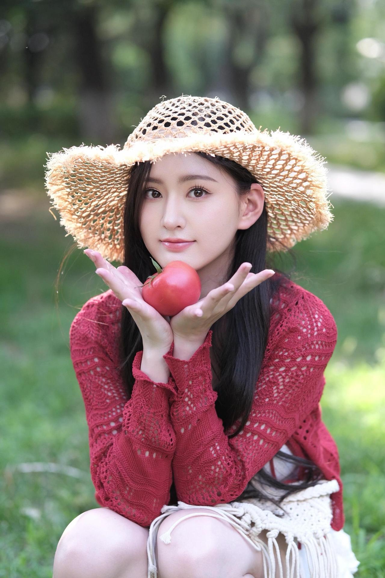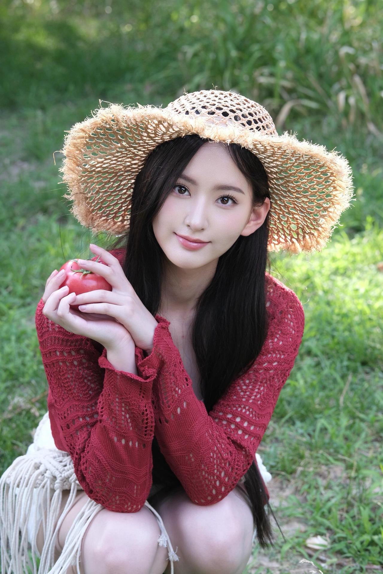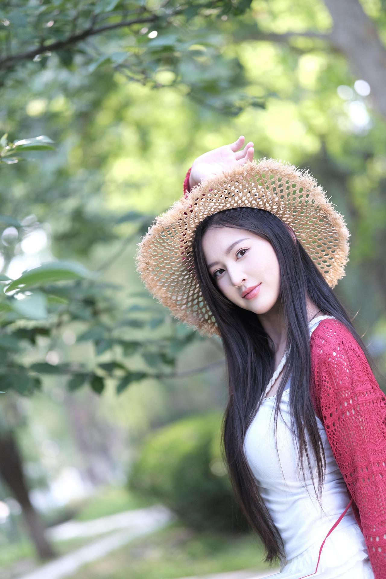 夏日清新穿搭,草帽+红色针织衫,甜美少女风🌞💗