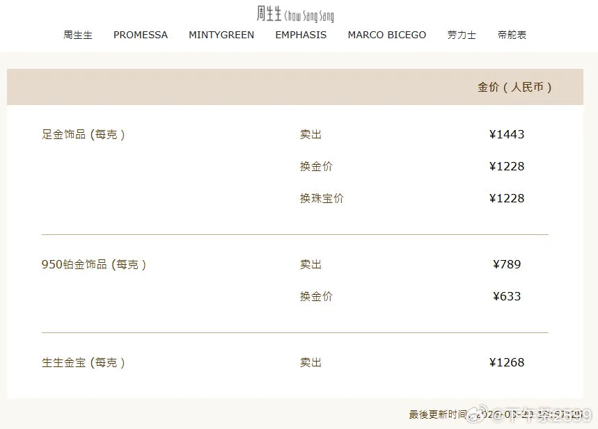 周生生足金饰品报1443元/克,较前一日1492元/克跌49元,两天跌去104元;