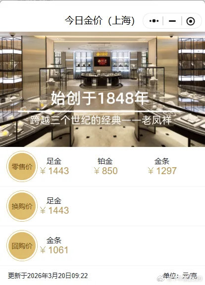 老凤祥足金饰品报1443元/克,较前一日1498元/克跌55元,两天跌去97元。