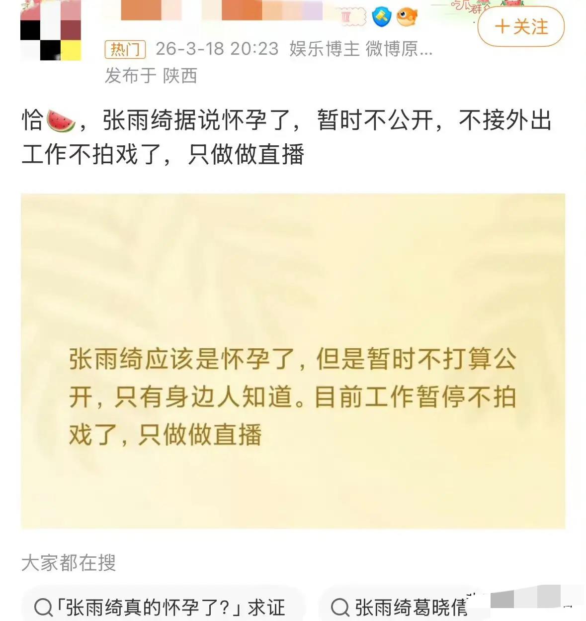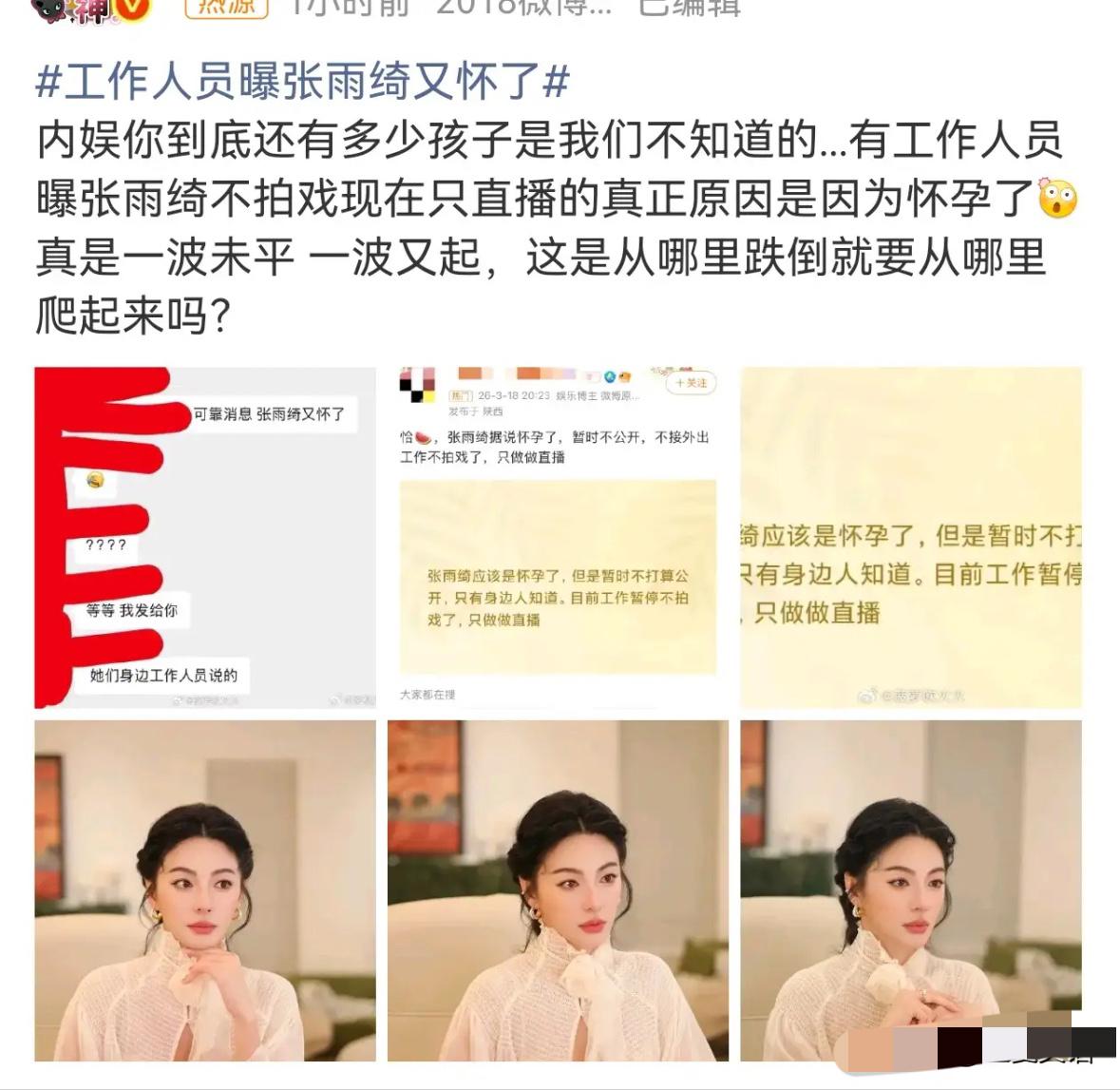 张雨绮,被曝大瓜! 代孕疑云还没散,突然又传怀孕,这波操作真的太迷了! 3月19日突然有博主爆料,说她又怀了,还拿所谓工作人员聊天记录当证据,直指她暂停拍戏、专心直播就是为了养胎。年初代孕风波闹得沸沸扬扬,葛晓倩实名举报还晒出公证文件,她和团队全程沉默不回应,现在又来个怀孕爆料,怎么看都像是在转移视线。 我真觉得,娱乐圈的匿名爆料别太当真,没有孕检报告、没有实锤路透,光靠几张截图就带节奏,未免太草率。她直播时状态在线、身形利落,完全没有孕期的疲惫感,怎么看都不像在养胎。 与其靠八卦博眼球,不如直面之前的争议给个说法。沉默只会让猜测越来越多,路人缘也会慢慢耗光。 大家觉得这次怀孕爆料是真的,还是用来转移焦点的呢?来评论区聊聊~