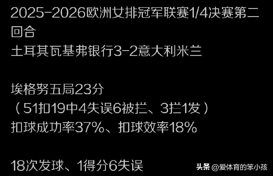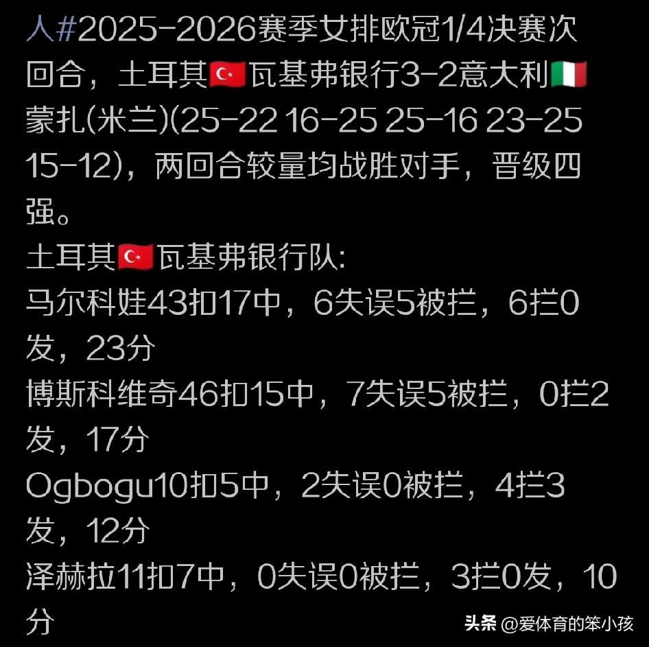 欧冠女排争夺战的赛场上其实从8进4比拼就已经是强强对话。而且球队之间的实力就在伯仲之间,各支球队当中的球星如何挑大梁,或者在比赛当中有帮手可以给他们以辅助,也将决定着整个欧冠比赛的走势。 显然在这个角度上来说,朱婷和她的队友们算是比较幸运,相对轻松的通过两回合作战成功锁定一个四强席位。而他们半决赛当中的对手,则将是来自土耳其联赛,曾经朱婷效力的老东家瓦基弗银行俱乐部。这支球队是在8进4争夺战当中,战胜意大利名将埃格努领军的米兰女排成功锁定一个四强席位的。 值得一提的是,埃格努在进入职业生涯以来,其实也保持着在欧冠联赛的赛场上一直能晋级四强的记录。不过,这次米兰队被瓦基夫银行淘汰出局,无缘4强,在很大程度上,除了身边缺少帮手之外,埃格努自身的失误偏多,强攻稳定性有所下降,特别是打调整球的能力,与巅峰时期相比出现的问题比较多,也是米兰俱乐部无缘晋级的一大关键。哪怕她拼下23分的高得分依然无法帮助球队实现晋级。 反观瓦基夫银行这边,球队核心球员博斯科维奇依然是球队当中稳定军心的角色,她也在比赛当中再次展现了核心球员以及世界顶级球员的强大实力,拿到17分,确保球队可以通过稳定发挥,实现双杀米兰的同时,成功晋级的目标。 不过对于朱婷和她的队友们而言,显然下一轮欧冠半决赛的比拼就变得有点难度了。不管是瓦基夫银行还是科内利亚诺,其实当下都是既有强力的攻击点,又有队员属于相对比较具备综合实力的球员。而且大家在世界比赛当中的经验都还不错。双方可能到时候真的就是拼临场发挥和关键分能力,以及球员们在遇到困难之后如何摆脱的能力。 也让我们期待着看看这两支由博斯科维奇还有朱婷领军的球队,会在欧冠半决赛当中贡献怎样的发挥。同时看看另一场半决赛斯坎迪奇与伊萨奇巴希之间又会有怎样的竞争?当然比赛会到5月份才继续进行,两支球队都还有一定的调整和补强空间,就看他们如何利用好下一阶段的备战,争取在需要他们打出最佳状态的时候,给我们继续贡献精彩吧。