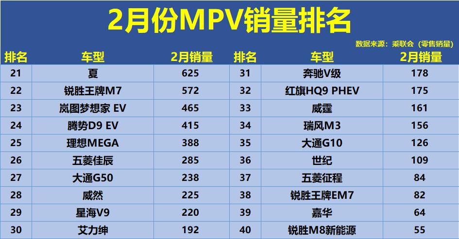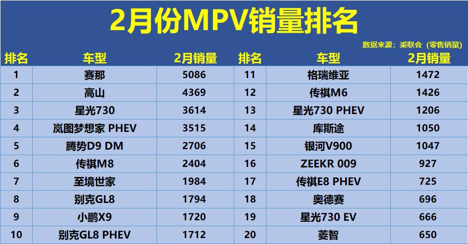 2月的MPV市场呈现出明显的“新旧交织”态势。赛那以5086辆的成绩拿下冠军,这款丰田家用MPV凭借均衡的产品力逐渐站稳脚跟。紧随其后的是高山,4369辆的销量说明消费者对新能源MPV的接受度正在快速提升。岚图梦想家PHEV和腾势D9 DM分别卖出3515辆和2706辆,加上小鹏X9、ZEEKR 009等新势力车型,新能源MPV已经形成矩阵。 传统阵营中,别克GL8本月仅售出1794辆,加上PHEV版本的1712辆,合计也不过3500辆,与巅峰时期相去甚远。传祺M8和M6分别贡献2404辆和1426辆,成为自主燃油MPV的扛把子。日系阵营里,格瑞维亚卖出1472辆,奥德赛696辆,艾力绅192辆,表现中规中矩。 中后段方面,夏卖出625辆,这款比亚迪新车还在爬坡期。理想MEGA卖出388辆,与上市初的热度相比有所回落。尾部车型分化严重,极狐考拉、荣威iMAX8 DMH、沃尔沃EM90等月销仅几十辆甚至个位数。途安L仅售13辆,基本处于退市边缘。整体来看,MPV市场正在从GL8一家独大转向多元化竞争,新能源车型的加入让这个细分领域热闹了不少。