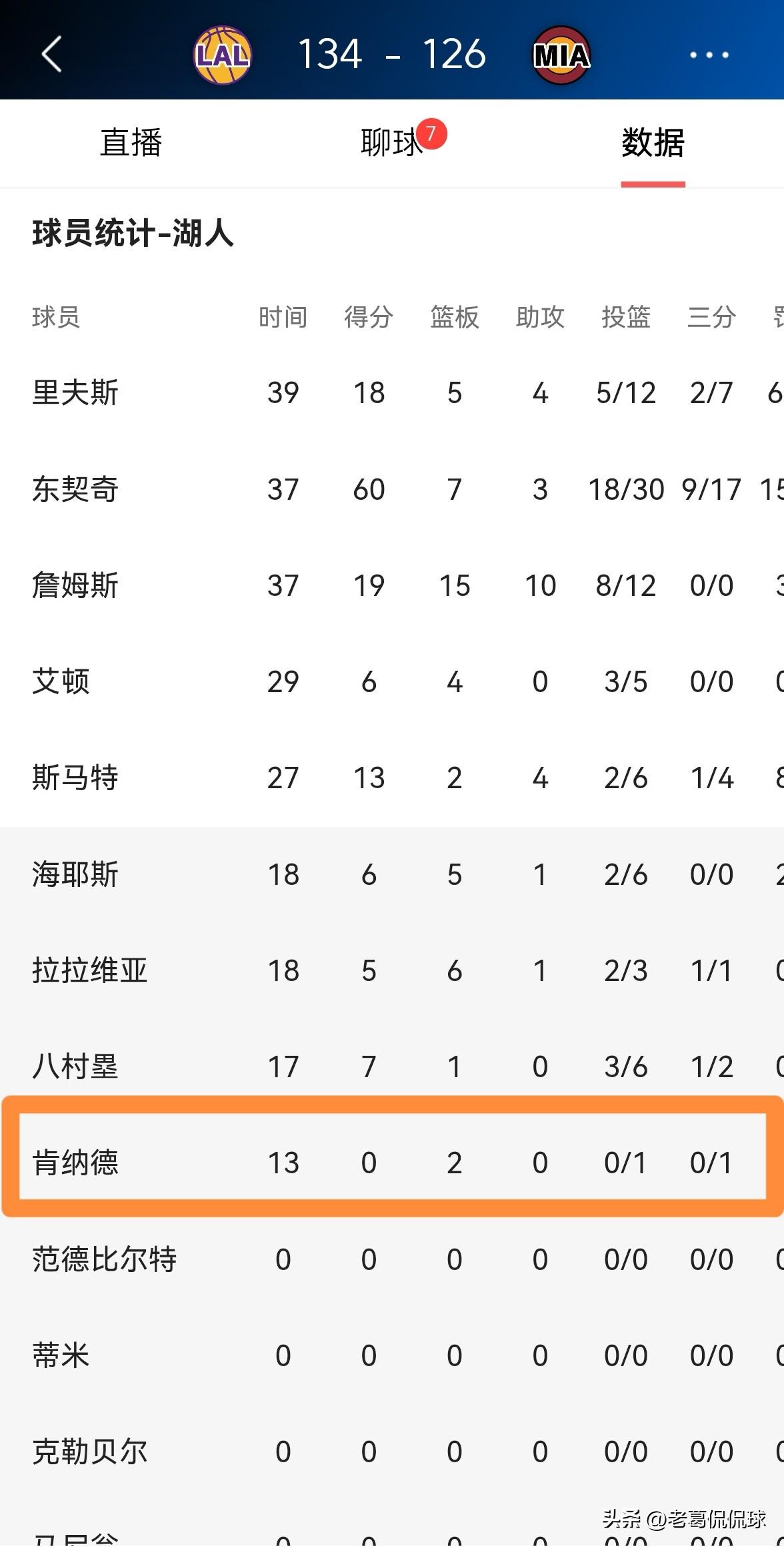 湖人神射手肯纳德真是太黯淡无光了!在今天湖人客场以134:126击败热火的比赛中,贵为神射手的肯纳德在场上毫无存在感,他不仅在进攻端毫无表现,而且在防守端遭到了对手的完爆。 全场比赛下来,肯纳德替补出战13分钟,投篮1中0怒砍0分,他的场上正负值为-5。 坦白说,以我的拙见来看,由于肯纳德的单防能力过于糟糕,因此我觉得肯纳德很有可能会掉出球队的常规轮换阵容。