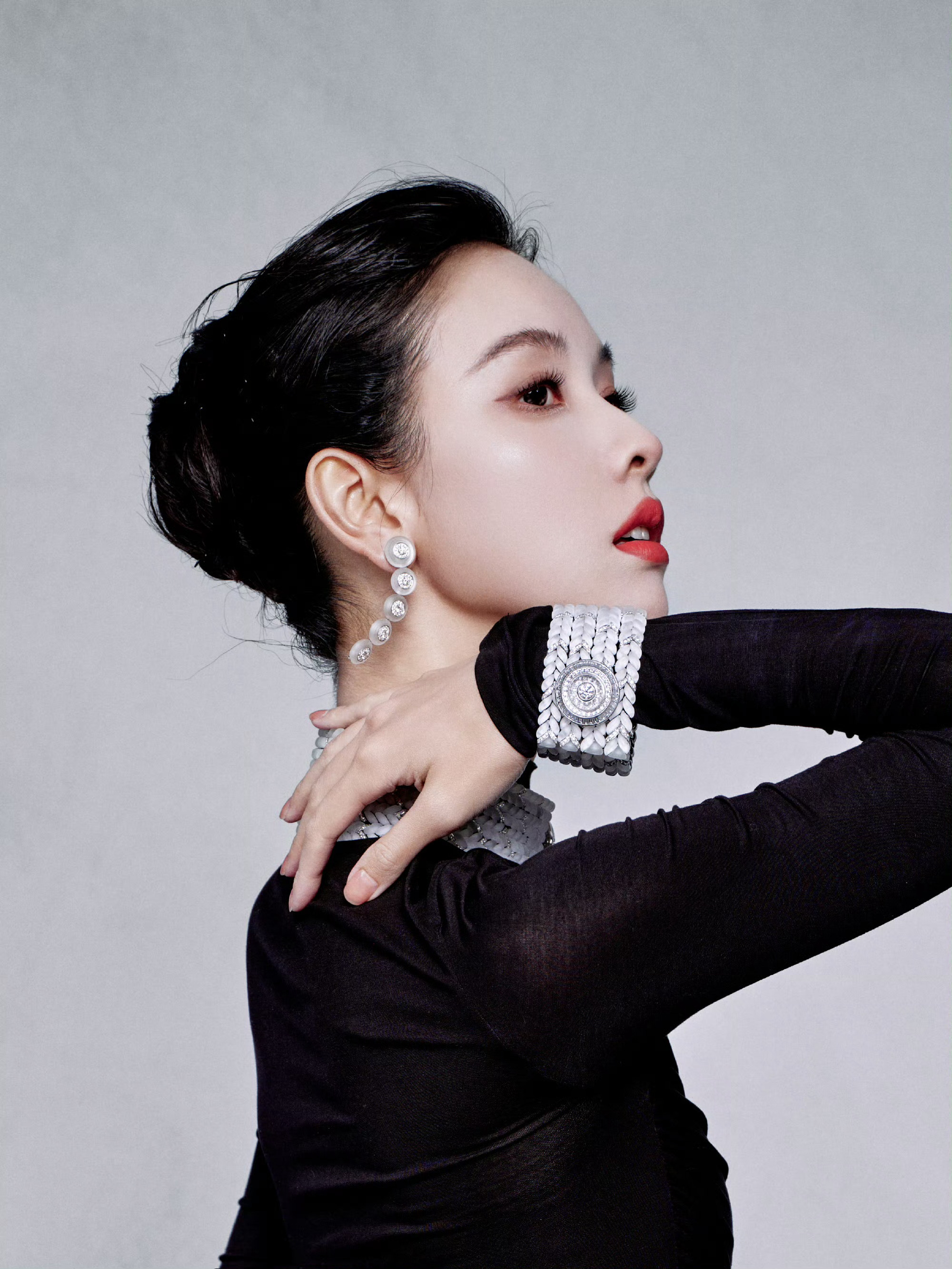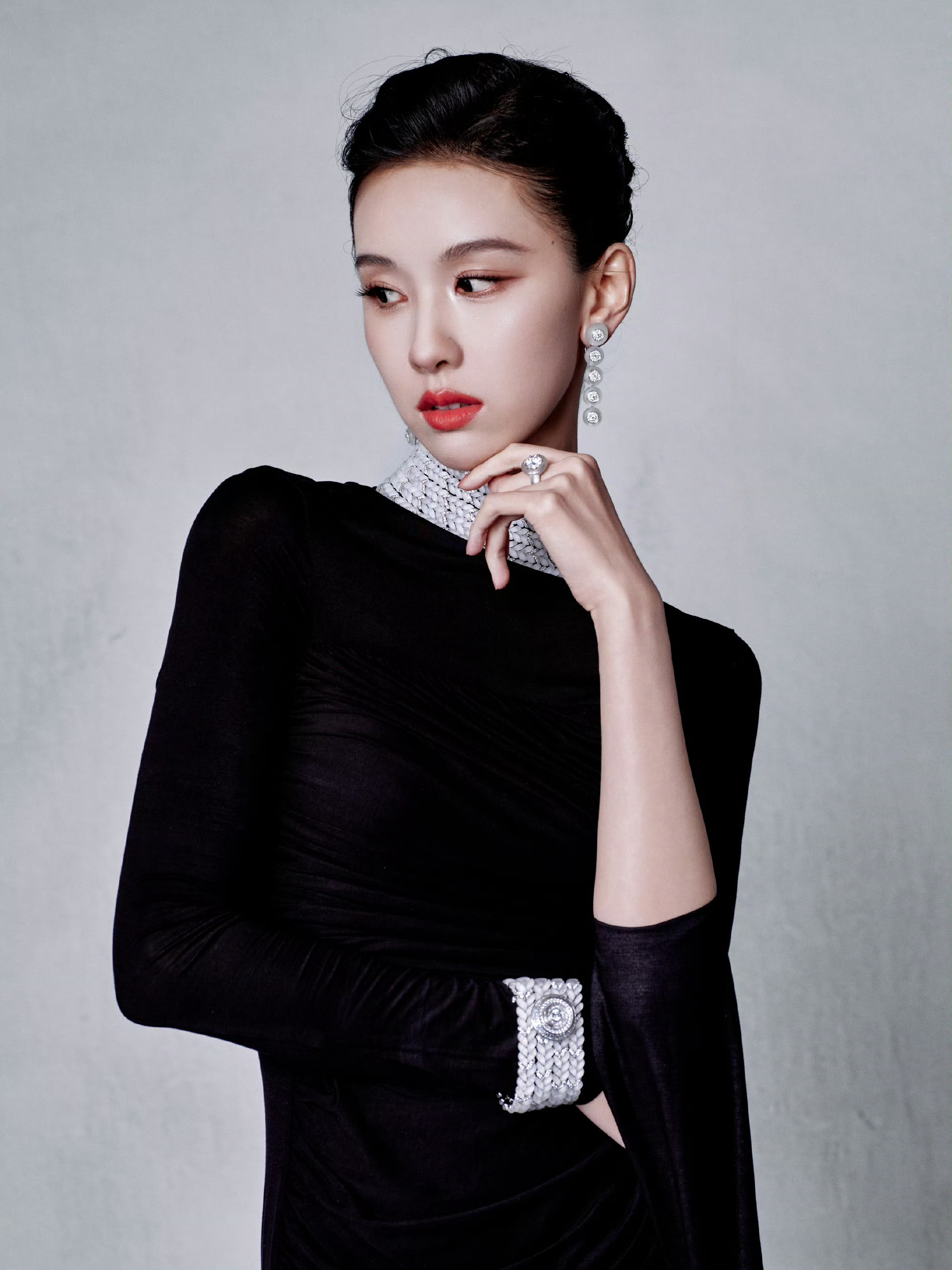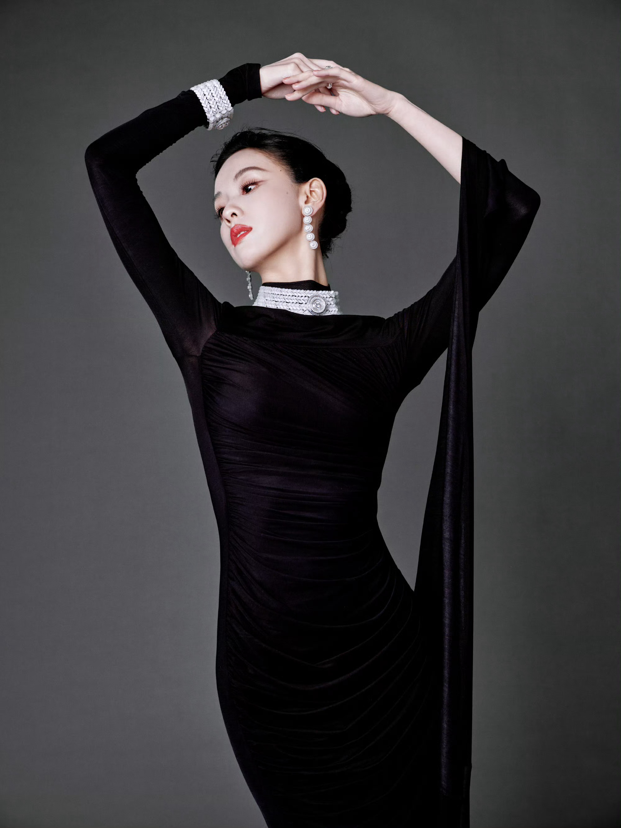陈都灵身着 Due E Chen 2026春夏黑色垂褶长裙,佩戴宝诗龙 Plume de Paon孔雀羽毛高级珠宝项链,搭配利落高盘发。整体造型融合复古优雅与东方韵味。
