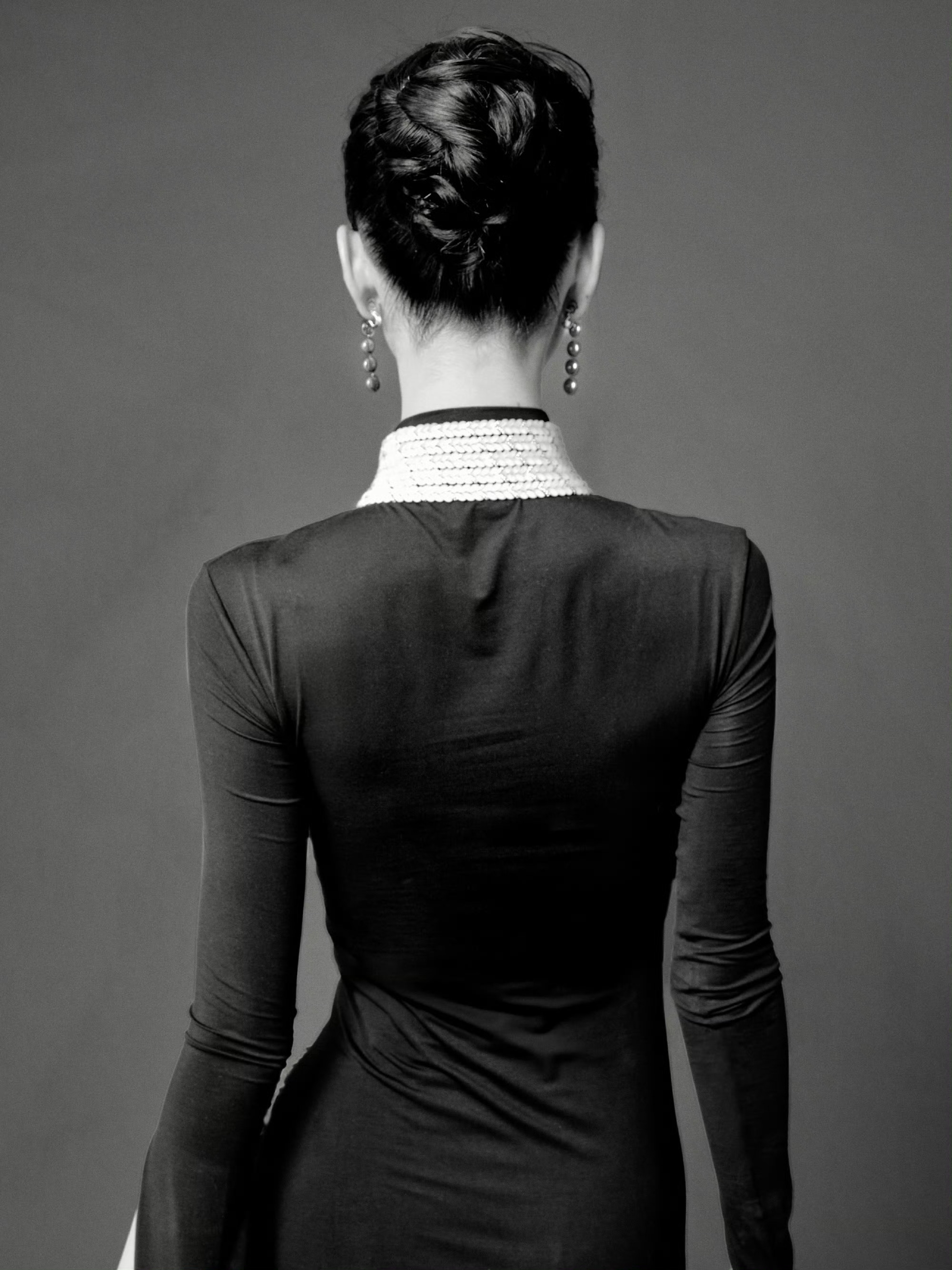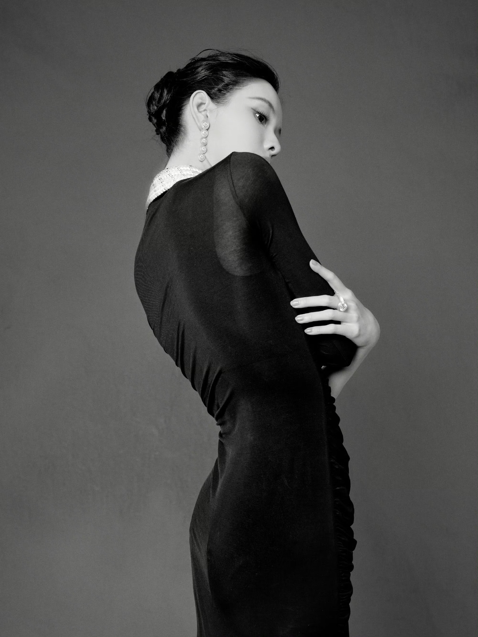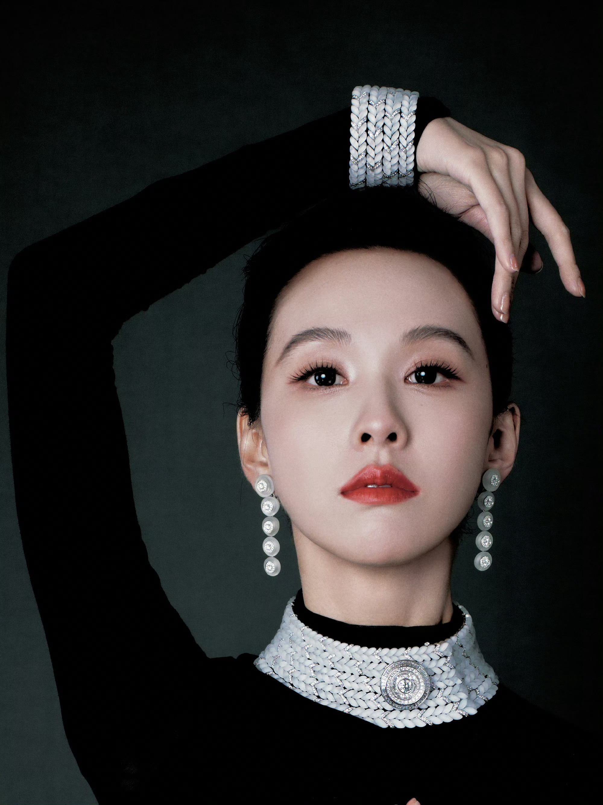 陈都灵身着 Due E Chen 2026春夏黑色垂褶长裙,佩戴宝诗龙 Plume de Paon孔雀羽毛高级珠宝项链,搭配利落高盘发。整体造型融合复古优雅与东方韵味。