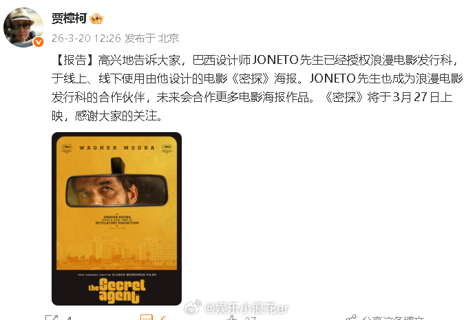 贾樟柯方获设计师海报使用授权 “巴西设计师JONETO先生已经授权浪漫电影发行科,于线上、线下使用由他设计的电影《密探》海报。JONETO先生也成为浪漫电影发行科的合作伙伴,未来会合作更多电影海报作品。”