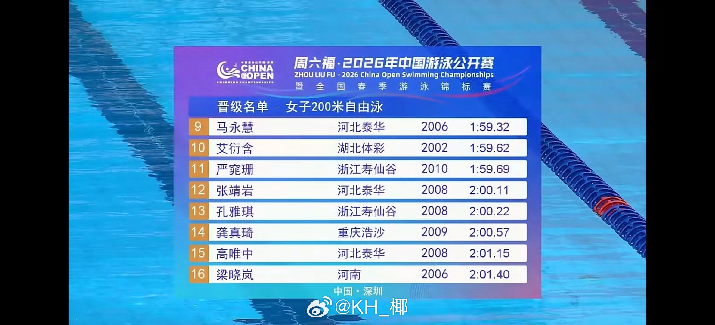 2026年中国游泳公开赛 女200自预赛🇦🇺Pallister 1:57.65🇦🇺Mollie 1:57.99李家萍 1:58.04何诗蓓 1:58.98余依婷 1:59.05范亚琦 1:59.20杨佩琪 1:59.26汤慕涵 1:59.30 马永慧 1:59.32艾衍含 1:59.62严窕珊 1:59.69张靖岩 2:00.11孔雅琪 2:00.22龚真琦 2:00.57 高唯中 2:01.15梁晓岚 2:01.40