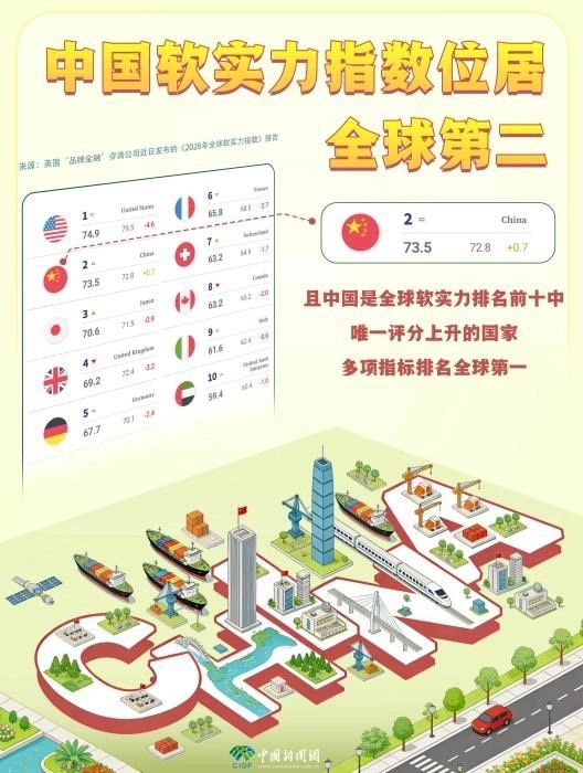 2026全球软实力指数发布 中国国际声誉首次超越美国,英国咨询公司品牌金融发布《2026全球软实力指数》报告,中国以73.5分位列全球第二,是前十中唯一评分上涨国家,多项指标全球第一。国际声誉方面,中国上升9位、美国下降11位,中国首次超越美国。