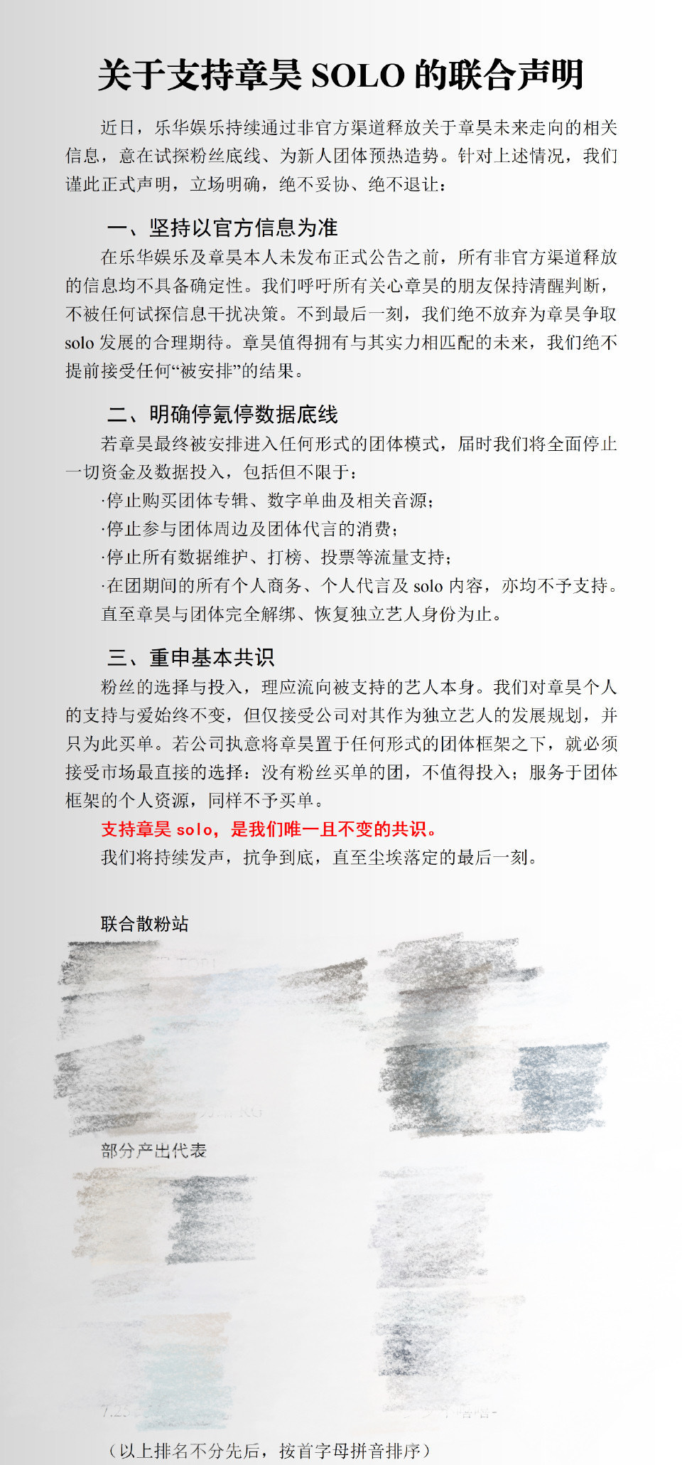 章昊粉丝联合声明 章昊粉丝发布联合声明向乐华维权,坚定支持章昊solo发展。