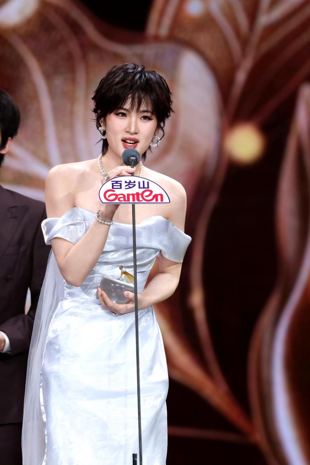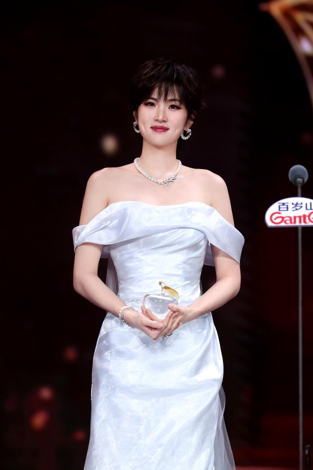 姚安娜一袭冰蓝色露肩鱼尾裙摇曳于红毯,流光面料在暖光下泛着细腻光泽,薄纱拖尾轻拂地面,衬得身姿优雅又利落。利落短发搭配珍珠钻饰,黑金面具与水晶奖杯在手中交映,既是舞台上的优雅盛放,也是对演技的自信宣告。
