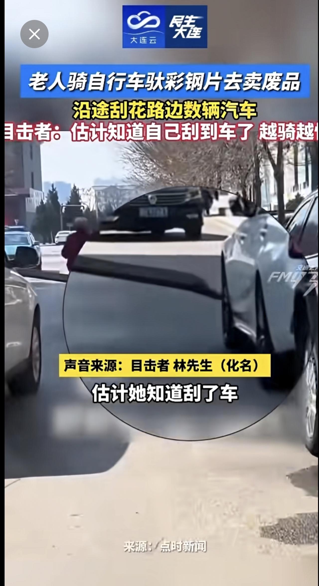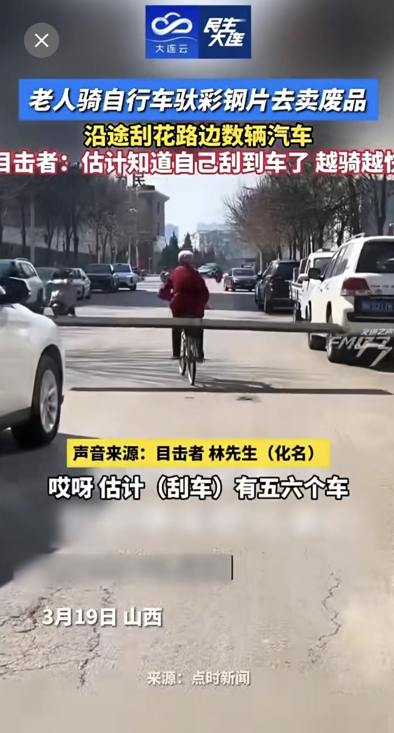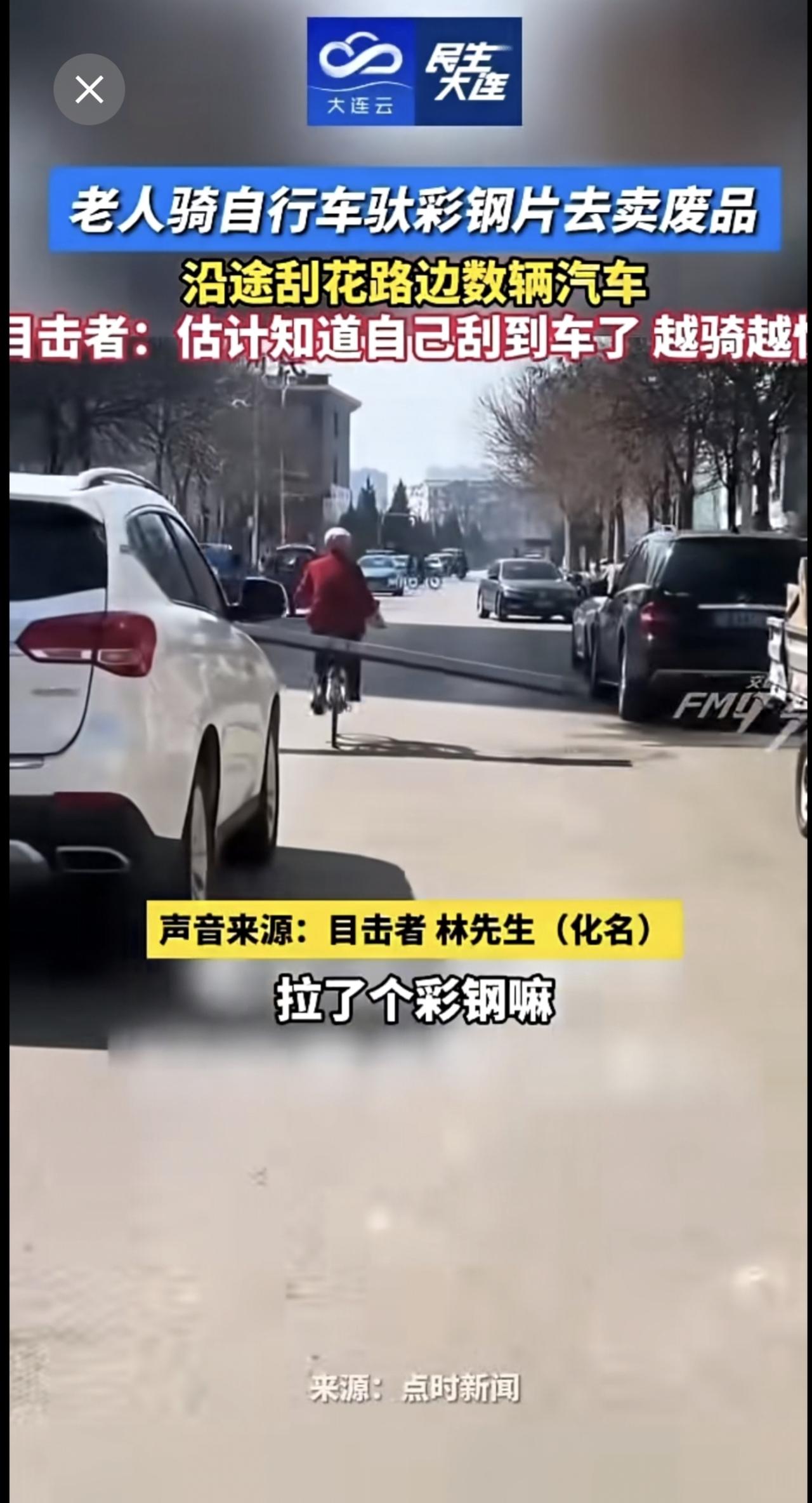 老人骑自行车驮彩钢片去卖废品,沿途刮花路边数辆汽车。目击者:估计知道自己刮到车了