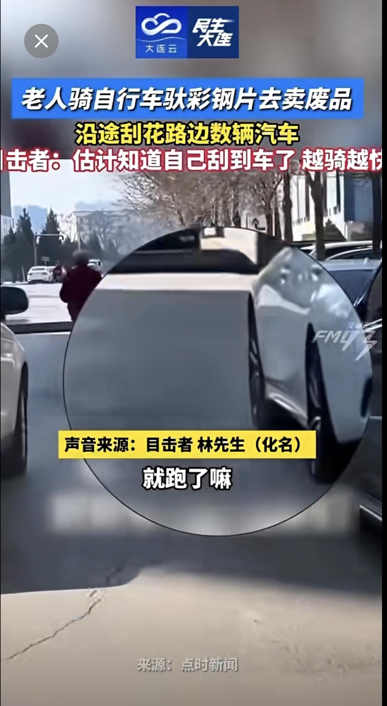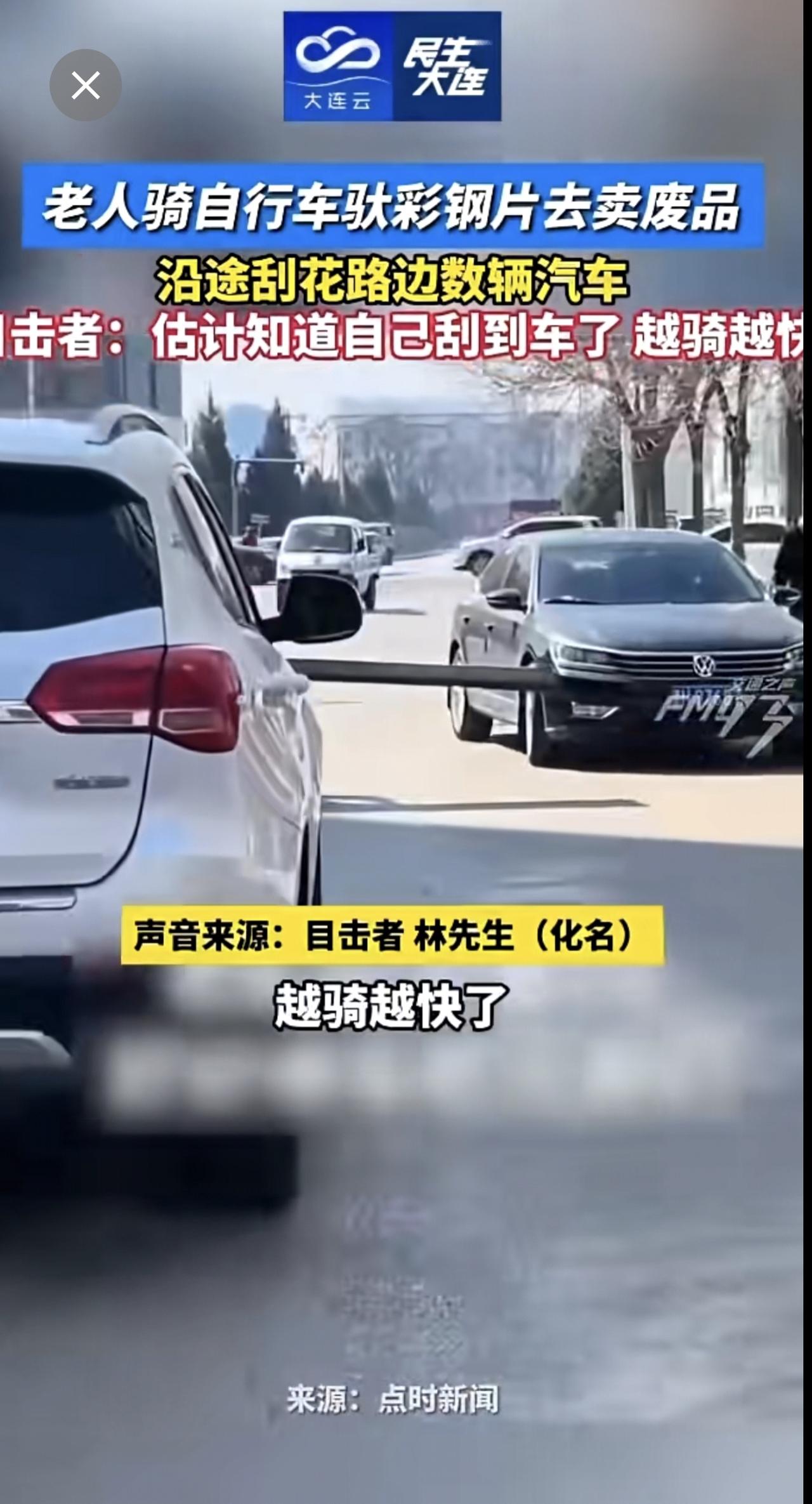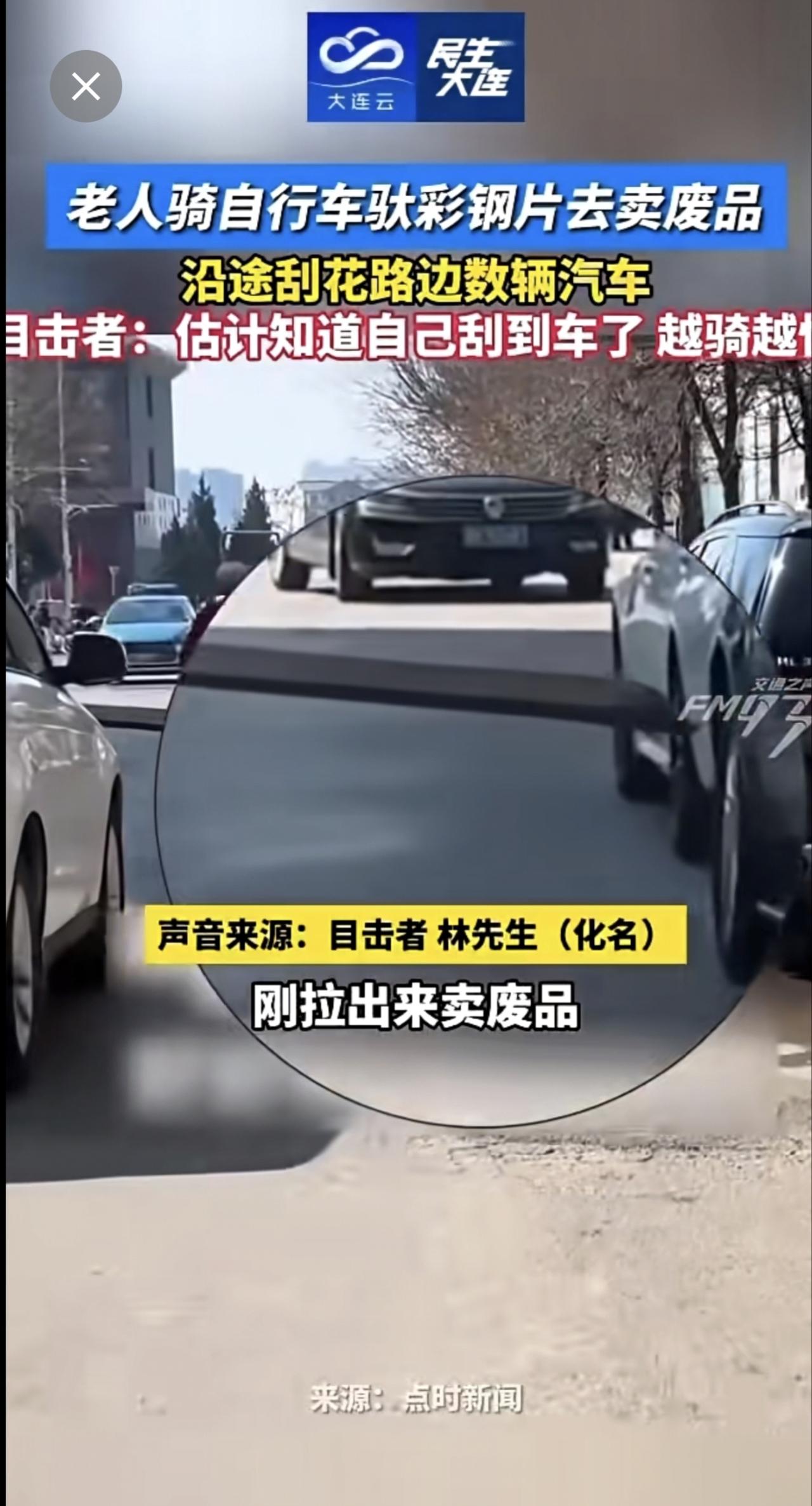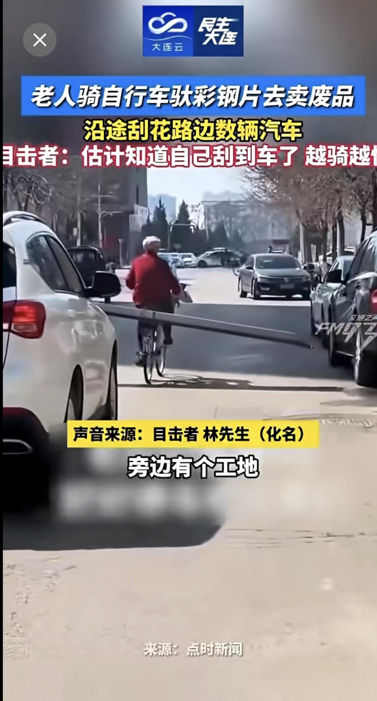 老人骑自行车驮彩钢片去卖废品,沿途刮花路边数辆汽车。目击者:估计知道自己刮到车了,越骑越快!(来源:FM93交通之声)