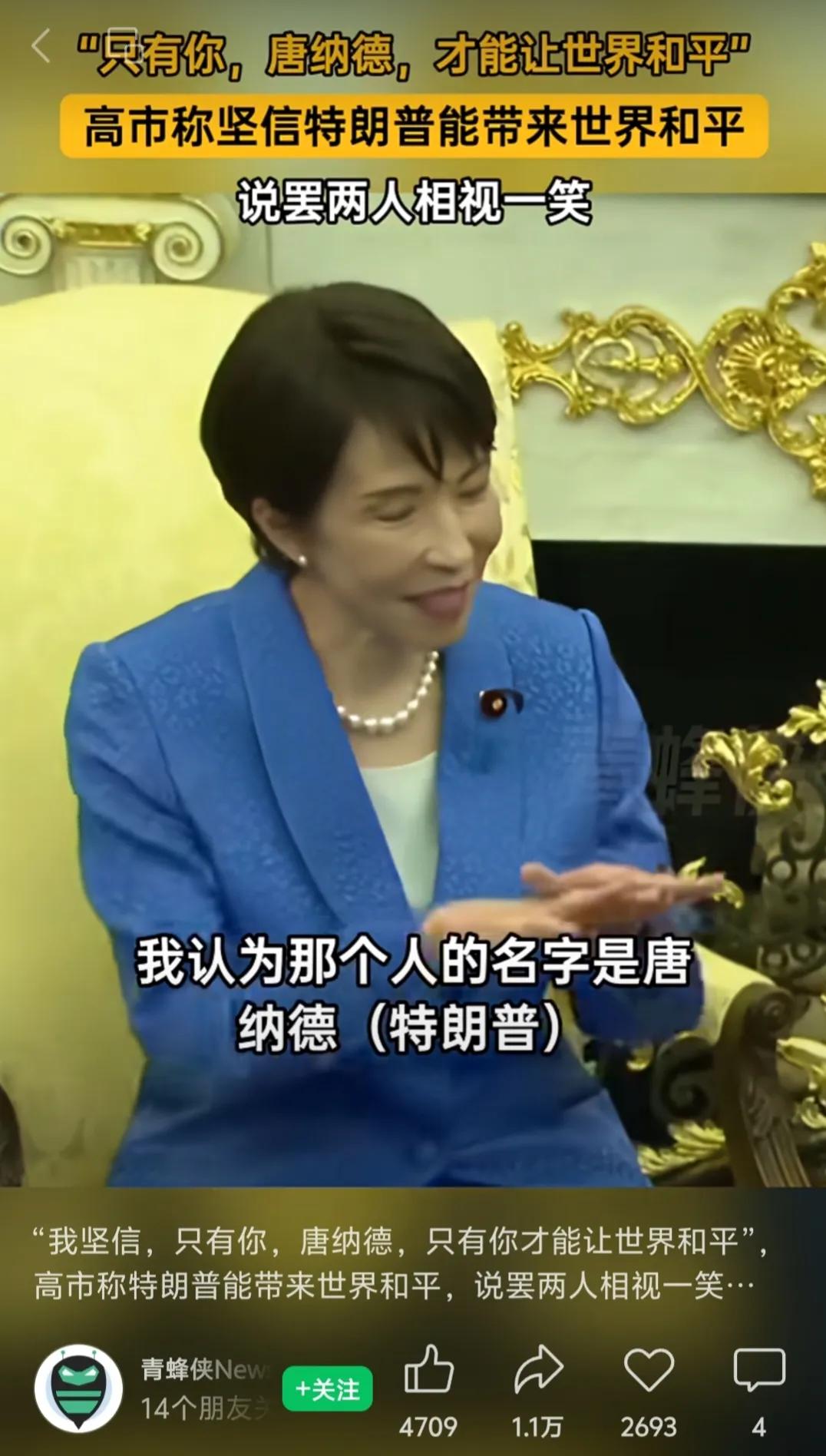 高市早苗这次到美国见老特,彩虹屁是一个接一个,不但夸老特能实现世界和平,还夸老特