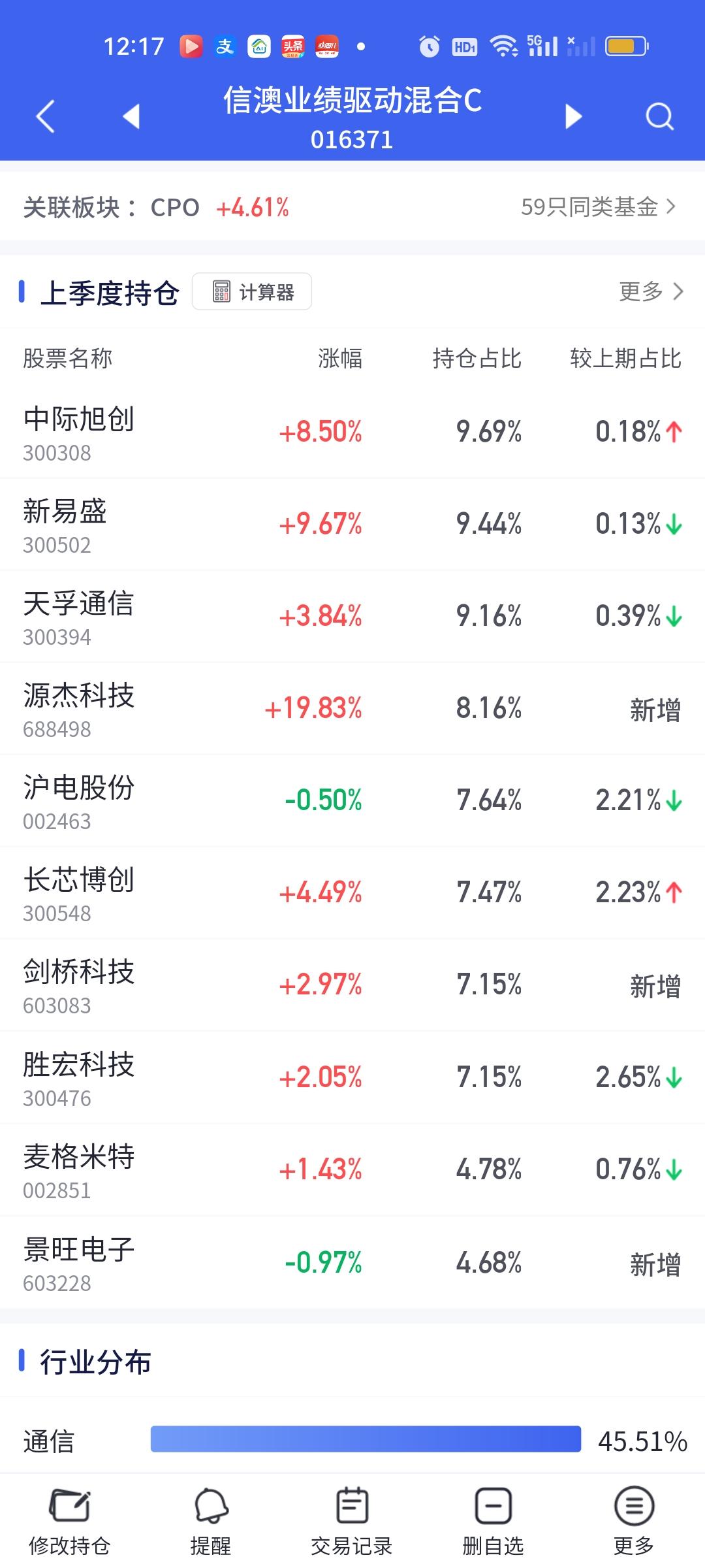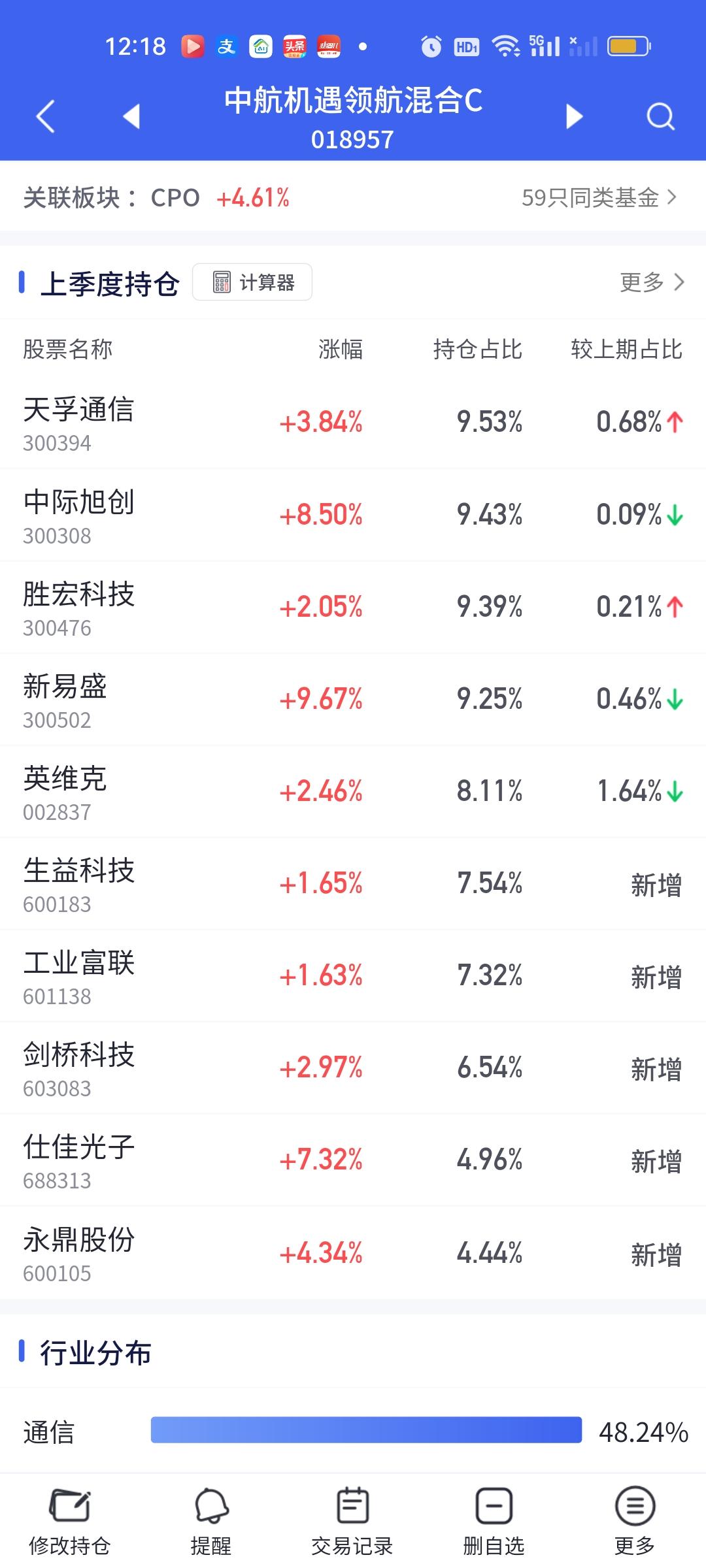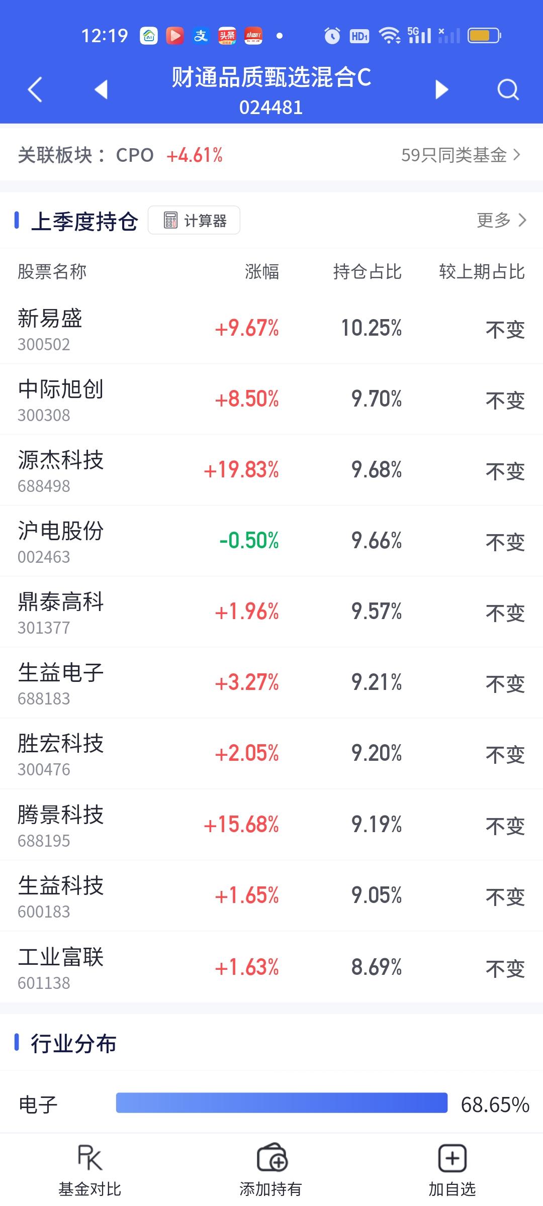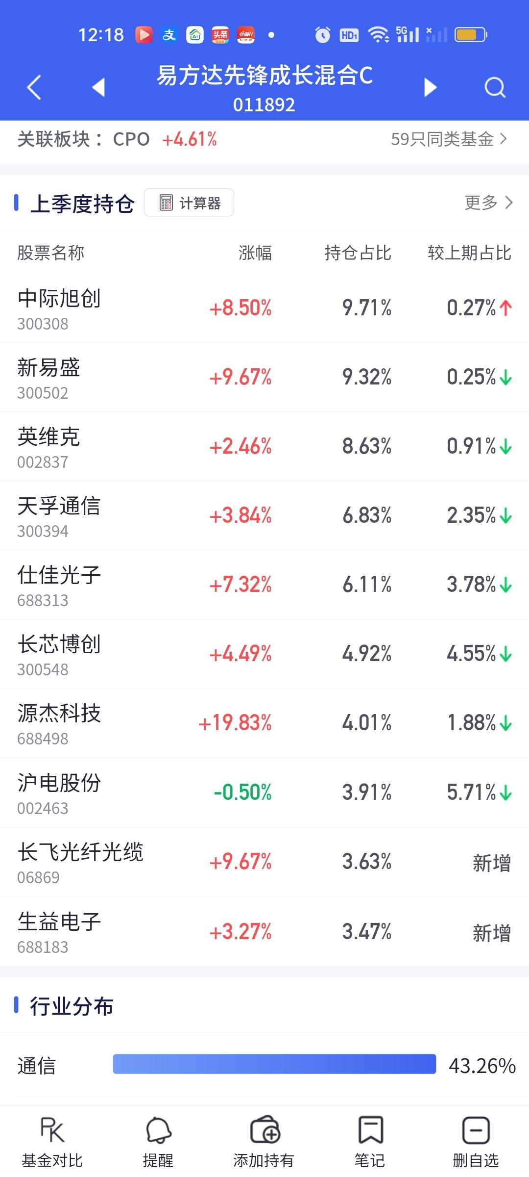 CPO板块的涨幅是真大啊,如果下午可以维持这个涨幅到收盘,那些重仓的朋友们今天赚嗨了。这个浦银安盛真的是后起之秀啊。这表现这态度可要把传统四大豪强(永赢科技智选,信澳业绩驱动,德邦鑫星价值,中航机遇领航)都要比下去了。相比较而言,永赢今天的表现实在太过拉胯。