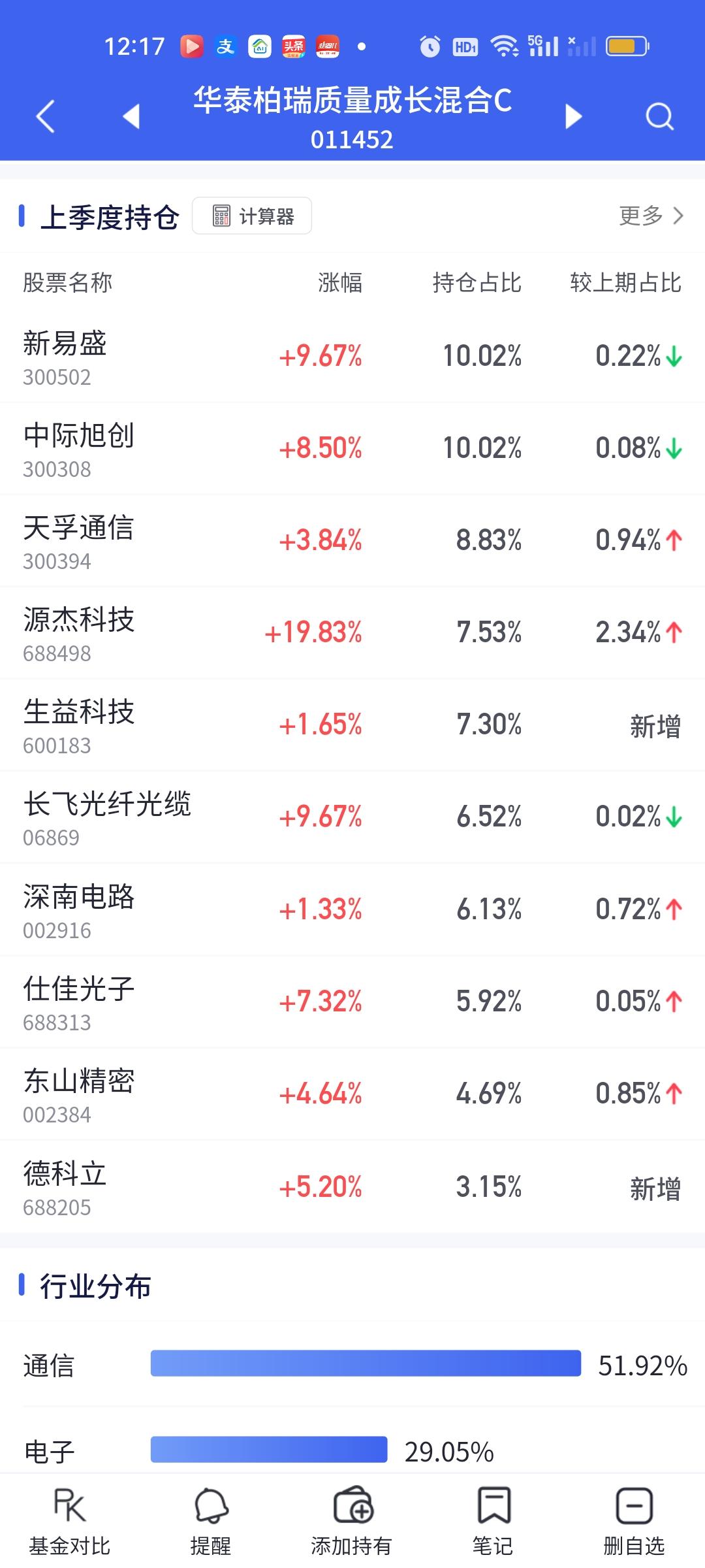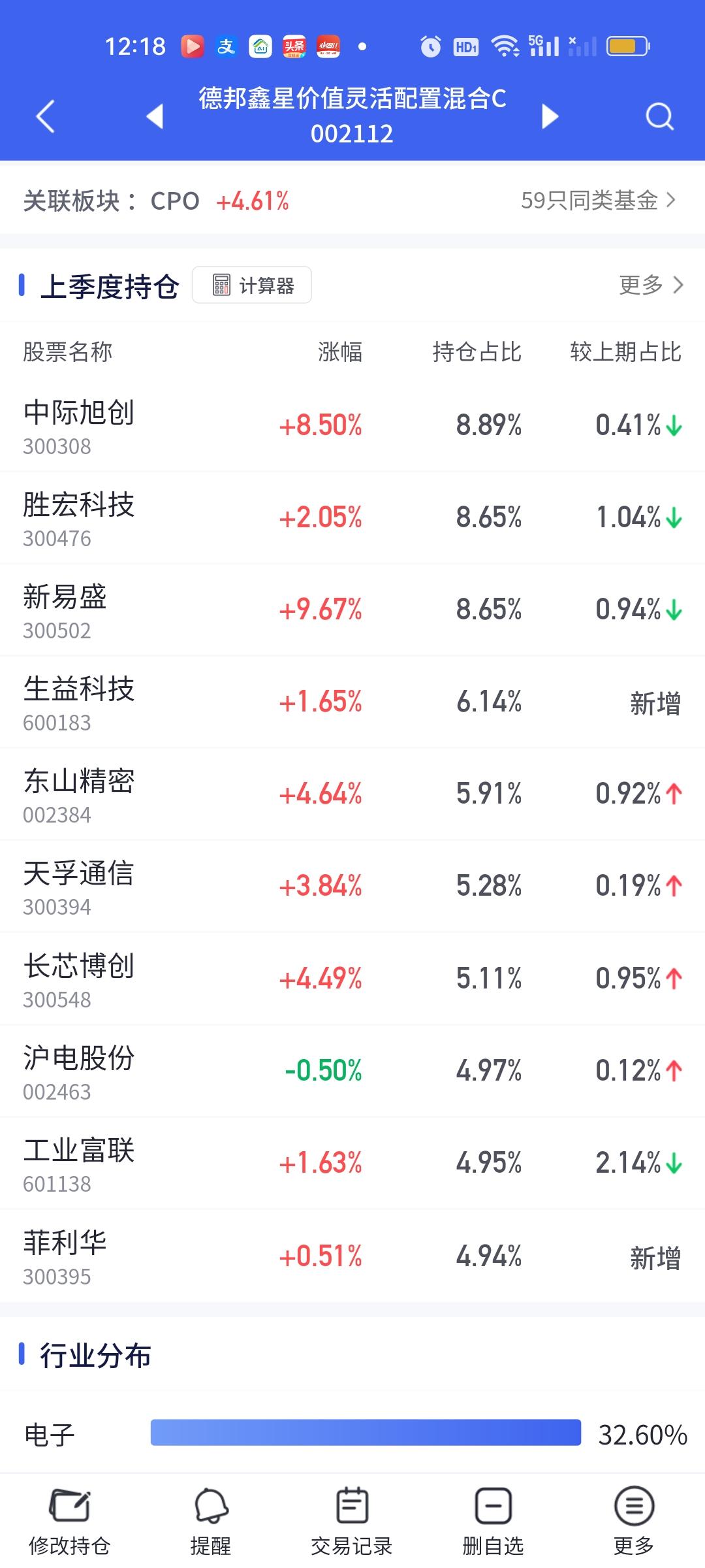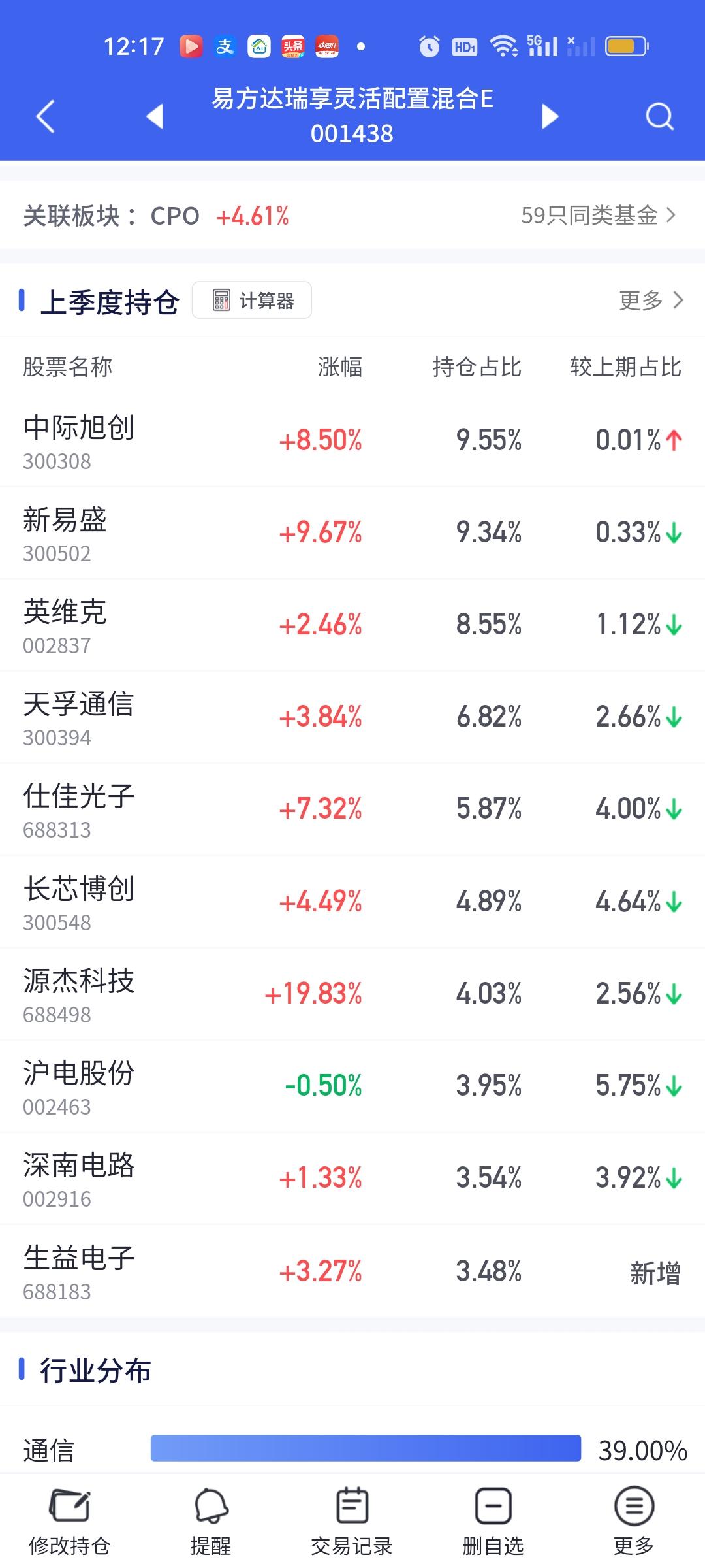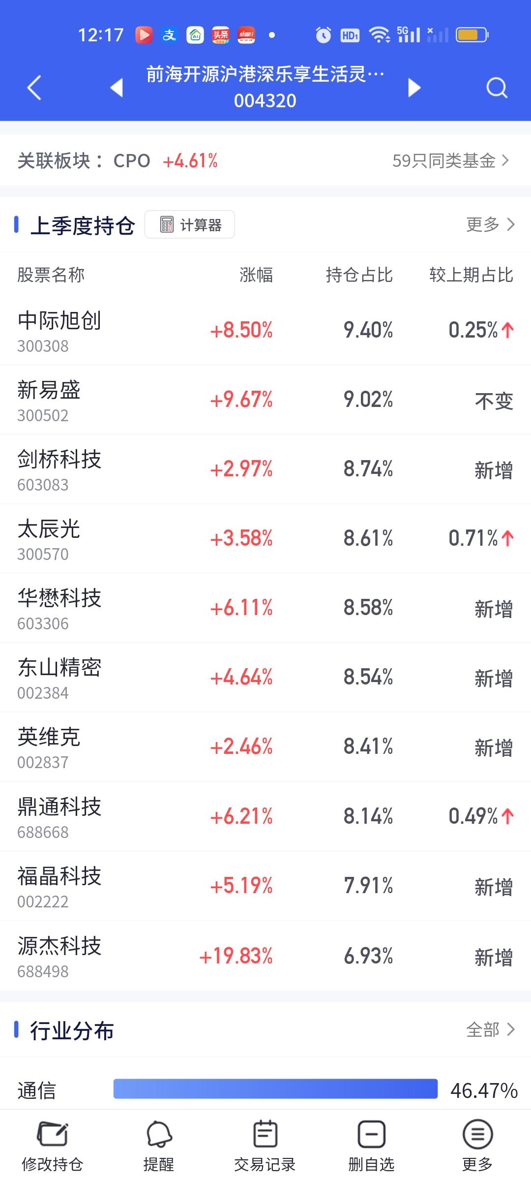CPO板块的涨幅是真大啊,如果下午可以维持这个涨幅到收盘,那些重仓的朋友们今天赚嗨了。这个浦银安盛真的是后起之秀啊。这表现这态度可要把传统四大豪强(永赢科技智选,信澳业绩驱动,德邦鑫星价值,中航机遇领航)都要比下去了。相比较而言,永赢今天的表现实在太过拉胯。