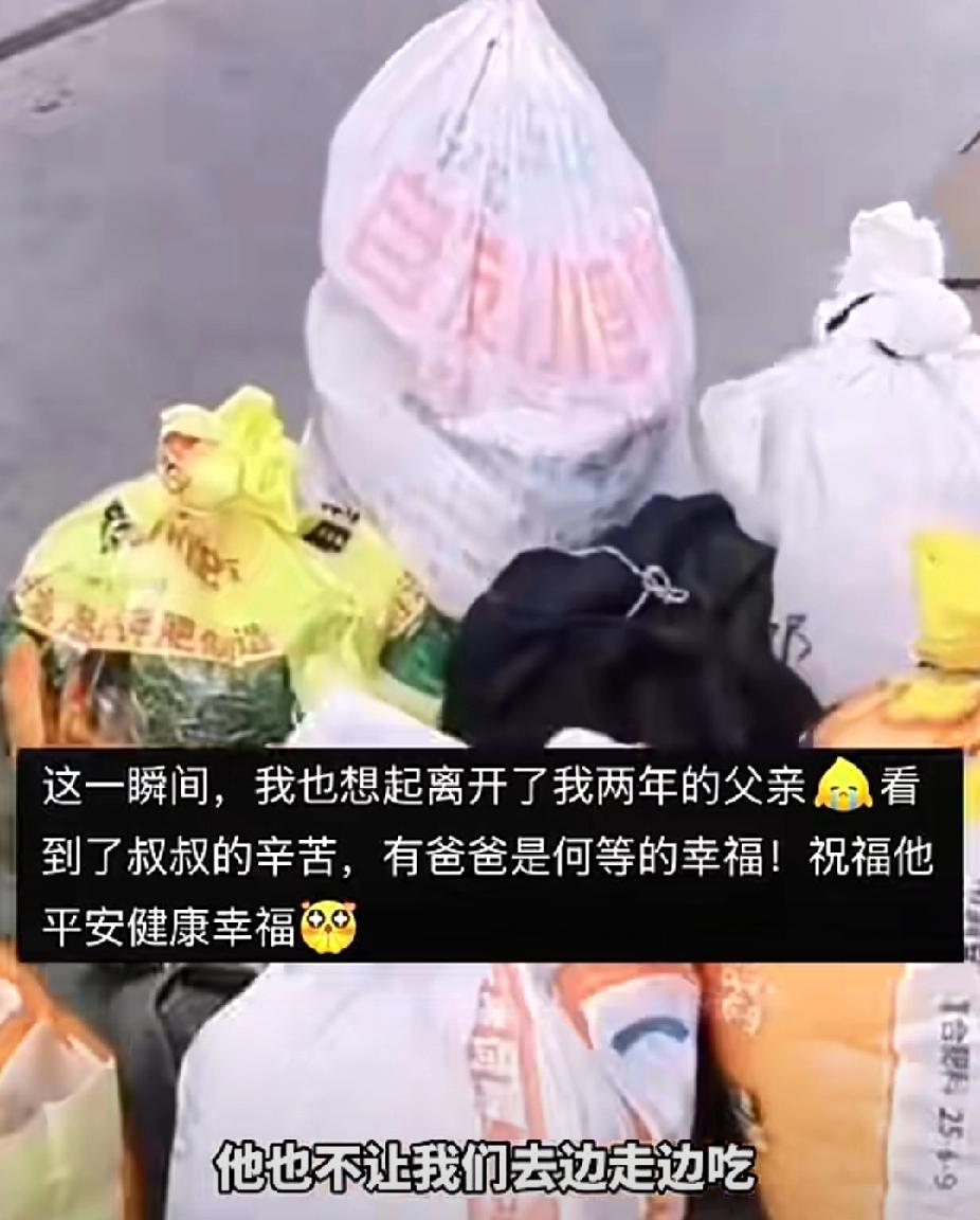 泪目!3月17日,福建厦门的邓女士接从老家来送来百斤特产,见到父亲的那一刻,父亲正在啃馒头! (信息来源:第一眼新闻) 父母的爱永远都是那么的满,那么的朴实! 前几日,福建厦门邓女士74岁的老父亲给邓女士打来电话心疼自己的外孙女:“小孩子少吃点零食,自己做的才健康,家里又榨油了,我给你送去,再给你带点特产。” 一个电话,老父亲便开始装东西,家里种的菜、腌的肉、新榨的油,还有鸡鸭下的蛋,统统都装进了袋子里。 3月17日,邓女士和丈夫带着女儿来车站接父亲。看到父亲的那一刻邓女士哭了,父亲瘦弱的身躯坐在路边,左手拿着一个馒头,右手端着一杯白水。看到女儿的车开过来,他赶紧起身,脸上满是笑意。 看父亲身边大大小小的麻袋,邓女士惊呆了!足足两百多斤,是父亲一个人坐了30多个小时的大巴车带来的。而父亲那么瘦小! 父亲出发前,邓女士没少念叨:“你别坐大巴车,大巴车的车程太久了,你身体受不了。路上一定要在车上买热饭吃,别舍不得。” 可是最终父亲还是坐大巴车来的,一路上没舍得买饭,吃着自己带的馒头。父亲不说缘由,但是邓女士心里明白,因为大巴车可以带着新榨的油。 邓女士的丈夫来来回回搬了好几趟才把东西全部搬上车,累得气喘吁吁。老父亲一个人,是怎么把这些东西带来的呢? 有一句话叫做“有爱可抵万难”,东西很多,多到感觉拿不完。可是老一辈的人都是如此,他们没有太多精致华丽的礼物,也没有太多钱。对于他们来说,家里有的蔬菜瓜果、肉蛋油米,这些最健康最朴实的,就是最好的! 每次从老家回来的时候,爸爸都会给我装一些菜。白菜、菠菜、丝瓜、西葫芦,我的后备箱里总是装了满满的蔬菜。爸爸总是问我:“要钱不?” 在爸爸眼里,我还是以前那个找爸爸要钱买辣条的小姑娘。其实我知道,那是因为爸爸对我的爱从没有变过!