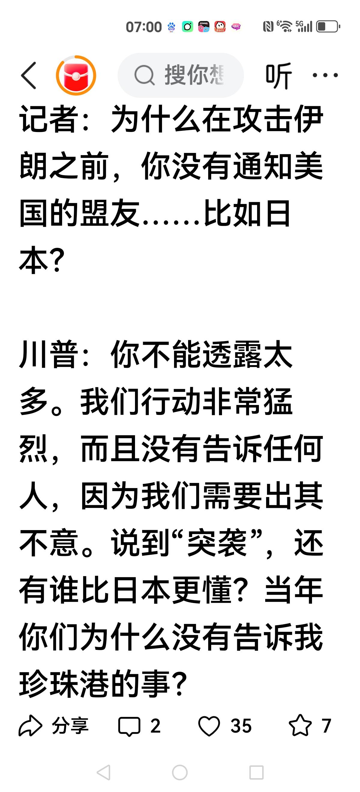 【特朗普的偷袭?】 国内大咖都在嘲笑特朗普,喊人来帮忙,却都不来,看来老美又要崩溃了。 在特朗普见高市早苗记者会上,记者问特朗普为何偷袭伊朗不告诉盟友日本。 局势不明朗的前提下,谁都想明哲保身,但拿下伊朗,都会蜂拥而至。 一架F35是不是被伊朗防空击中成为悬案,也就是转折点?