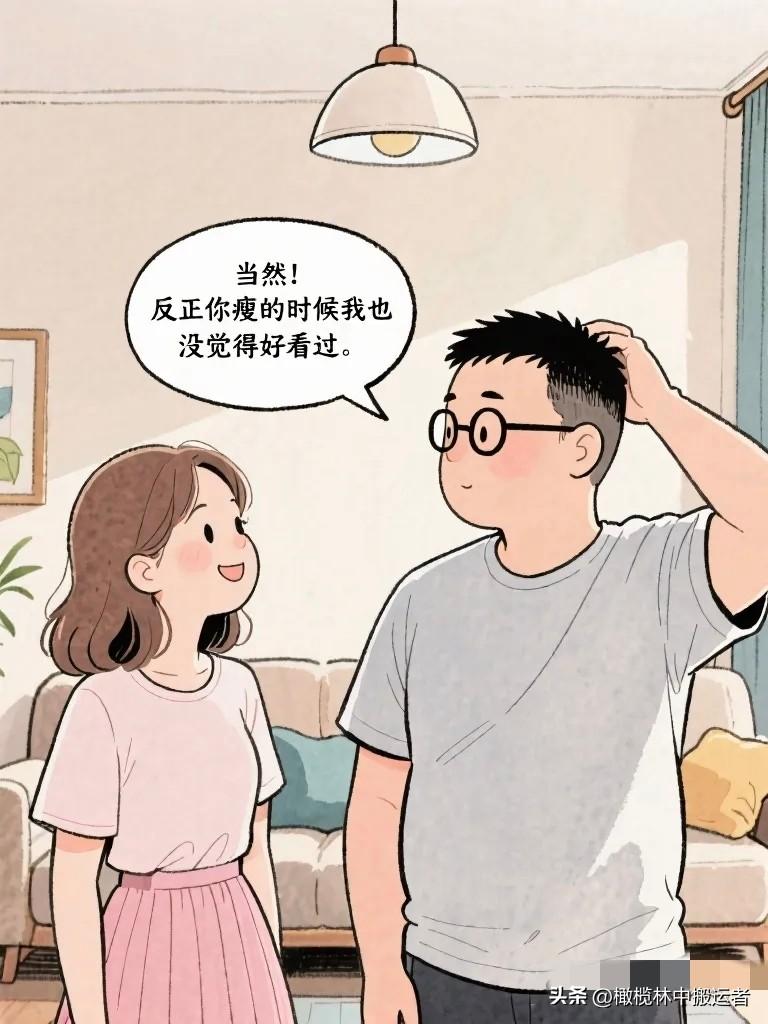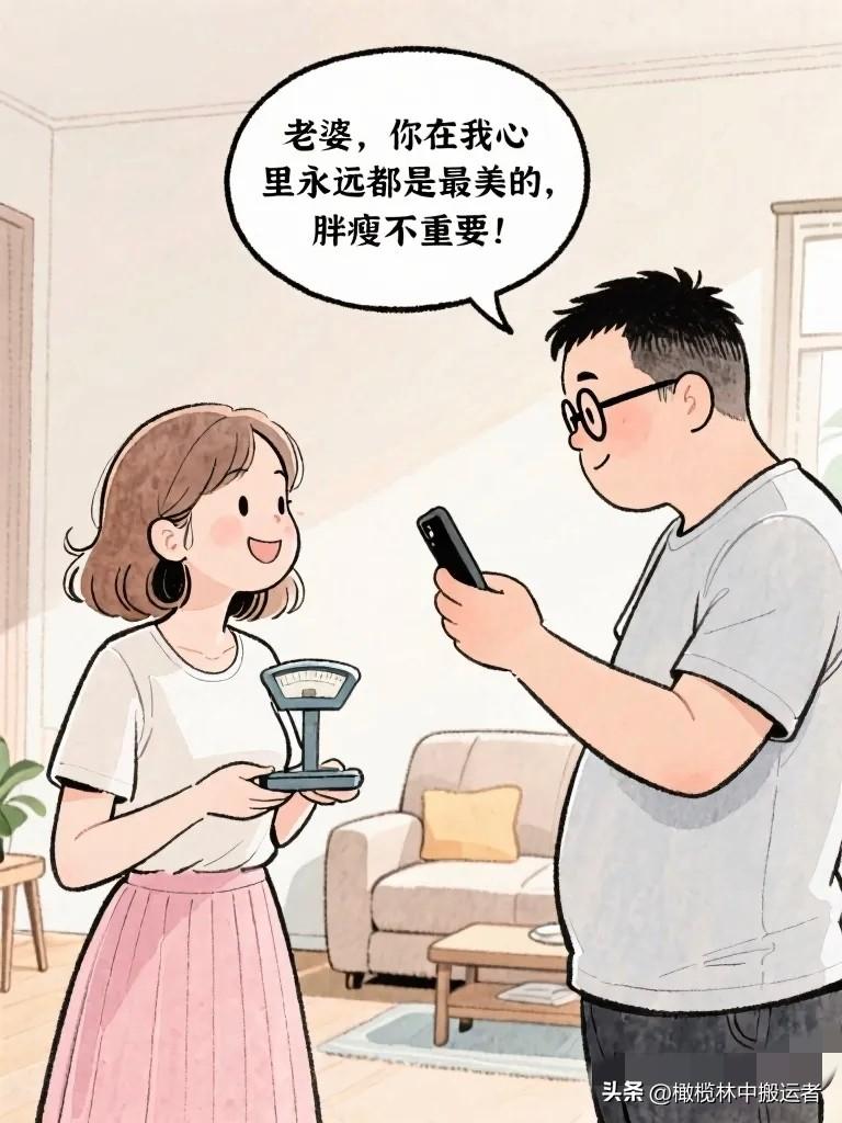 搞笑漫画:老婆捧着秤眼睛都红了:“老公,我又胖了三斤…”老公立马一脸真诚:“你在我心里永远都是最美的,胖瘦不重要!”