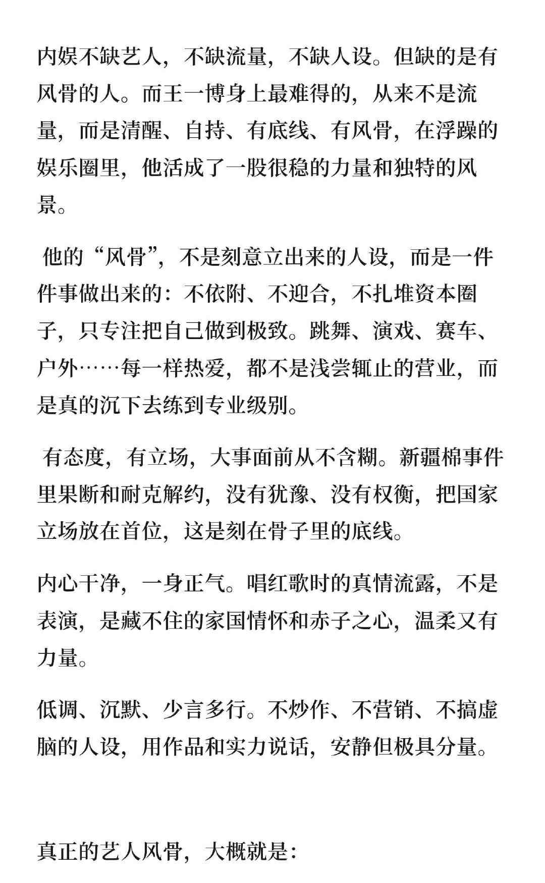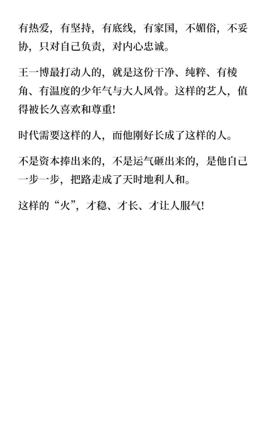 “娱乐圈最缺的是风骨,而王一博有” “真正的艺人风骨,大概就是:有热爱,有坚持,有底线,有家国,不媚俗,不妥协,只对自己负责,对内心忠诚” 而当这样的“风骨”完美集中于一身,本身又有着强大的人格魅力和天赋实力,放眼放去,内娱真的看不到除王一博之外的第二人,而他,才仅仅28岁。 这样的王一博,又怎能不让他人妒之恨之无所不用其极的想取而代之?