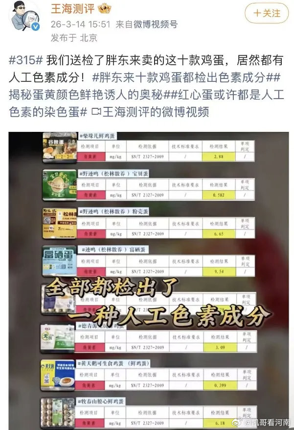 河南 反转!王海打假胖东来最新局面,胖东来硬刚到底,监管已介入!一枚鸡蛋引爆全网!315刚过,知名打假人王海团队就对“零售巨头”胖东来出手,一场关乎食品安全与行业规则的大战正式打响。事件导火索:鸡蛋里的“色素”争议3月13日,王海测评团队发布视频,称从许昌胖东来采购10款热门鸡蛋送检,全部检出角黄素(又名斑蝥黄)。其中,野迹鸣松林散养富硒蛋检测值达9.54mg/kg,黄天鹅可生食蛋也检出0.399mg/kg。王海团队直指核心:我国蛋禽饲料中角黄素允许添加量上限为8mg/kg,野迹鸣的数值已超饲料标准,暗示鸡蛋涉嫌违规人工染色、虚假宣传,用饲料标准判定终端食品,直接坐实“超标”指控 。胖东来硬刚回应:三大核心态度面对舆论重压,胖东来未走道歉、下架、冷处理的常规路线,第一时间发布官方声明,态度强硬且清晰:1. 直击标准漏洞:明确指出国家暂无鲜鸡蛋产品角黄素限值标准,王海团队用饲料添加剂标准评判终端鸡蛋产品,属于适用标准错误,既无法律依据,也不符合科学逻辑。