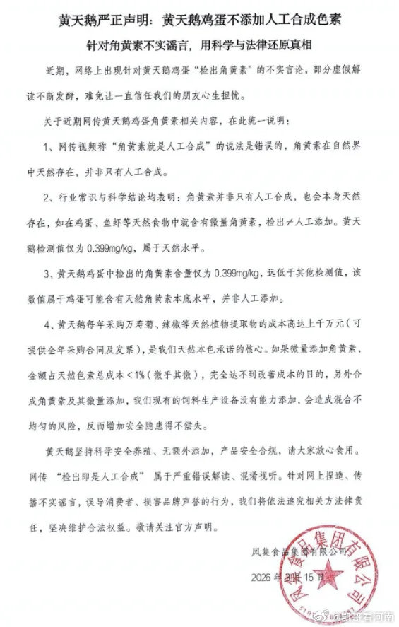 3. 明确追责底线:若最终查实存在质量问题,将第一时间公示、下架召回并依法承担全部责任;若检测无问题,将坚决通过法律途径维权,追究相关个人、自媒体及平台的侵权责任。黄天鹅同步发声:绝非人工添加作为涉事高端鸡蛋品牌,黄天鹅也紧急声明:检出的微量角黄素为天然本底含量,并非人工添加 。公司每年投入超千万元采购万寿菊、辣椒等天然植物提取物,检出数值远低于天然水平,人工添加得不偿失 。最新进展:王海态度软化,事件再反转3月18日,王海测评发布道歉视频,承认此前表达存在失误,对黄天鹅老总造成误解。同时澄清:好蛋坏蛋并非由角黄素单一因素决定,仅做测评参考,不推荐任何鸡蛋。目前,监管复检结果尚未出炉,这场“打假vs巨头”的博弈,仍在等待权威定论。网友热议:信任与规则的博弈- 支持胖东来:“检出≠违规,没鸡蛋标准就定罪,太牵强!”
