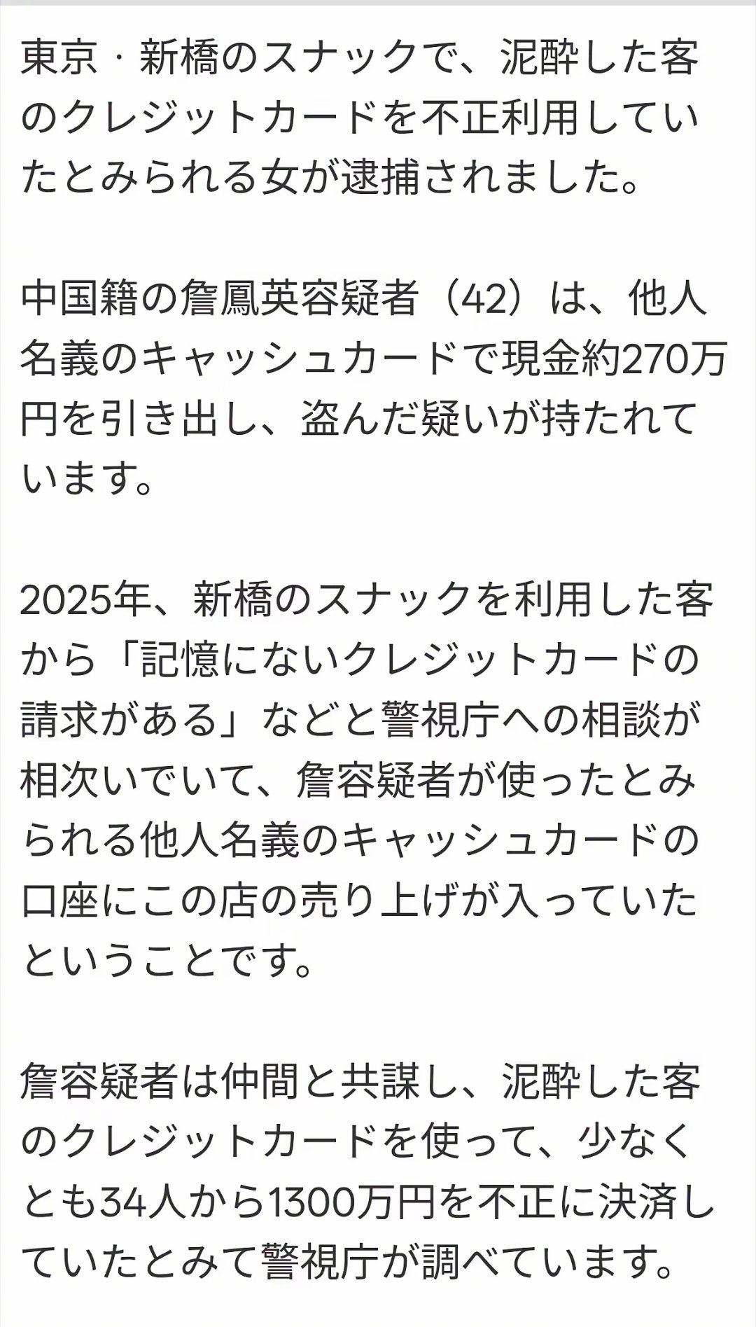 中国42岁女子在日本酒吧陪酒,等客人喝醉后,然后,盗刷酒醉客人的信用卡,最少从34名酒醉客人那里盗刷了1300万日元。