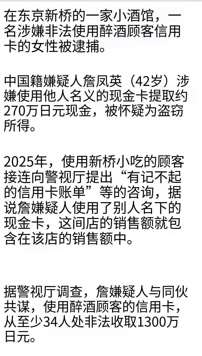中国42岁女子在日本酒吧陪酒,等客人喝醉后,然后,盗刷酒醉客人的信用卡,最少从3