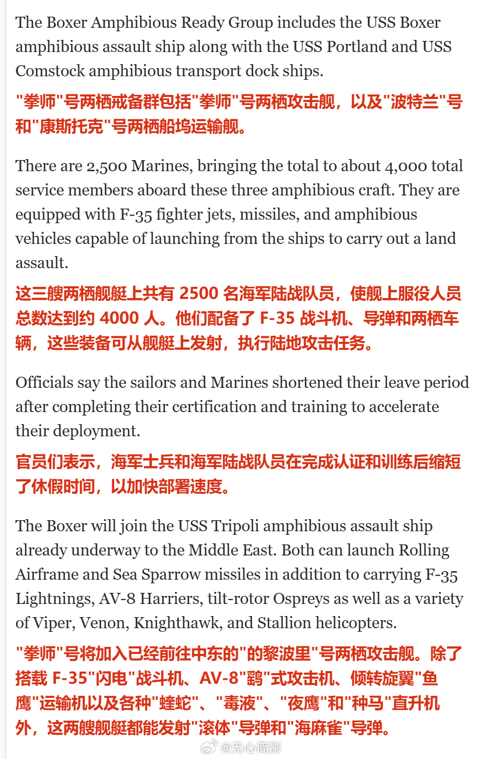 美国军方官员向 Newsmax 透露,已加速部署数千名海军陆战队员和水兵,以增援对抗伊朗的部队。美国海军“拳师”号两栖攻击舰编队及第 11 海军陆战队远征部队提前启程,搭载约 4000 名人员(包括 2500 名海军陆战队员),配备飞机、导弹及突击车辆。他们将与包括“的黎波里”号在内的其他舰艇会合。