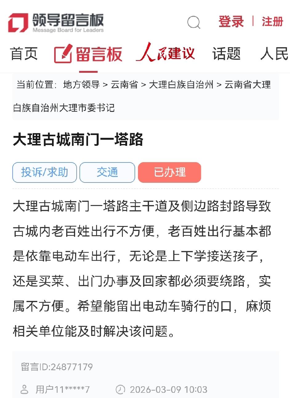 网民留言反映大理古城南门一塔路堵封路致出行不便的问题 3月9日网民通过人民网领导留言板给大理市委书记留言: ✍📩➡️大理古城南门一塔路 大理古城南门一塔路主干道及侧边路封路导致古城内老百姓出行不方便,老百姓出行基本都是依靠电动车出行,无论是上下学接送孩子,还是买菜、出门办事及回家都必须要绕路,实属不方便。希望能留出电动车骑行的口,麻烦相关单位能及时解决该问题。 📢📢📢2026-03-19 19:01 大理市公安局交通警察大队官方回复 您通过人民网领导留言板给大理市委书记的留言收悉,大理市人民政府高度重视,及时转由大理市公安局交通管理大队处理,现将有关情况回复如下: 您反映的“大理古城南门一塔路堵封路致出行不便”的问题。大理古城一塔路及周边集广大原居民住户、商铺、学校及酒店(客栈)为一体,是大多外来游客必经聚集大理古城南门,人车出行冲突,交通通行缓慢,社会治安维稳隐患大。随着大理古城旅游品牌的不断提升,外来游客日益增多,特别是近年来大理旅游品牌的不断提升,出租车、三轮车乱停乱放、流动摊贩占道经营等现象尤为突出,给城市形象管理和交通秩序带来极大挑战。 大理镇人民政府于2025年9月27日向社会发布《大理古城街区及周边部分道路实行24小时交通管制通告》,从2025年10月1日起对一塔路(绿玉路楼至双鹤)实行24小时交通管制,管制对象为管制区域内的机动车、非机动车(含二、三轮电动车,共享自行车)、畜力车、四轮电动车等,应急救援、特殊勤务和报备审批车辆除外。