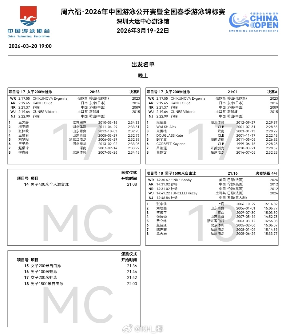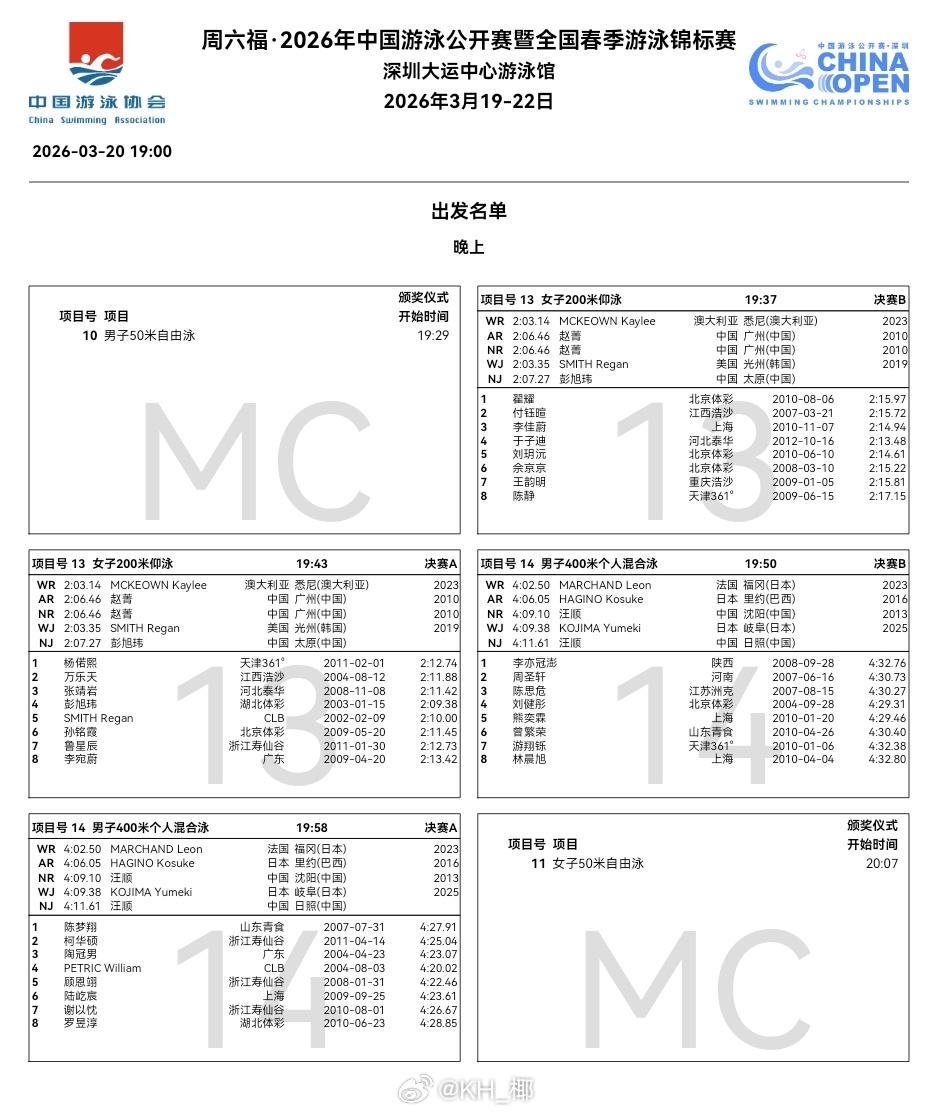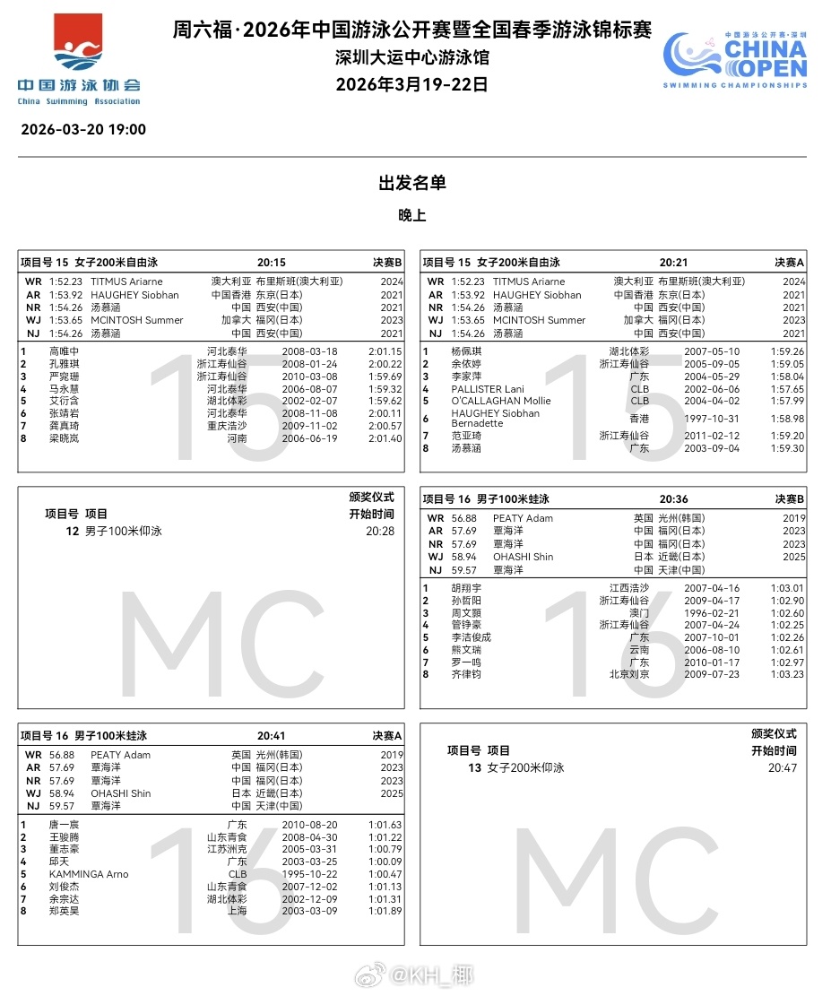 2026年中国游泳公开赛 今晚秩序单🇿🇦Pieter Coetze弃权50自,陈昊递补进入A组决赛