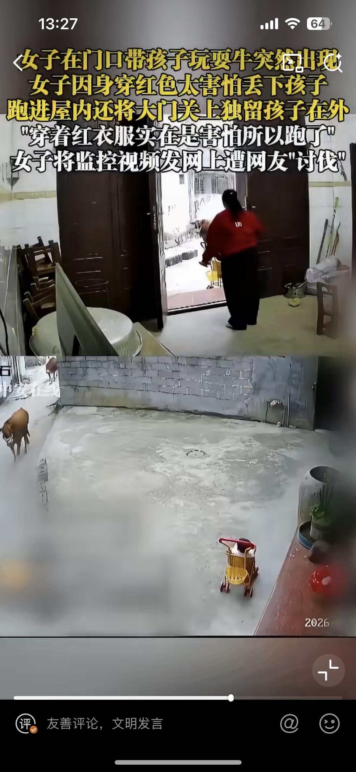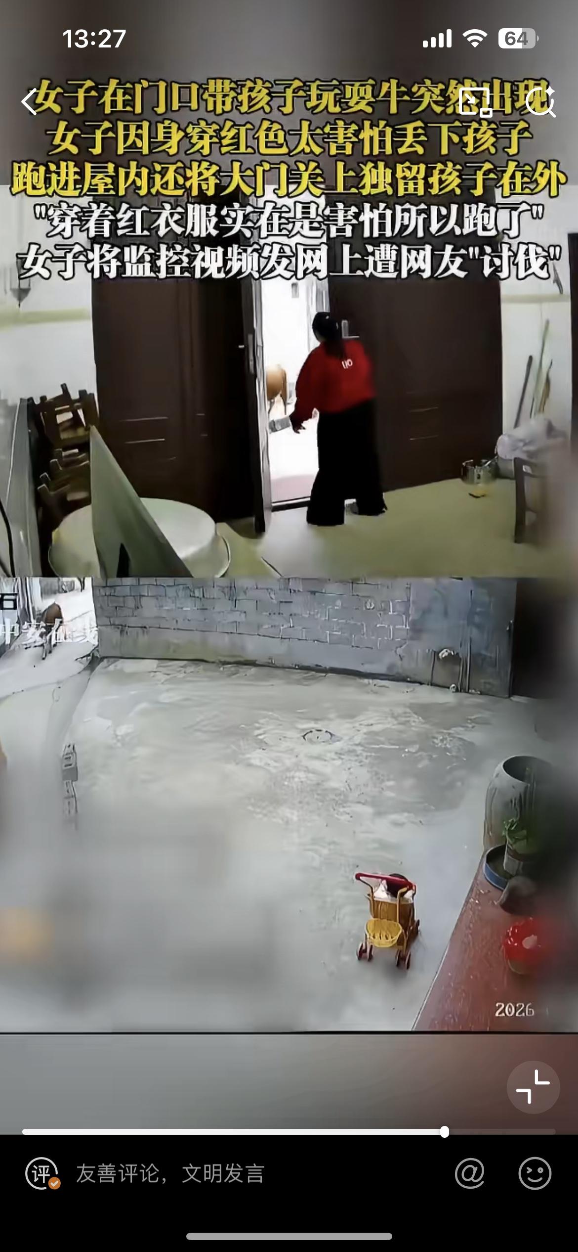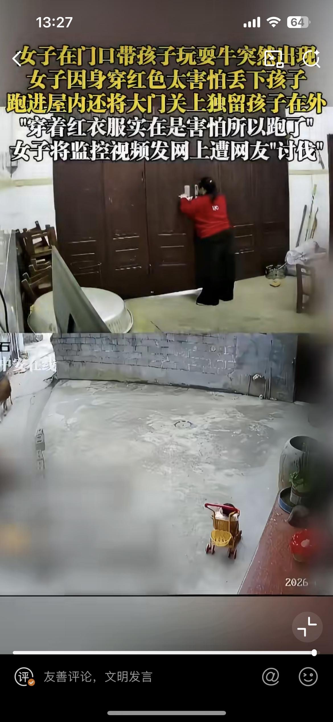 广西一女子见一头牛冲进自家院子,抛下孩子,关门逃跑引发争议。当时女子正带着孩子在院子里面。突然闯进了一头牛,朝女子的方向冲过来,女子非常害怕,抛下孩子走进客厅,关上了大门。这应该是女子本能的反应,害怕、恐惧,而忘了要保护孩子。当然还有很重要的一点,女子当天穿的是红色的衣服,牛对于红色,它就会不自主的产生攻击性。你们觉得该女子的做法对吗?