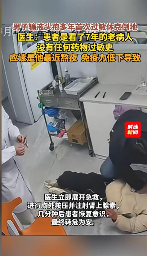 “千万别再熬夜了!”近日,江苏苏州,一男子在诊所打了头孢。输液快结束时,医生发现他的嘴唇有严重水肿,起了过敏反应。刚想给用药,男子就休克倒地了。医生赶紧展开急救,又给他注射了肾上腺素,最终转危为安!医生:他以前头孢不过敏! 都知道熬夜伤身,不仅第二天没什么精神,连抵抗力都会下降。可事实上,熬夜带来的不良反应比预想的还要严重,过敏、休克、猝死都有可能。 据媒体3月18日报道,事发当日,男子熬夜后到诊所输液,打了头孢。快要结束时,医生发现他眼睑、嘴唇都起了水肿,出现了过敏反应,正要给他用抗过敏药时,男子突然间倒地,失去了意识。 医生见状,赶紧上前急救,一边做胸外按压,一边给注射了肾上腺素。过了几分钟,男子终于醒了过来,脱离了危险。 据医生描述,这位男子是他诊所里的老病人了,已经搁这儿看了7年的病,之前也没有任何的药物过敏。 在他的诊所里,头孢打了六七年了,这还是第一次出现过敏反应。医生推测,是他最近熬夜后免疫力低下的缘故。 网友看后表示,这个危害这么大的么?不过敏的人都会过敏,以后可得小心点了。年轻的时候,熬夜是家常便饭,现在想起来真是一阵阵的后怕! 信息来源:《男子输液头孢多年首次过敏,突发休克倒地失去意识,医生:患者是看了7年的老病人,没有任何药物过敏史,应该是他最近熬夜,免疫力低下导致》时速新闻
