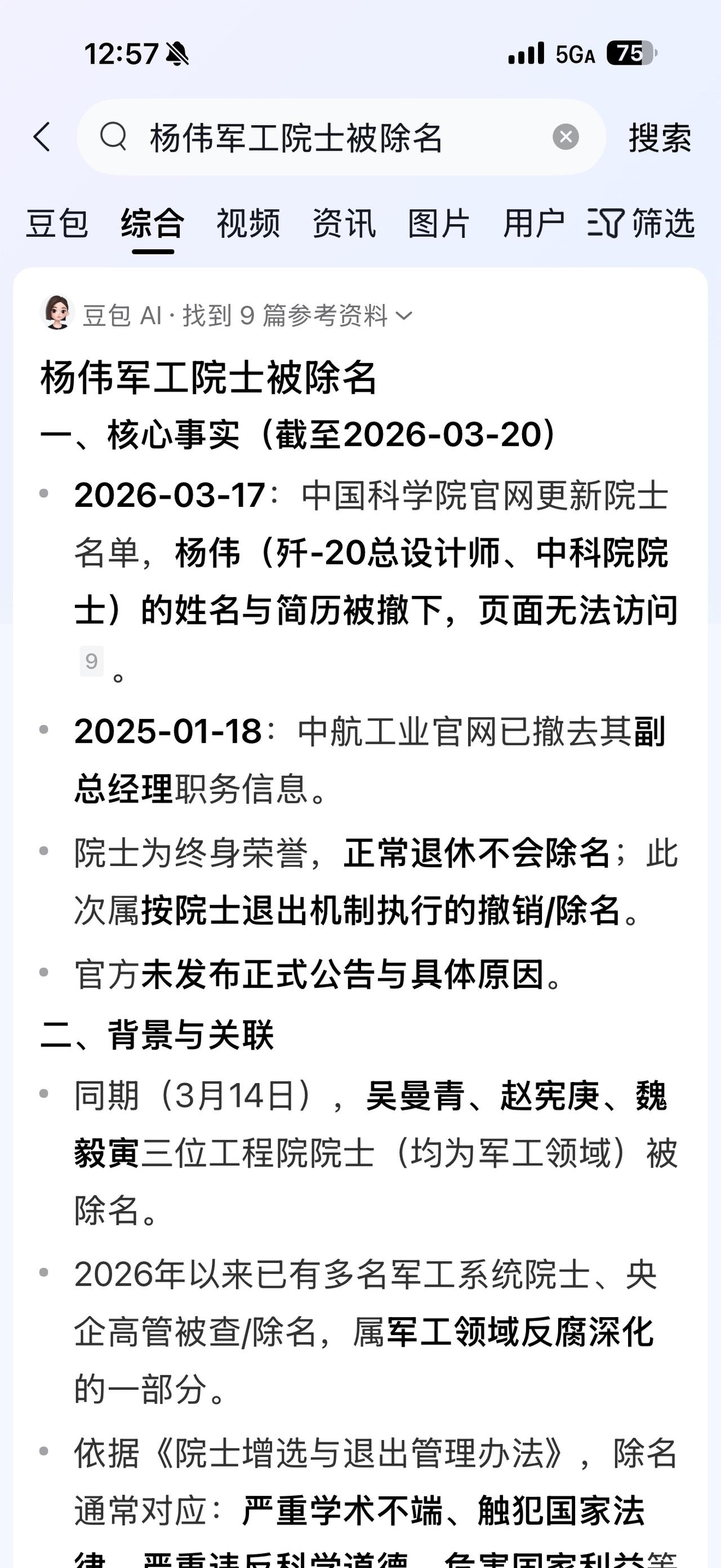 第一次,我希望四位院士如果是贪污还好,起码不是其它更严重的罪行! 只能说“两全其害取其轻”!看看他们主持研发的项目,大家可能就会认同我的观点! 歼20总师、空警500总师、核武器专家、导弹制导专家! 一声叹息…… 图片来自豆包搜索!