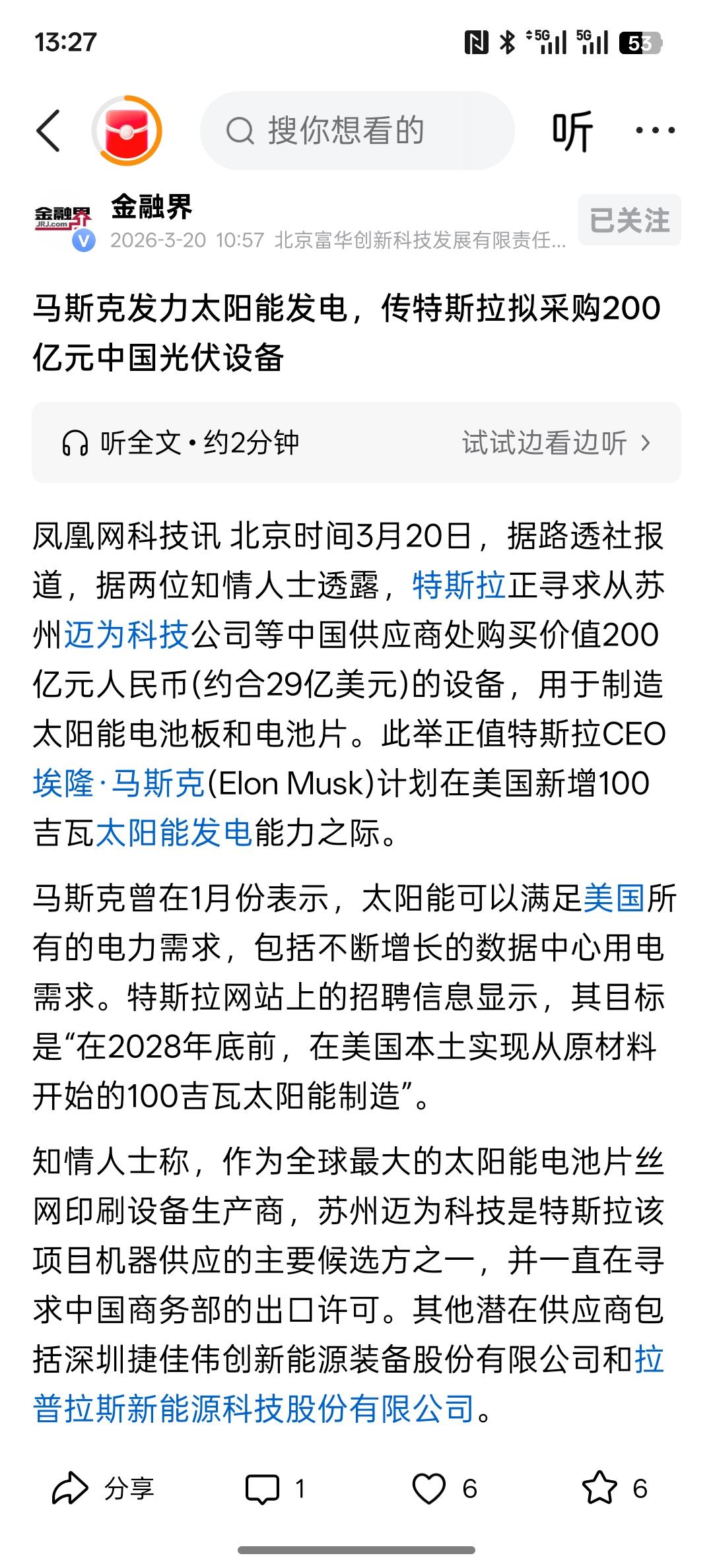 利好消息,光伏板块要大特斯拉计划采购中国光伏设备?企业回应:确有此事,根据最新消息公布,估计要买29亿美元的中国光伏设备!特斯拉要新增太阳能发电来解决自身能源问题,中国在光伏设备发展拥有很强的优势!因为马斯克未来对太空光伏非常感兴趣,甚至要在太空建立数据中心,那太空光伏必然成为很多国家要发展的方向,而中国也在推动未来的太空光伏发展!未来全球其他国家也会发展新型能源。经过这一次美国与伊朗的军事冲突,让很多国家也感受到单一能源结构的为难之处