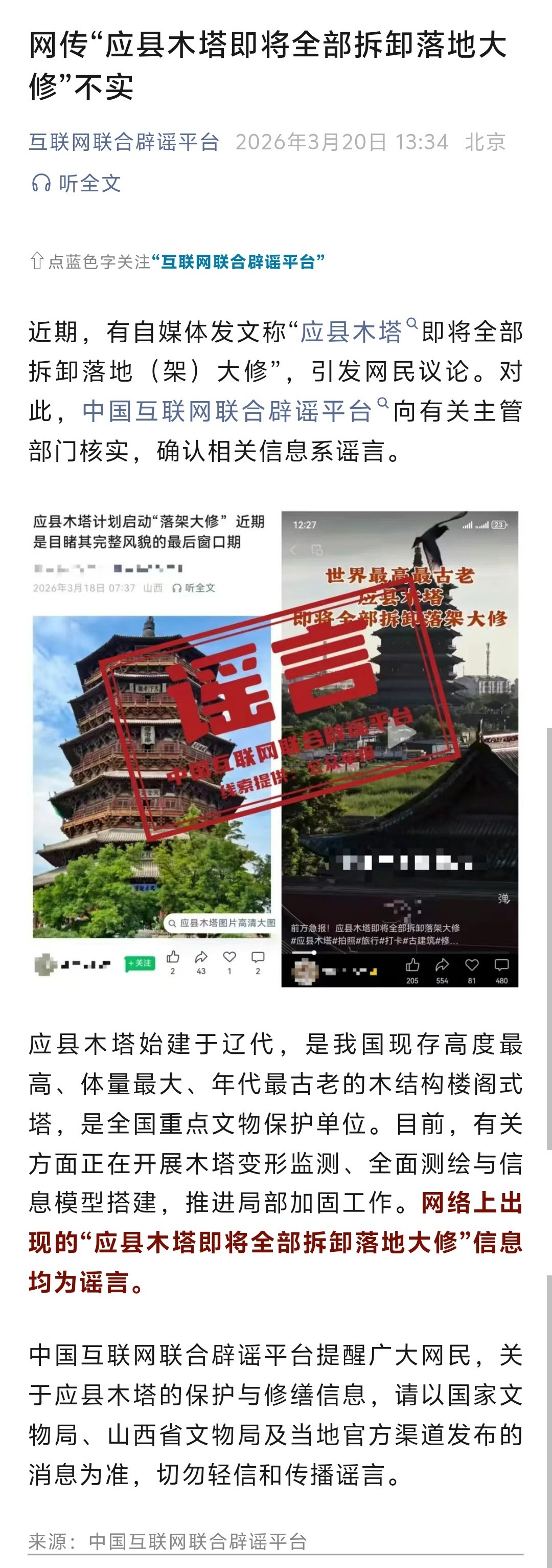 【应县木塔即将全部拆卸落地大修系谣言】当地辟谣应县木塔即将全部拆卸落地大修 近期,有自媒体发文称“应县木塔即将全部拆卸落地(架)大修”,引发网民议论。对此,中国互联网联合辟谣平台向有关主管部门核实,确认相关信息系谣言。应县木塔始建于辽代,是我国现存高度最高、体量最大、年代最古老的木结构楼阁式塔,是全国重点文物保护单位。目前,有关方面正在开展木塔变形监测、全面测绘与信息模型搭建,推进局部加固工作。网络上出现的“应县木塔即将全部拆卸落地大修”信息均为谣言。中国互联网联合辟谣平台提醒广大网民,关于应县木塔的保护与修缮信息,请以国家文物局、山西省文物局及当地官方渠道发布的消息为准,切勿轻信和传播谣言。