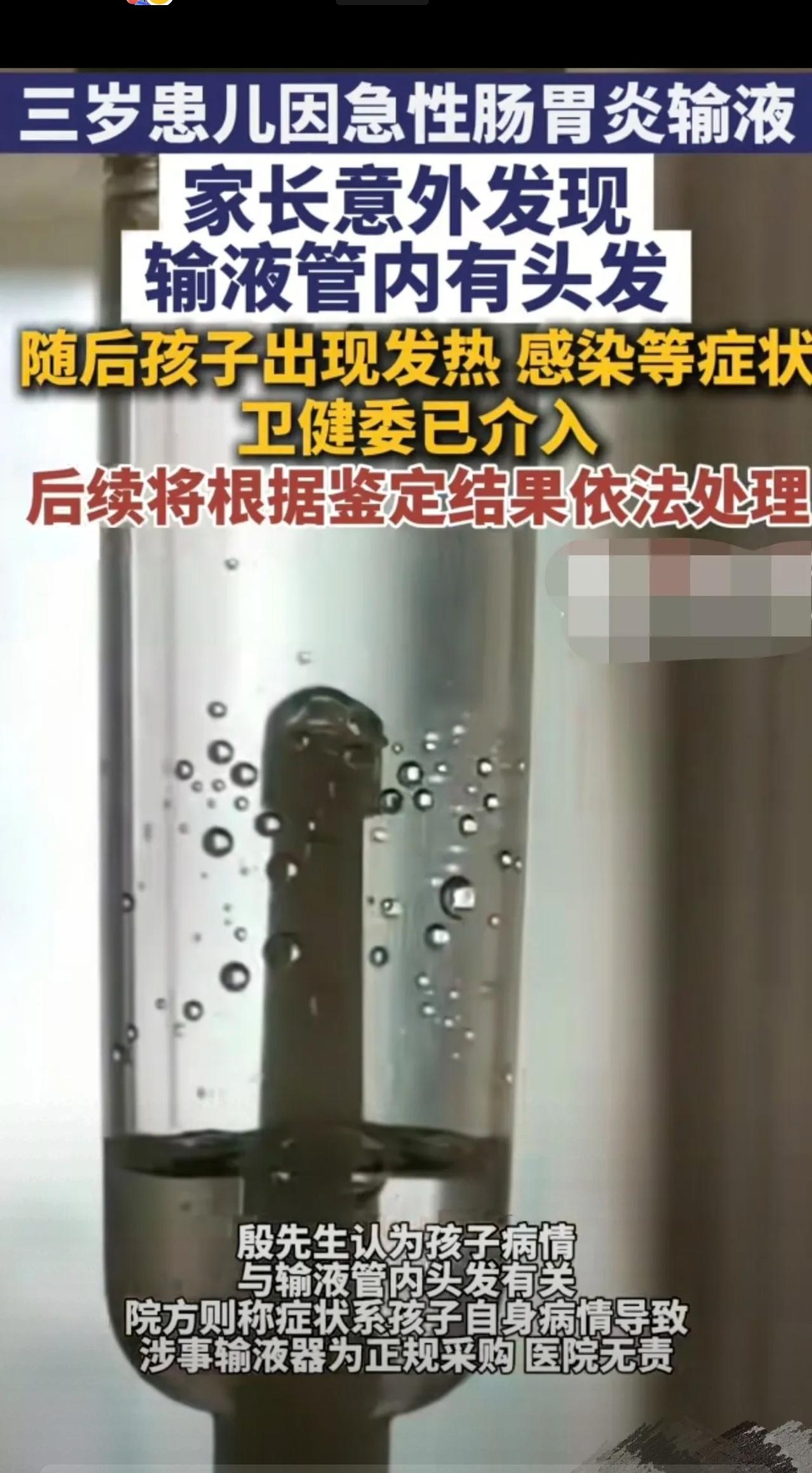 江苏南京,男子带3岁孩子在医院输液时,偶然发现输液管里有根头发,之后,孩子就有发热、感染症状了,男子认为就是头发导致的。可医院认为和头发无关,是孩子自己的病情导致加重的,让男子去起诉…… 今年2月,殷先生带着3岁的儿子,因为急性肠胃炎去医院输液。 孩子本来就上吐下泻、蔫蔫的,当爹的守在床边,心都揪成一团,就盼着娃快点好。 可就在输液中途,他无意间低头一看,瞬间浑身汗毛都竖起来了—— 密闭无菌的输液管里,清清楚楚飘着一根黑色的头发! 这可是直接扎进血管、往身体里输药液的东西啊! 全程密封包装,怎么会平白无故出现头发? 是生产时落进去的,还是医院操作、检查时出了纰漏? 殷先生当场就找了医护人员,可还没等说清楚问题,孩子的身体突然出状况了! 先是莫名发高烧,紧接着感染症状越来越明显,后续检查结果更是晴天霹雳: 脓毒症、严重代谢性酸中毒、急性肾损伤,每一个病症都戳在家长的心尖上,3岁的孩子小小年纪,直接被病痛折磨得奄奄一息,住进医院遭了大罪。 但凡有一点良知,都能理解这位爸爸的愤怒: 好好的孩子,输了带头发的液,立马就病重了,任谁都会把这两件事联系在一起! 殷先生坚定要求医院给说法,承担孩子的治疗责任,可医院的回应,却像一盆冰水浇下来! 院方直接表态: 孩子的病情加重,是自身急性肠胃炎恶化导致,和输液管里的头发没有任何关系,医院无责,要是不服,直接去法院起诉就行! 两边调解多次,始终谈不拢,医院说自己的输液器是正规采购、有合格证,不可能挨个拆封检查,真有质量问题该找厂家; 无奈之下,殷先生只能申请司法鉴定,就想靠科学证明,孩子的病危到底和这根头发有没有关系! 目前相关部门已经介入,就等鉴定结果还孩子一个公道。 这事曝光后,网友们彻底炸锅,评论区吵翻了天,各种观点都说到了点子上: 🔥心疼家长派:“当爹的看着输液管里的头发,估计心都碎了,孩子那么小,本来就生病,还遭这种罪,换我得跟医院拼命!”“太能共情了,我家娃输液我都全程盯着,看到异物真的会疯!” 🔥质疑医院派:“三查七对是摆设吗?输液前不检查器械外观?哪怕是厂家的问题,医院是最后一道防线,也脱不了干系!”“一句‘去起诉’也太冷漠了,家属要的是态度,不是冷冰冰的推脱!” 🔥理性分析派:“头发在密封管里,大概率是厂家生产环境不达标,无菌车间怎么会有毛发?”“别说是头发,就算一点灰尘进血液,都可能引发感染,医院说完全无关太牵强!” 🔥支招求真派:“直接给头发做DNA比对啊!是厂家员工的、医院医护的,还是恶意碰瓷的,一查就真相大白!”“医疗器材容不得一点马虎,必须严查源头,不然下次还会出问题!” 说说我的看法: 首先,无菌医疗器材里出现毛发,本身就是严重的安全漏洞! 输液管是直接接触血液的东西,无菌是底线,破了这个底线,就已经是失职。 医院总说正规采购、肉眼无法全检,可程序合规,不代表就能忽略患者的感受,更不代表可以漠视潜在的风险。 家长要的从来不是无理取闹,而是一个诚恳的态度,一句“我们会彻查、会负责”,远比一句“去起诉”更能让人接受。 从法律上来说,《民法典》早就明确,医疗器械出问题,患者可以直接找医院追责,医院再跟厂家扯皮,那是你们的事,不该让生病的孩子和焦急的家长买单! 哪怕最终鉴定,孩子的病情和头发没有直接因果关系,医院也该为“输液管出现头发”这件事道歉,这是最基本的医者担当! 孩子已经治愈出院,可这件事给家长留下的心理阴影,一辈子都抹不去。 只希望司法鉴定能尽快出结果,严惩相关责任人,也给所有医院、医疗器械厂家敲响警钟:医疗安全无小事,一丝一毫都不能马虎! 💬想问大家: 你觉得孩子病情加重,和输液管的头发有关系吗? 医院这种“直接起诉”的态度,你能接受吗?
