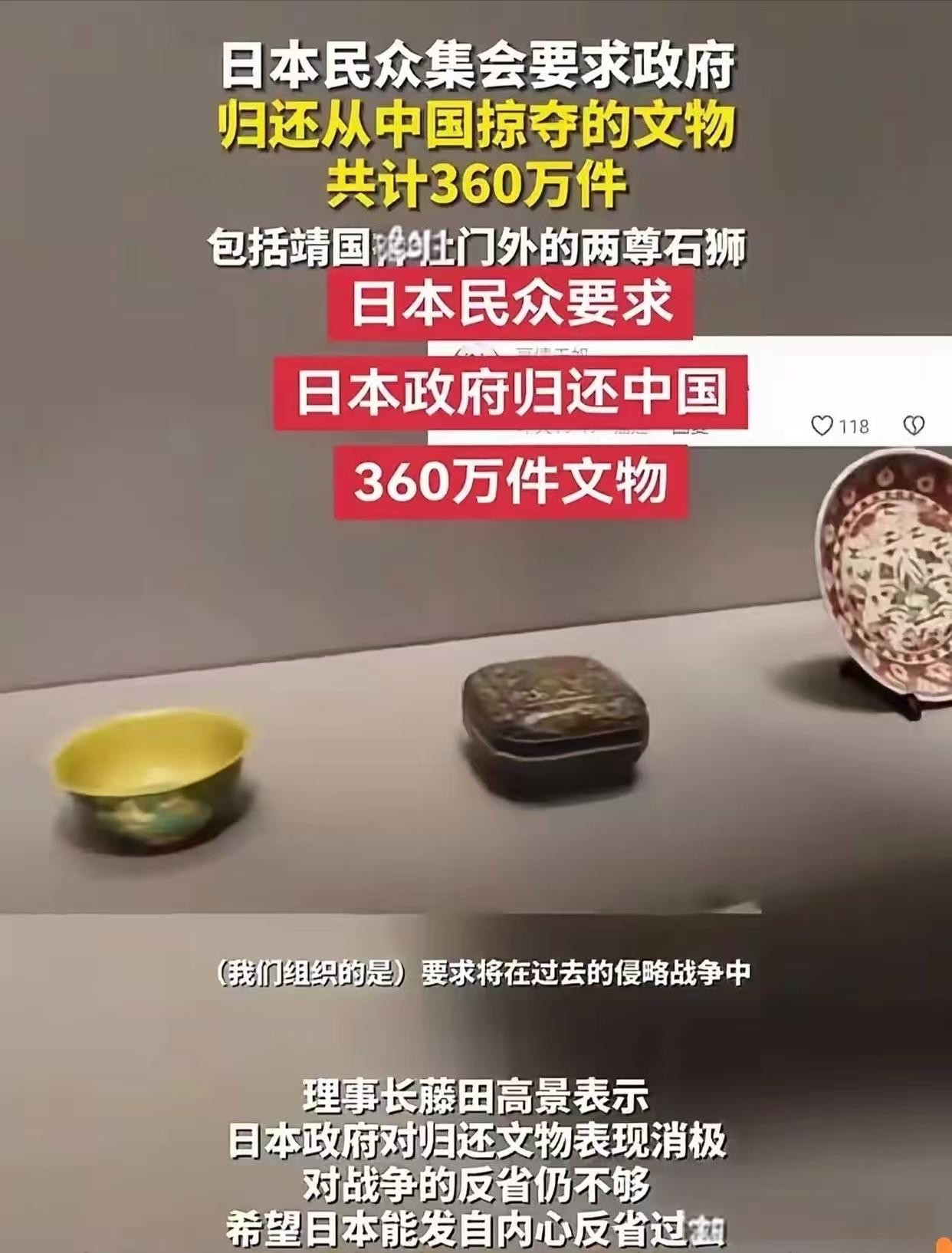 这些刻着华夏血脉的国宝,不该永远漂泊异乡!日本劫掠的360万件中国文物是时候回家了! 你敢信吗?从甲午到抗战,半个世纪里日军像强盗一样,把我们的青铜重器、书画瑰宝、碑刻典籍,一车车、一船船运回日本。官方统计,被掠文物1879箱、超360万件,741处古迹被毁;日本上千座博物馆里,躺着近200万件中国文物,多数沾满侵略的血污。更让人心寒的是,不少中国国宝被日本贴上“本土国宝”标签,堂而皇之炫耀,仿佛掠夺成了荣耀。 同为二战战败国,德国主动归还文物;美、意、澳多年来返还数千件中国流失文物,唯独日本,几十年几乎零主动归还。他们用时效法、来源模糊当挡箭牌对铁证视而不见,对正义呼声充耳不闻。 2026年,中方拿出368份史料,锁定唐鸿胪井碑等被掠铁证,发出180天归还通牒!这不是请求,是公理与正义的底线。曾伯克父青铜组器跨海归家,证明只要坚持,国宝终能叶落归根。 文物不会说谎,每一片瓷、每一笔墨、每一方碑,都在诉说:我来自中国。掠夺来的珍宝,撑不起文化自信;拒不归还,抹不掉历史罪责。 正义不会缺席,国宝必须回家!支持文物归还的,请点亮在看、转发扩散,让世界听见我们的声音:日本,把华夏瑰宝还给中国!