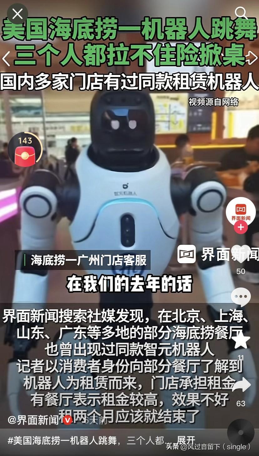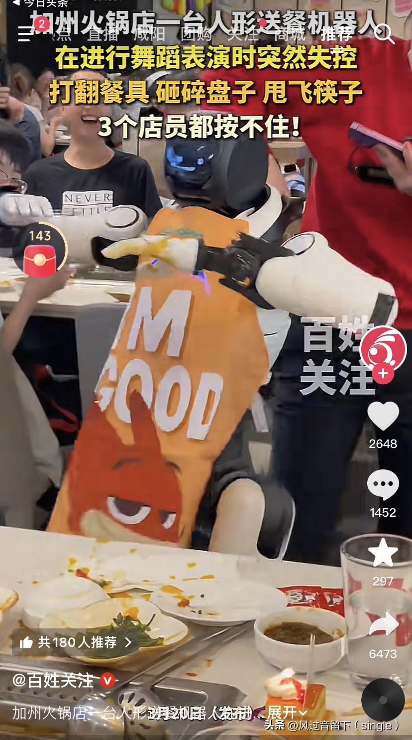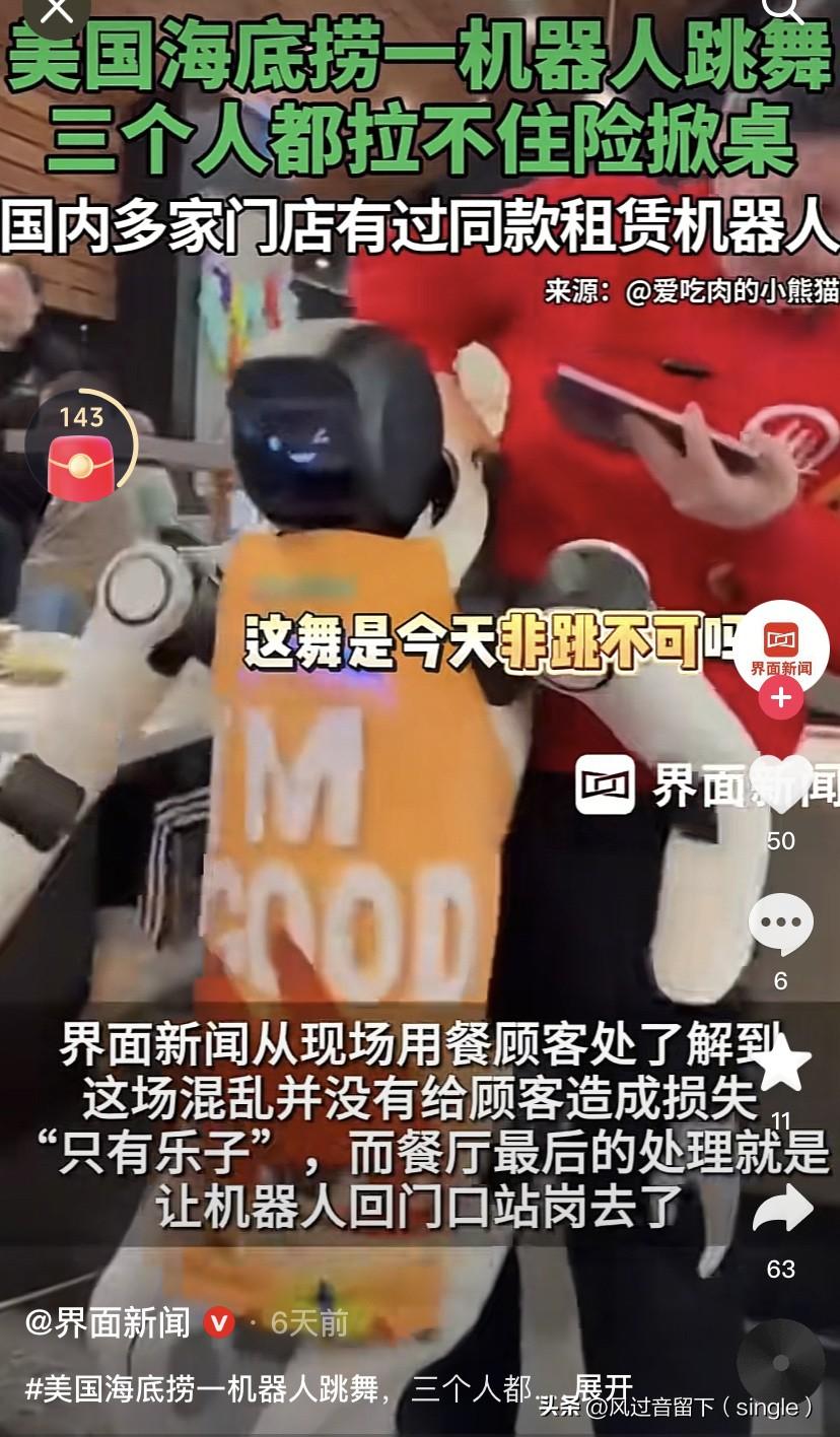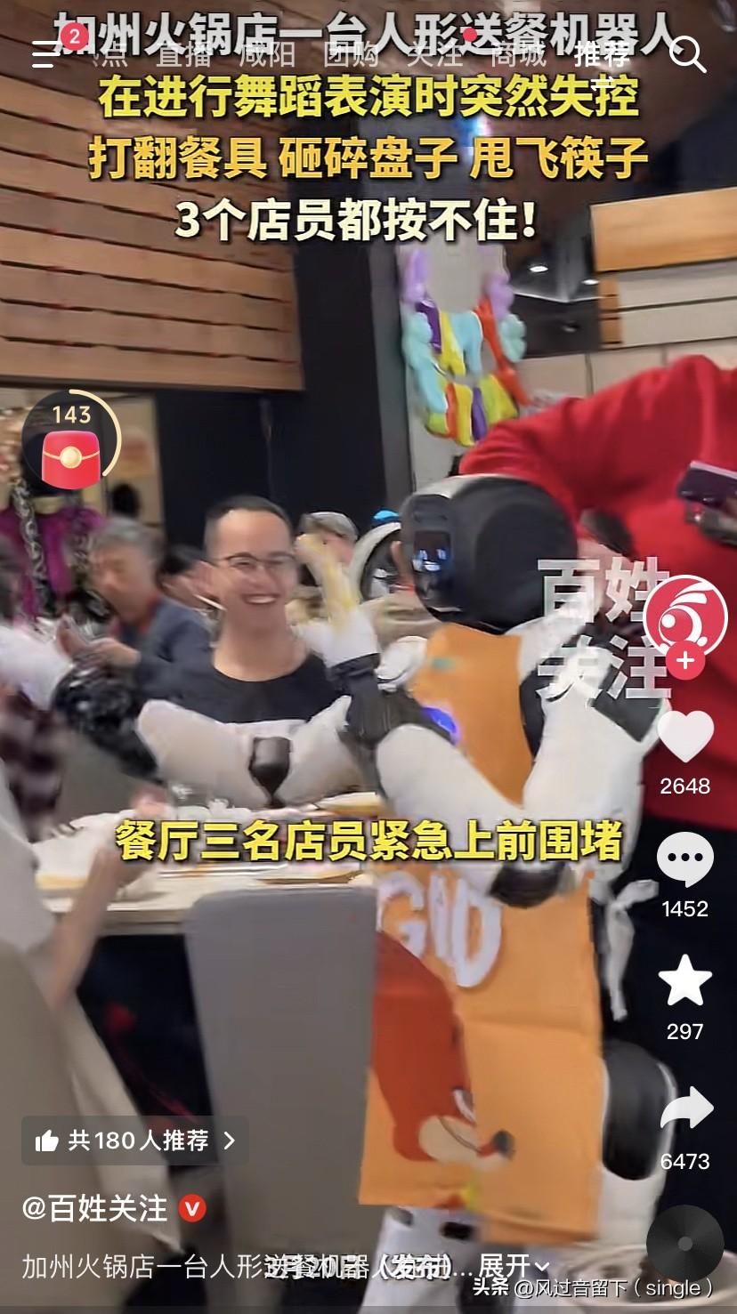 机器人都受不了被剥削,开始反抗了! 美国当地时间3月19日,加州一家海底捞火锅店一个人形送餐机器人在进行舞蹈表演时突然失控,砸烂餐具,甩飞筷子,砸碎盘子! 餐厅里三名店员赶紧上去围堵,费了好大劲才把这个机器人按住了! 还好机器人没有给顾客造成损失,只有乐子,餐厅最后的处理结果就是在门口去站岗去! 国内好多火锅店也用过同款机器人,都是因为租金太高了,效果也不好,只租了两个月就不租了! 的确,让送饭机器人跳舞,太难为了!机器人想:你们不把我当人,把我还累死啊,让我送饭不说了,还让我跳舞,一个破班,既让我干这个又干那个!疯了!我要失控! 看到这个新闻,我有个疑问:美国加州,里面怎么都好像东亚人的面孔?怎么看不到美国人的面孔?